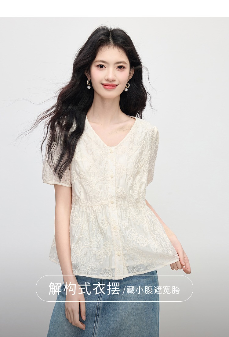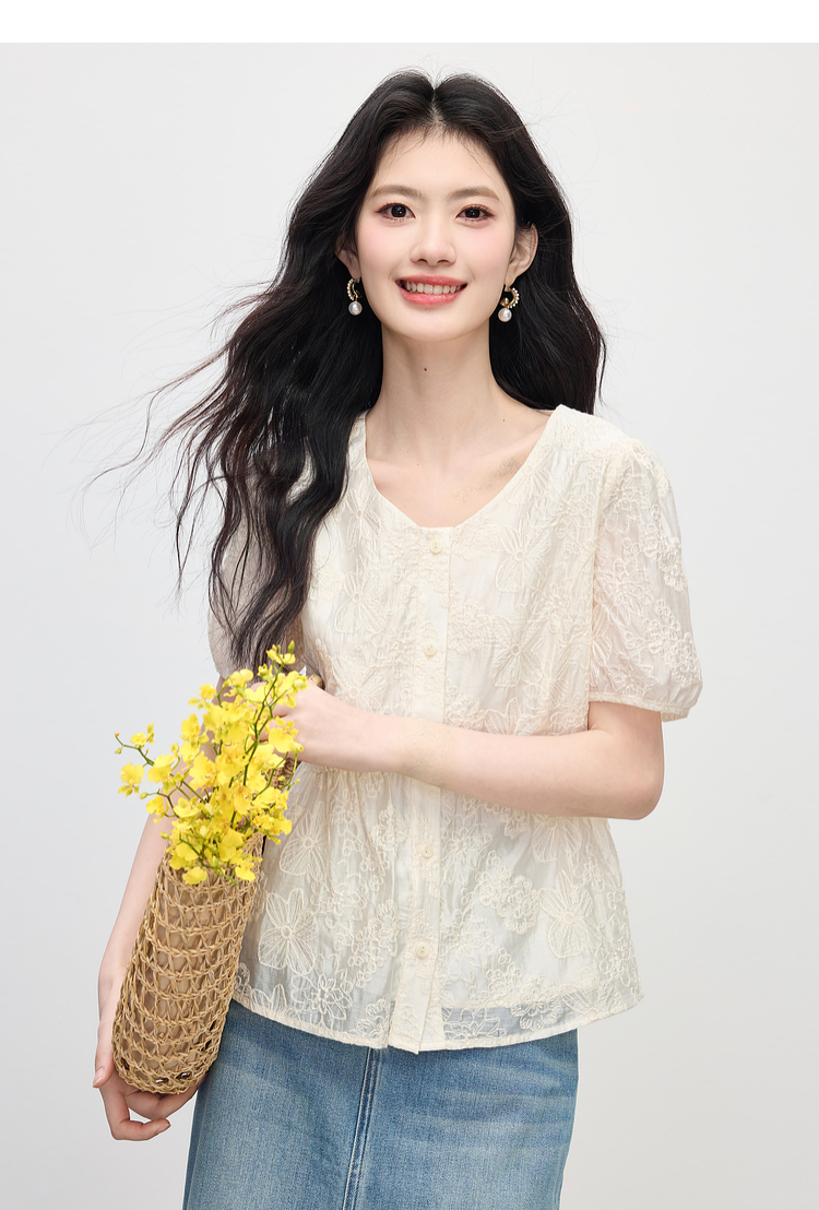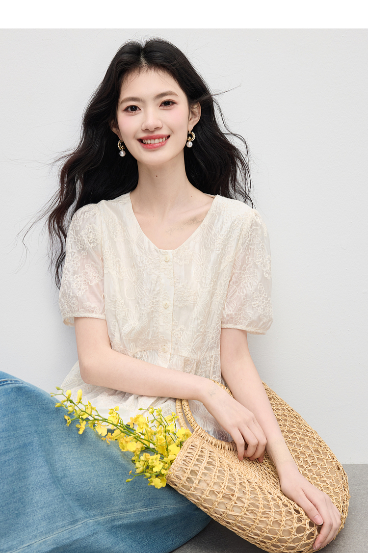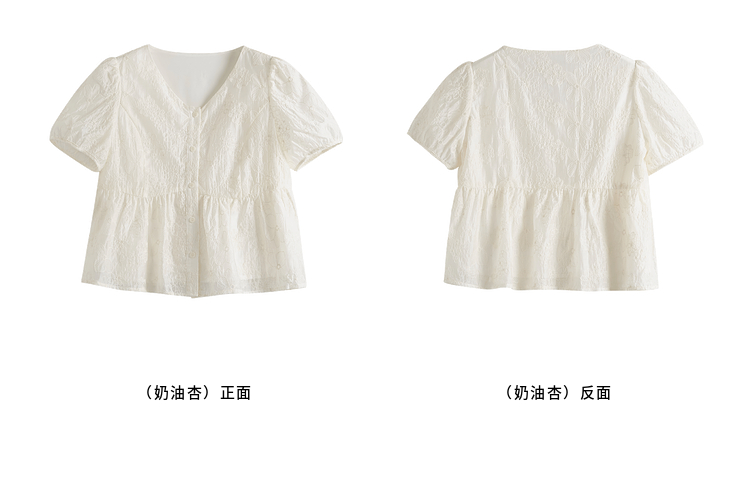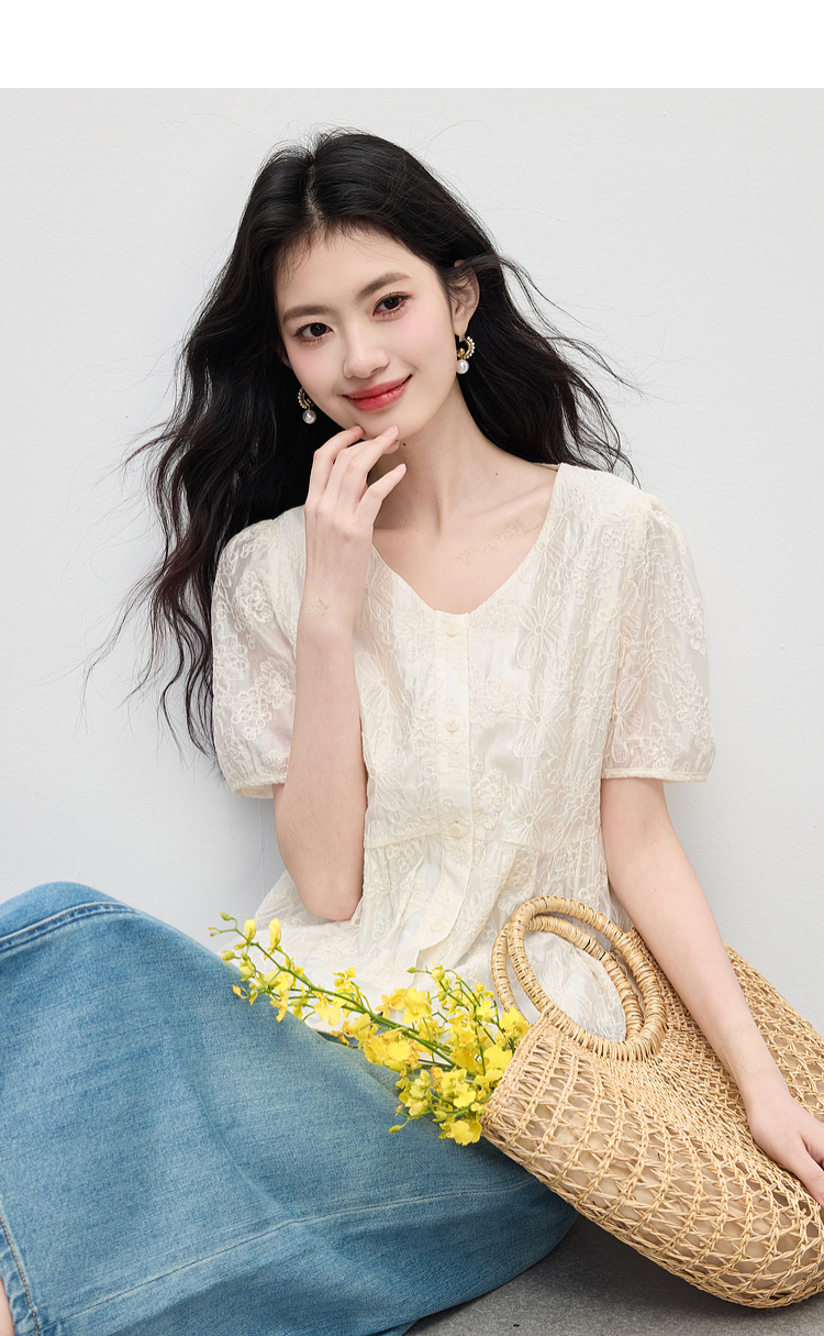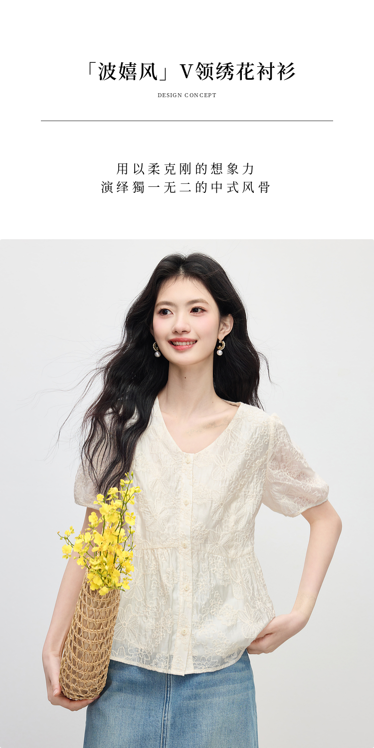 【夏日新品】熙世界莱赛尔绣花V领衬衫女夏日法式精致淡人穿搭气质泡泡袖上衣