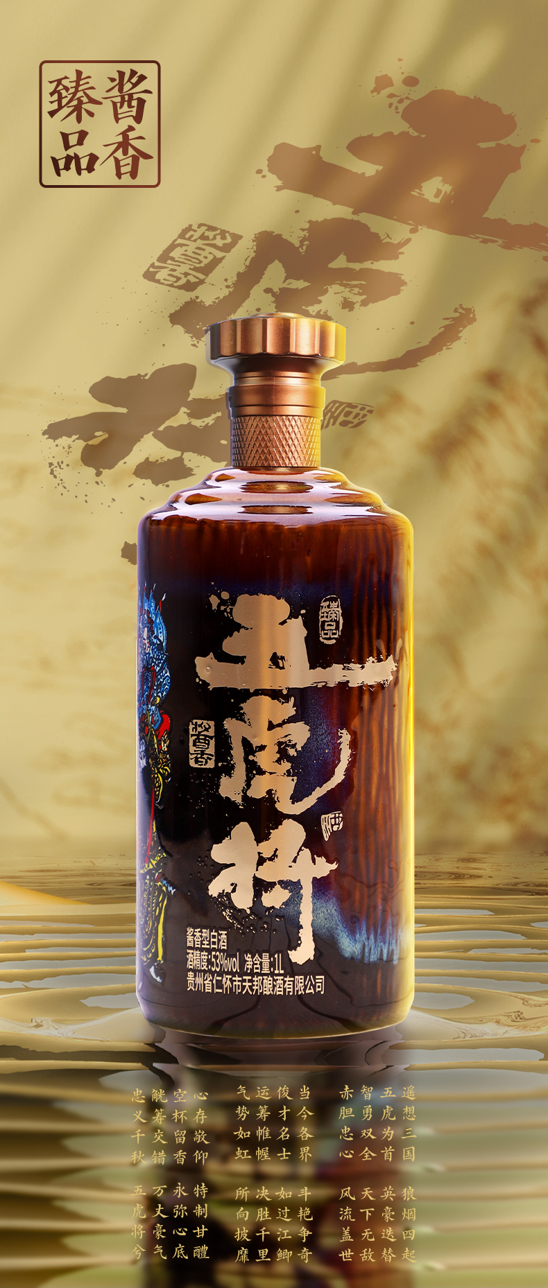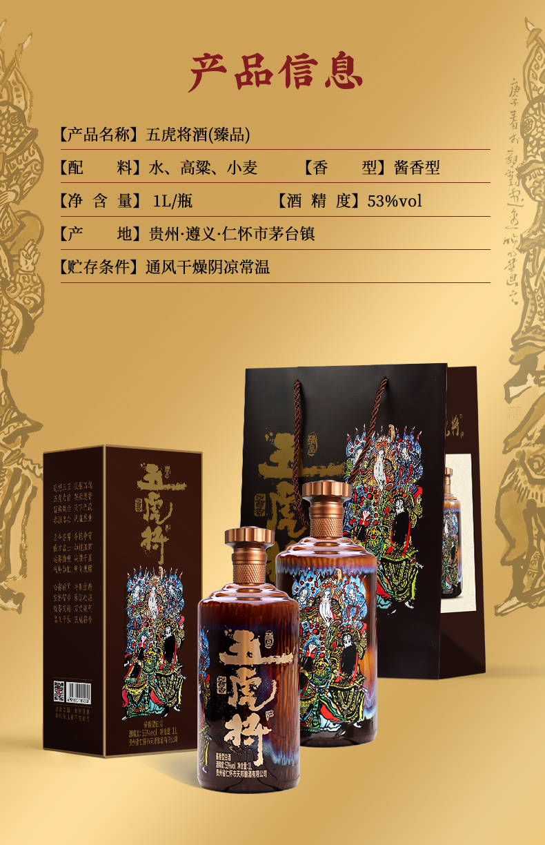 五虎将 酱香53度白酒1L单瓶礼盒酱香型纯粮食高度白酒