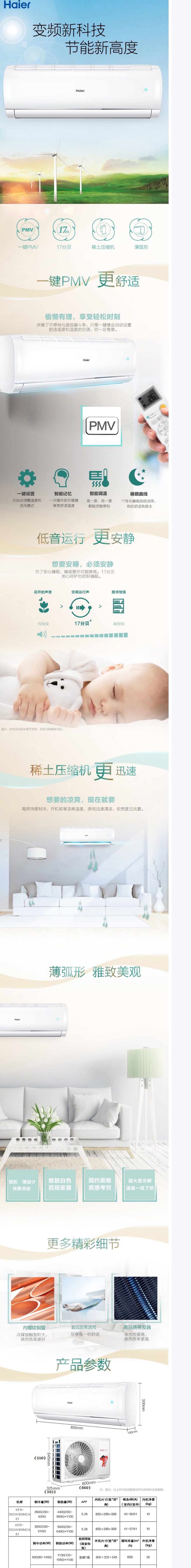 海尔 空调 KFR-35GW/BOMCA81 1.5匹 一级能效 变频冷暖 壁挂式 ABS塑料 上下扫风 键控/遥控 自清洁 智能调节