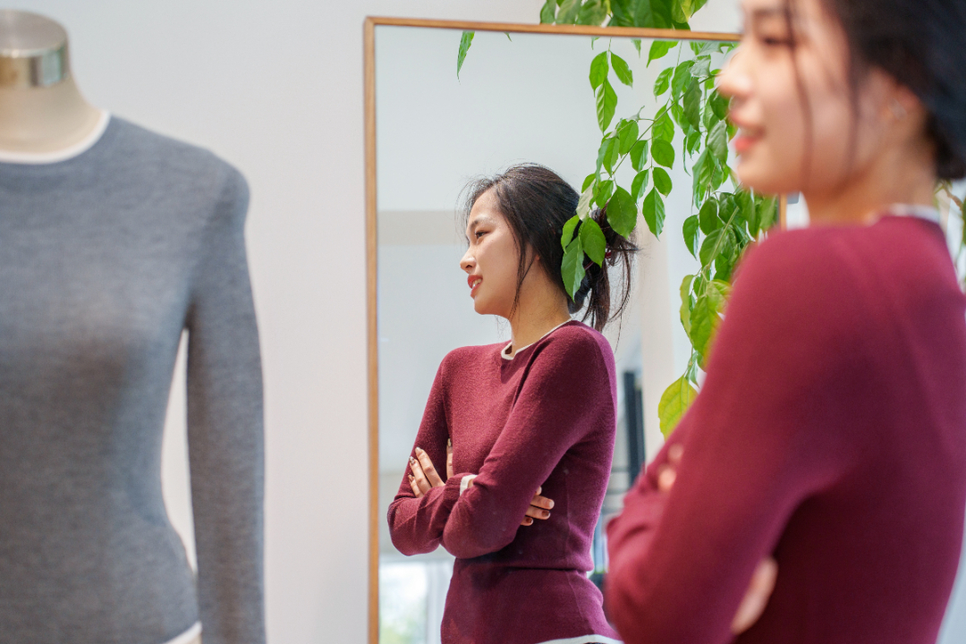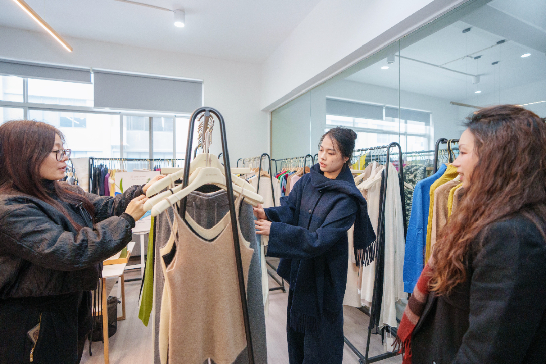 回到熟悉的领域后,她拿起画笔,设计了品牌logo,带领团队设计了数十款2024年冬季的爆款羊绒衫。下车间、跑渠道、谈合作……她亲力亲为,“前天是台湾的一家商场找过来了,他看到我们的生产流程,当天就签了合同。昨天是苏州的工厂代表过来……”