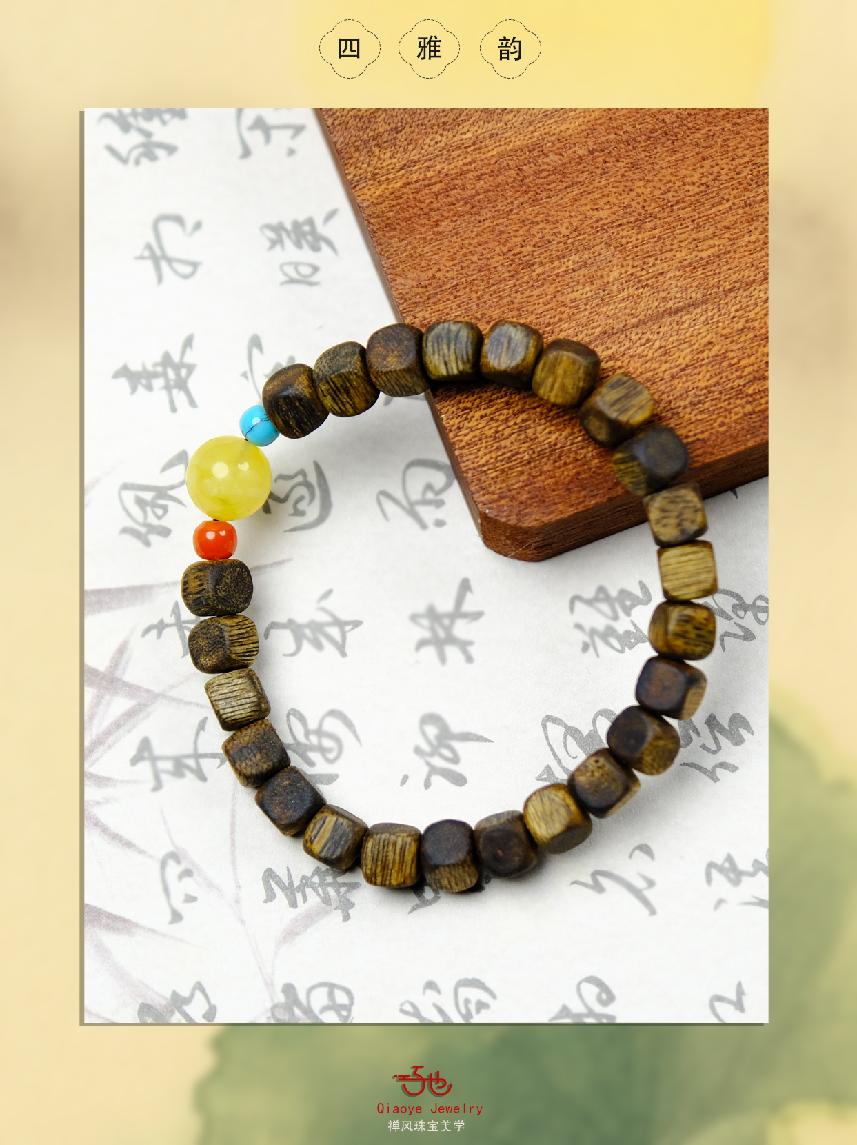 “四雅韵”取奇楠沉香为骨,其韵如《香乘》记载的“清、甜、凉、醇”四味俱全;波罗地海蜜蜡为肌,色若陆羽煮茶时瞥见的晚霞;原矿松石作魂,蓝如《千里江山图》中未干的石青;川南红为魄,艳似薛涛笺上未褪的胭脂痕。四宝相逢,恰似宋徽宗文房里的一场雅集——沉香是案头烟缕,蜜蜡如古琴包浆,松石似砚中宿墨,南红恰似印泥初拓。