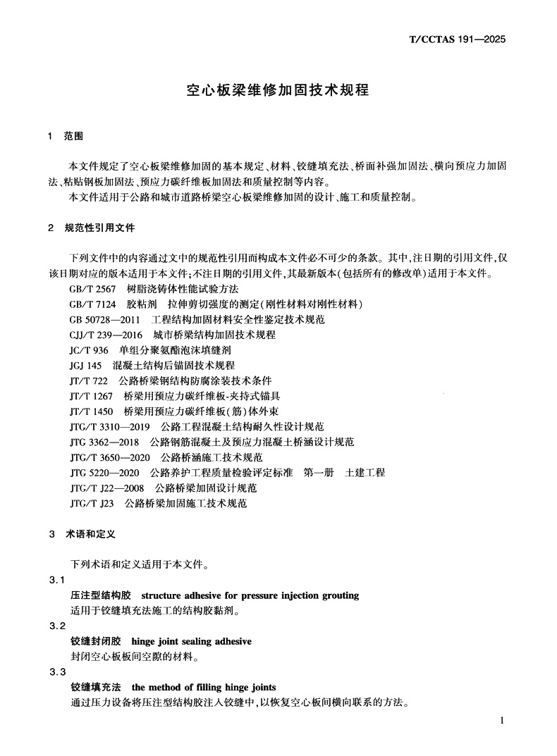 书名:空心板梁维修加固技术规程T/CCTAS 191—2025
