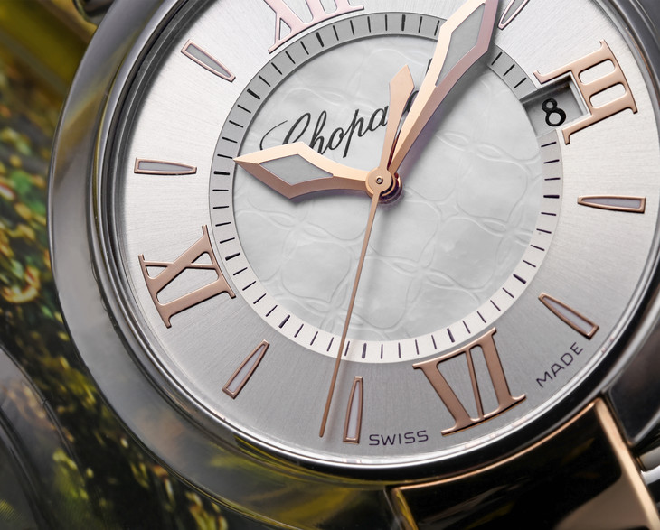 镜面材质 | 蓝宝石水晶玻璃 | 表盘 | 精钢 18K玫瑰金表壳 银色调,中央珍珠母贝表盘 18K玫瑰金罗马文及条形时标 指针 日期显示 密底 |