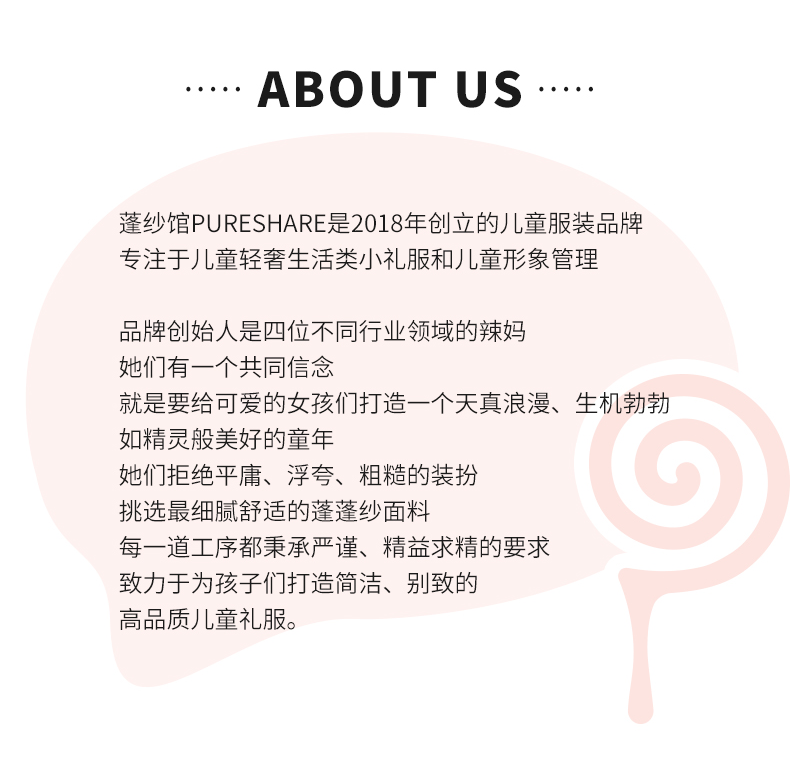 - PureShare蓬纱馆,2018年创立的儿童服装品牌,专注于儿童轻奢生活类小礼服,主张“让孩子做最独特的自己”的品牌理念,为孩子们提供时尚简洁、优雅而又不失童真的生活类礼服。