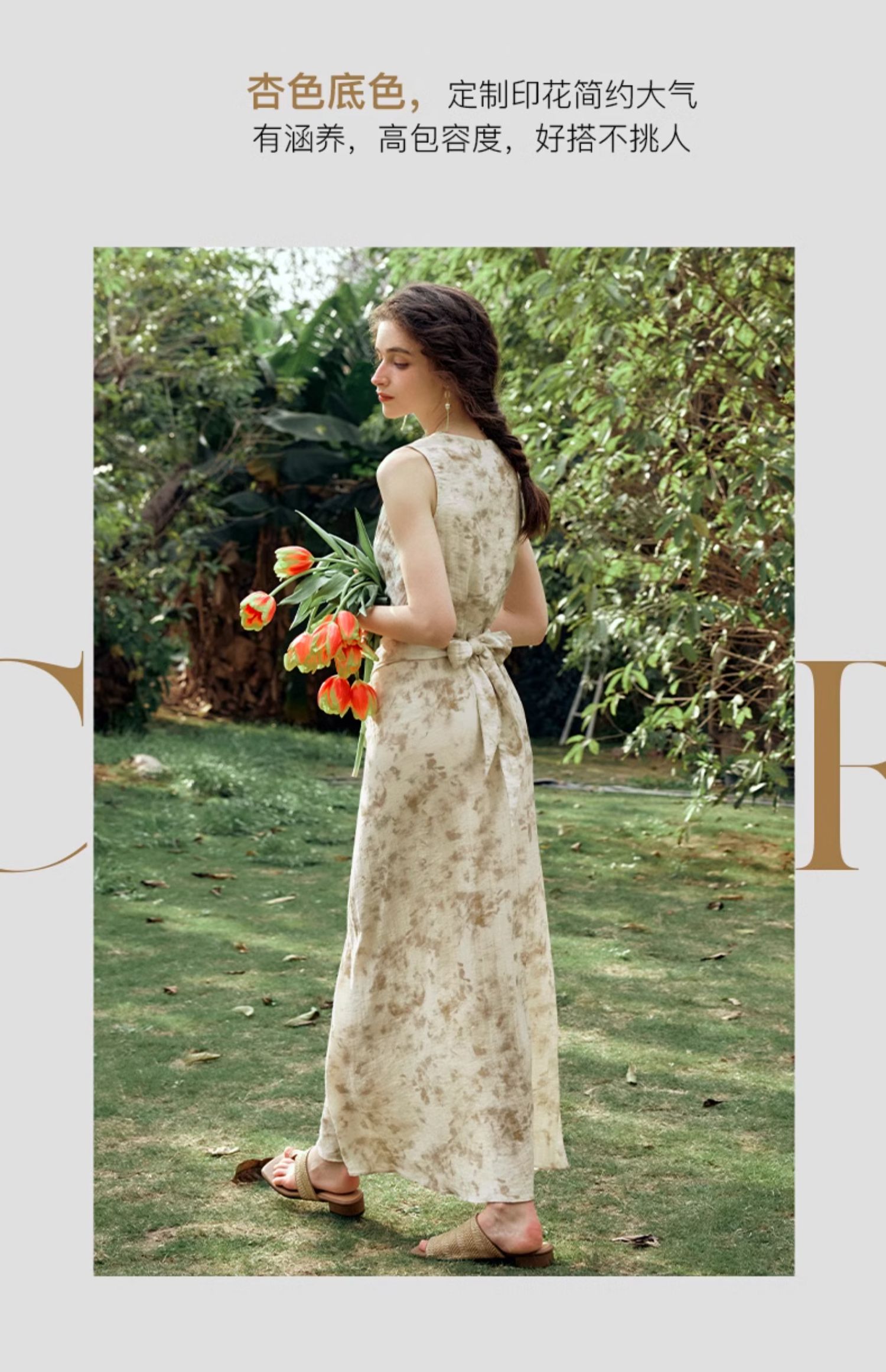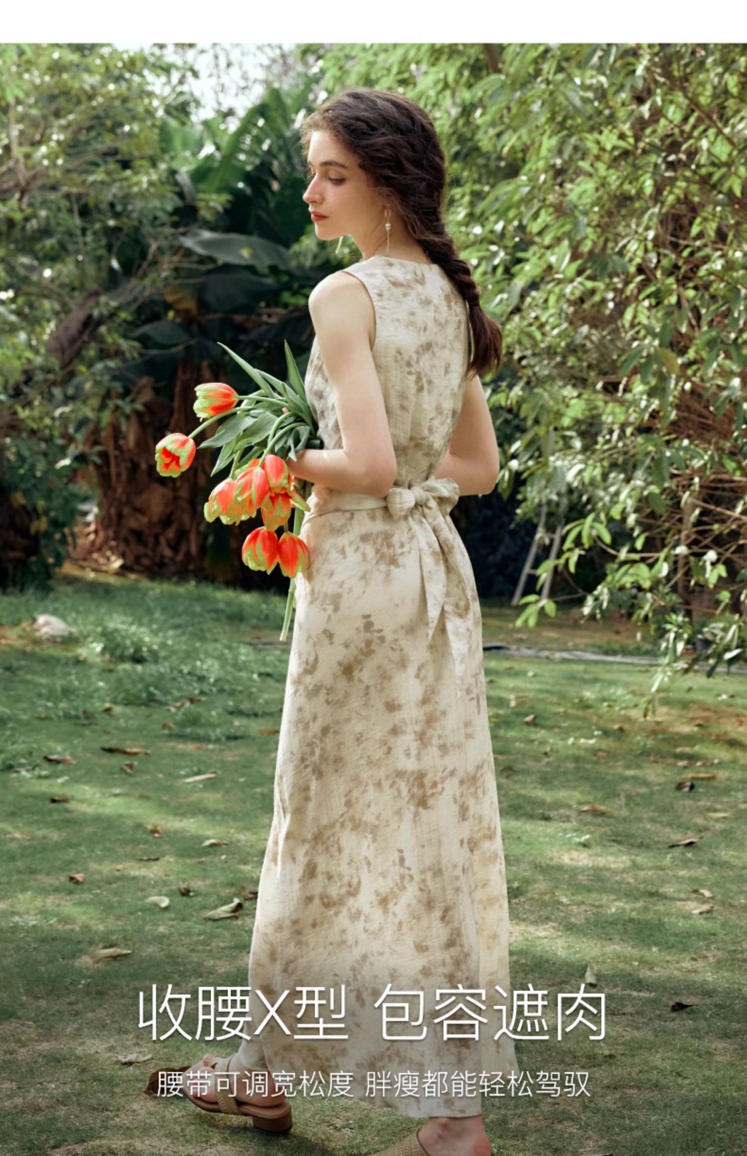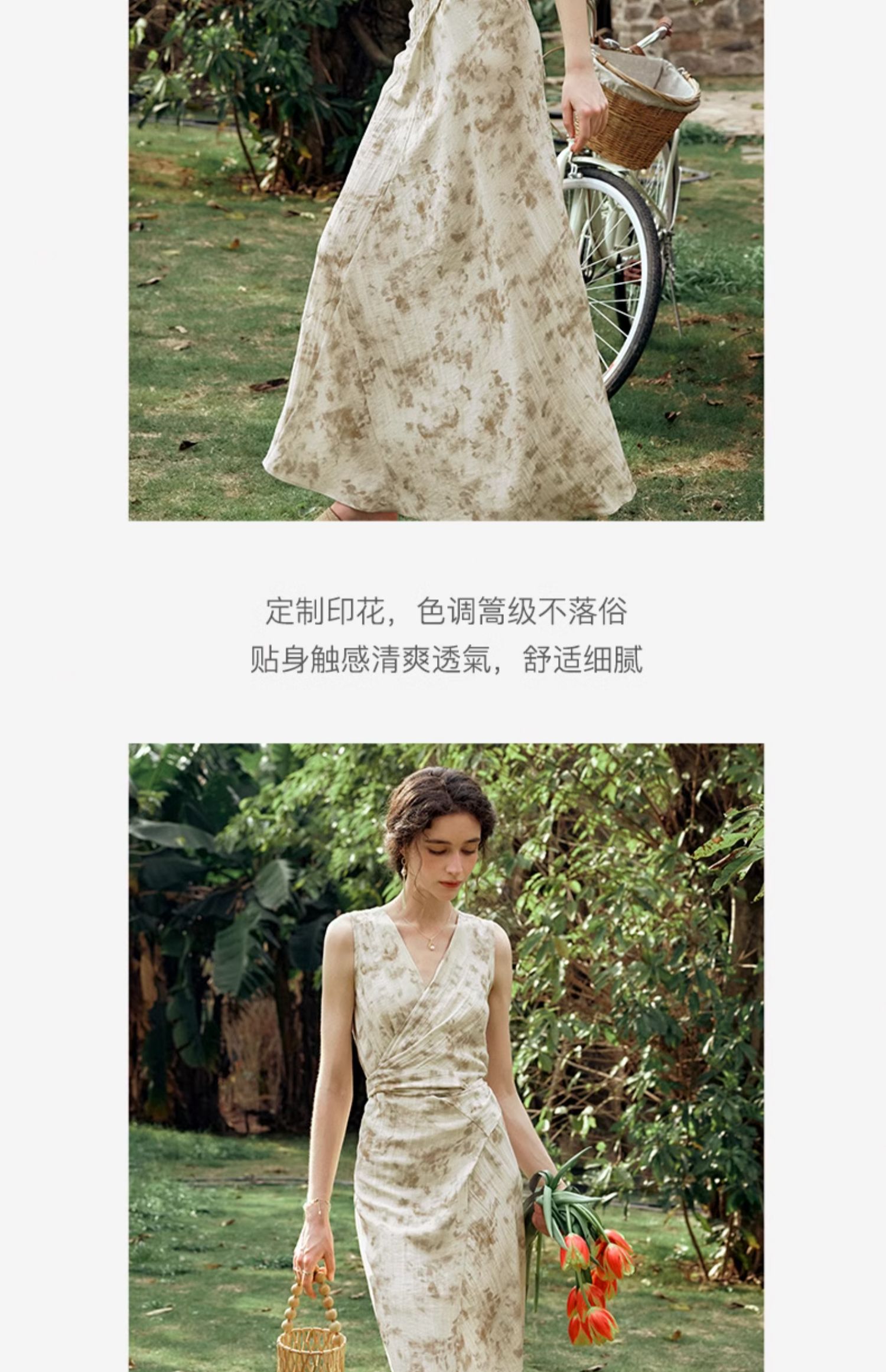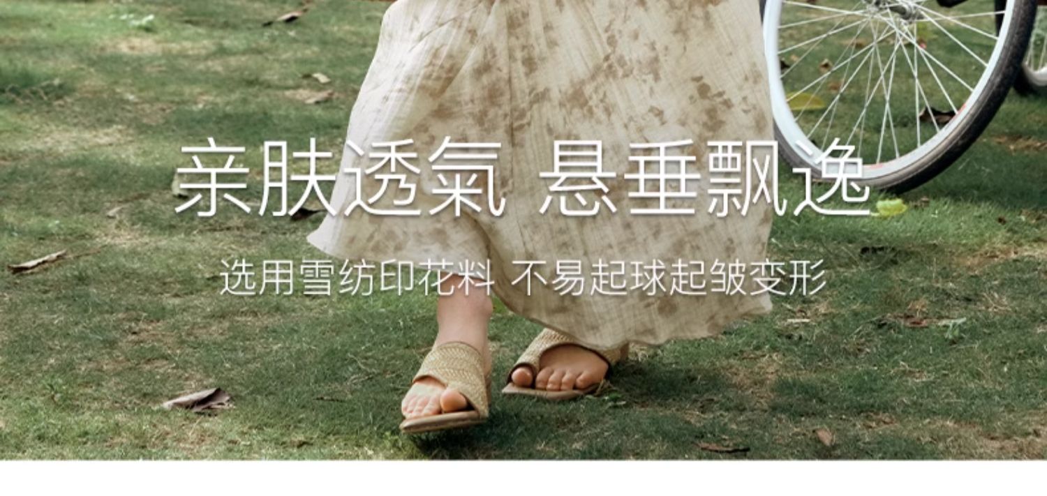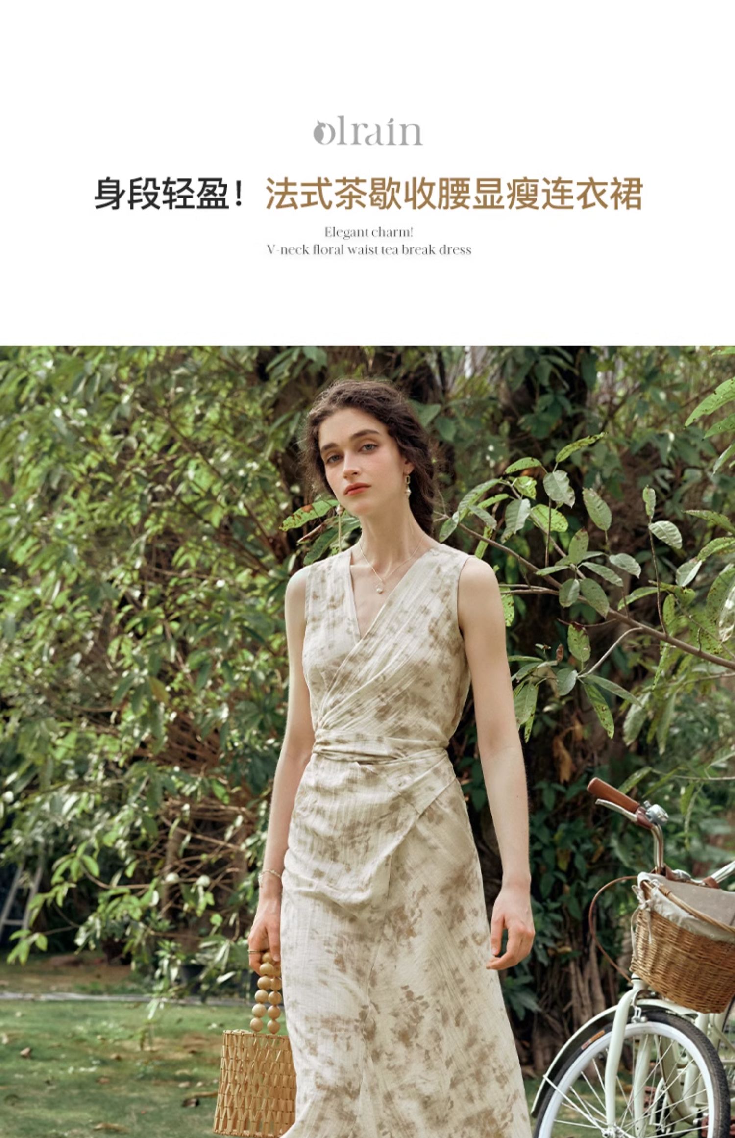 OLrain欧芮儿法式杏色连衣裙女夏季2024年新款收腰显瘦碎花中长裙