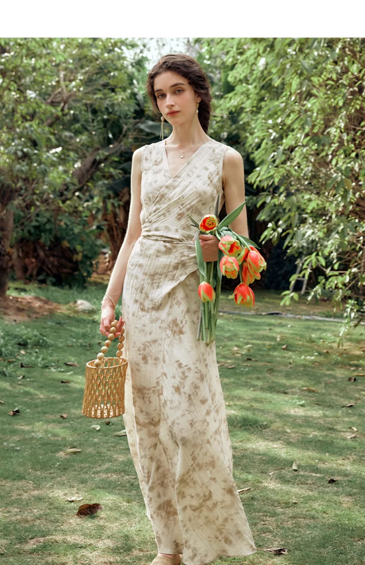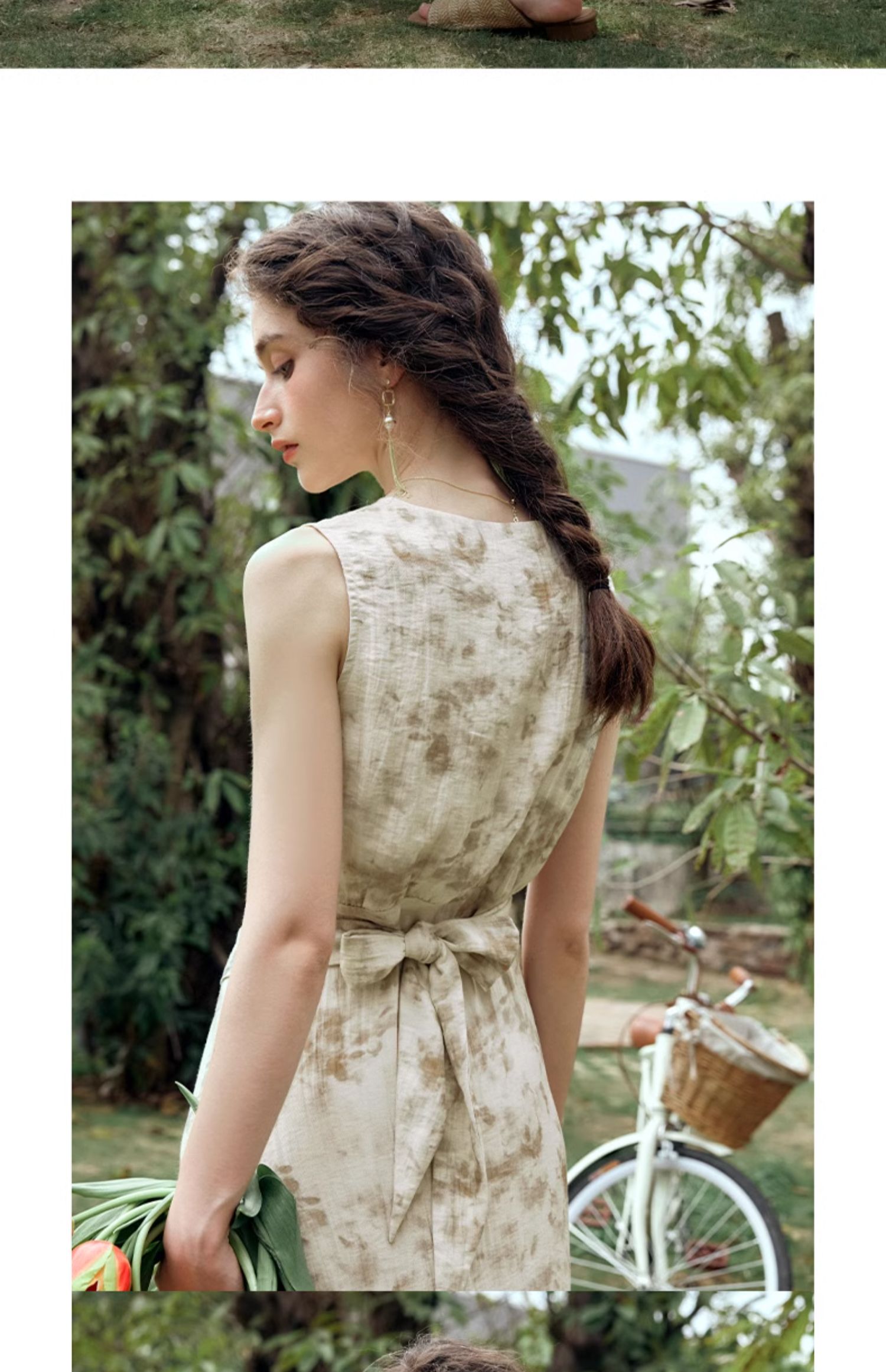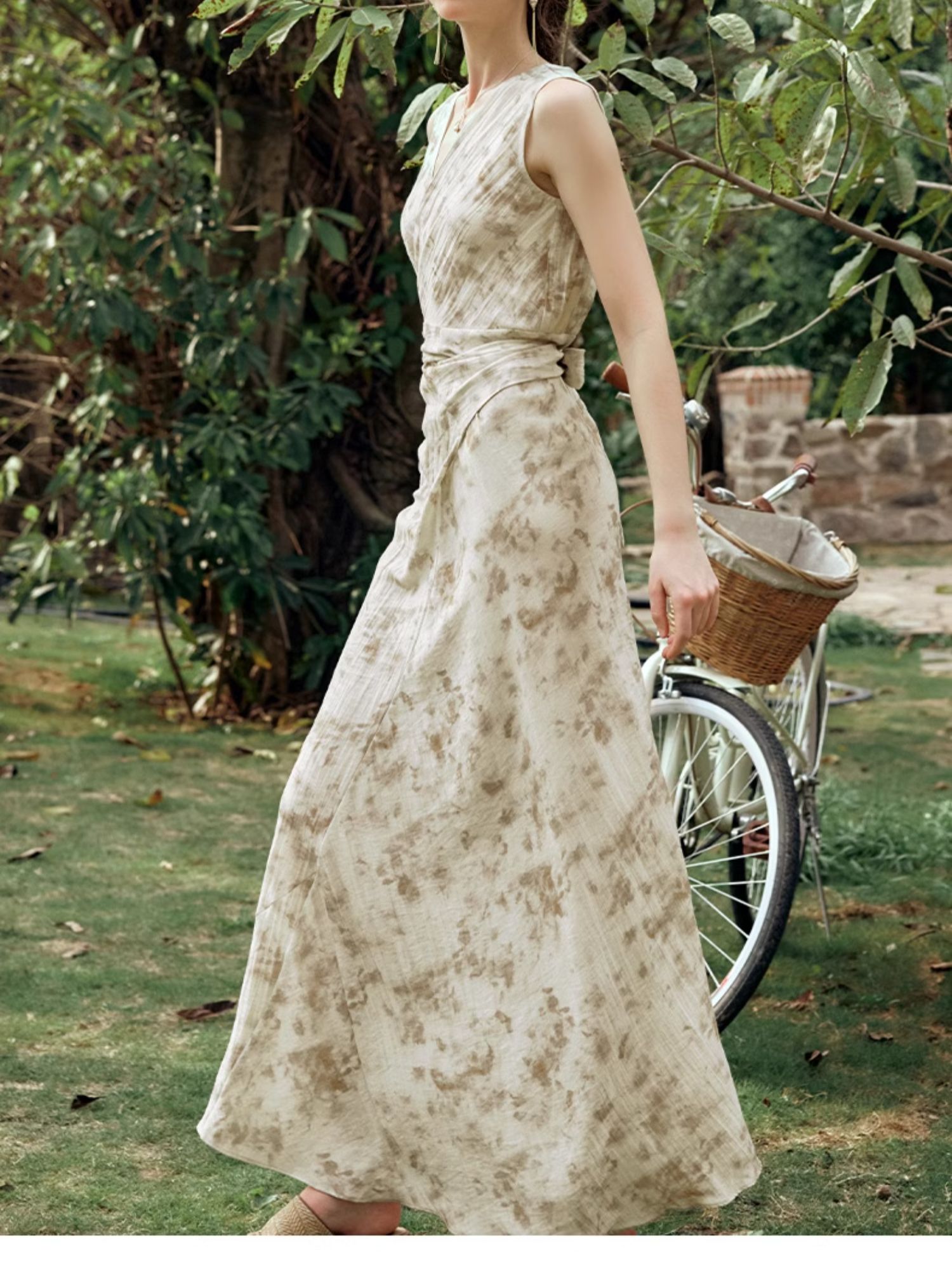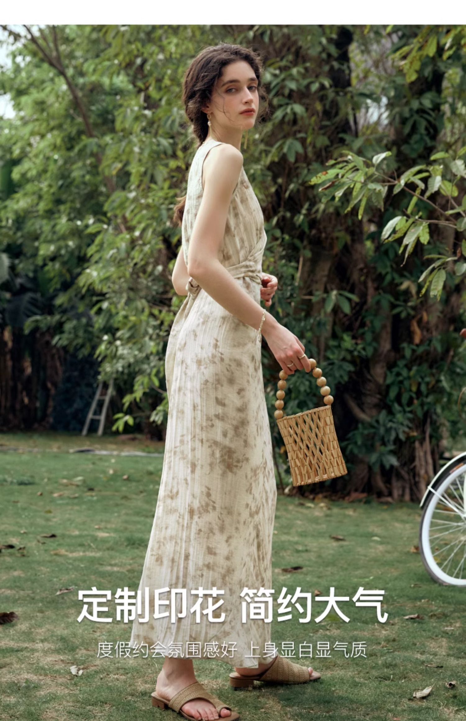 OLrain欧芮儿法式杏色连衣裙女夏季2024年新款收腰显瘦碎花中长裙