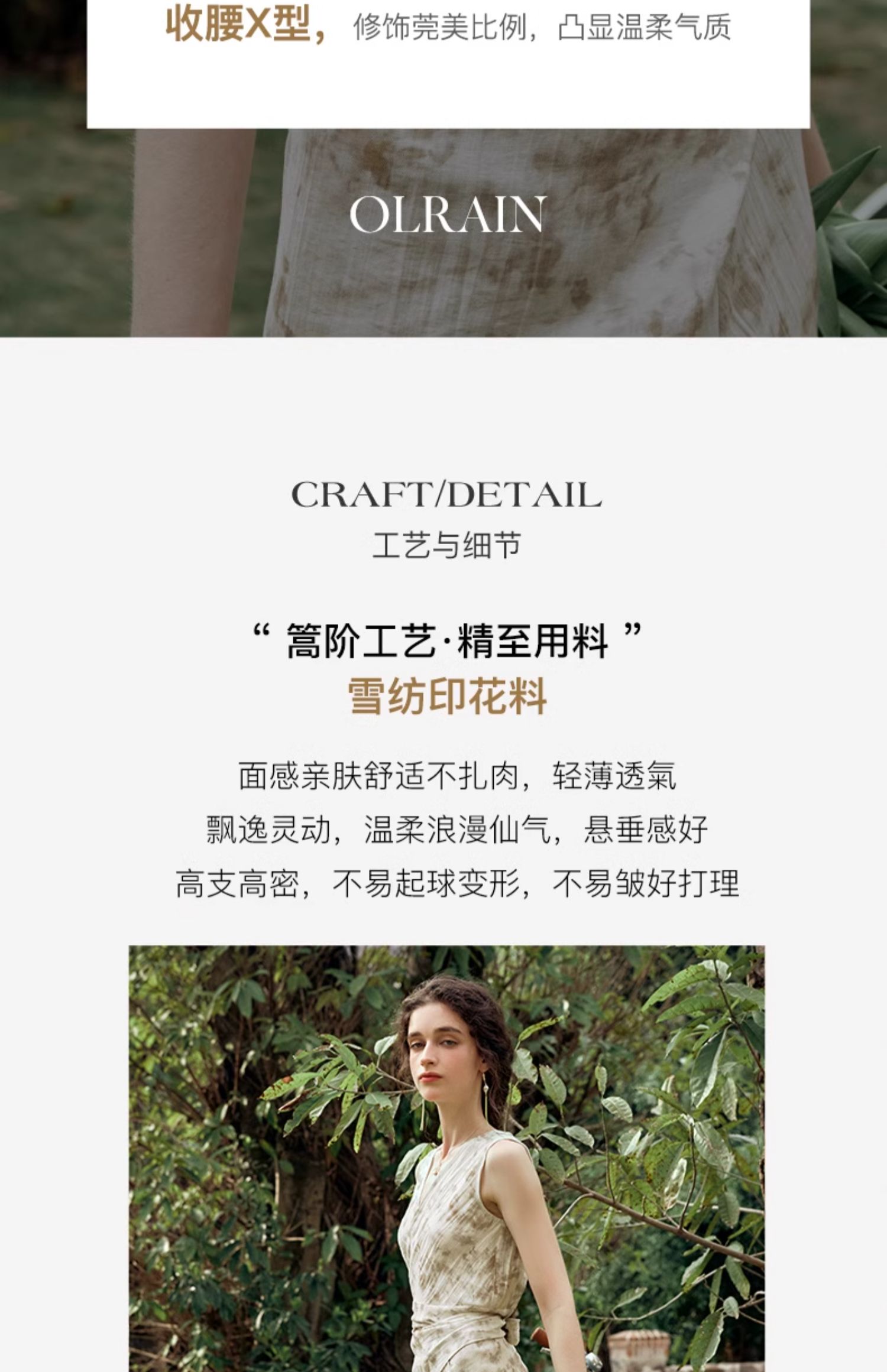 - “精致”是欧芮儿olrain品牌文化的核心,欧芮儿认为,精致的女人,不但要外在动人,更要内在迷人,内外兼修,有魅力、有气质、有内涵,自信而不自傲,优雅而不矫揉,自有万种风情而不轻浮,更不故作矜持。