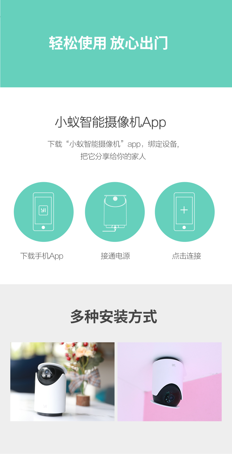 小蚁智能摄像机——随意放置任意角落,通过手机或平板,随时随地视频观察家中情况。即使不在家,也可随时进行双向语音通话,远程与家人互动,抓拍欢乐瞬间,不错过任何精彩时刻。