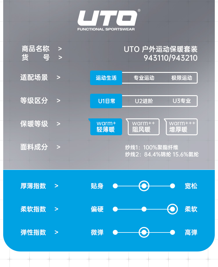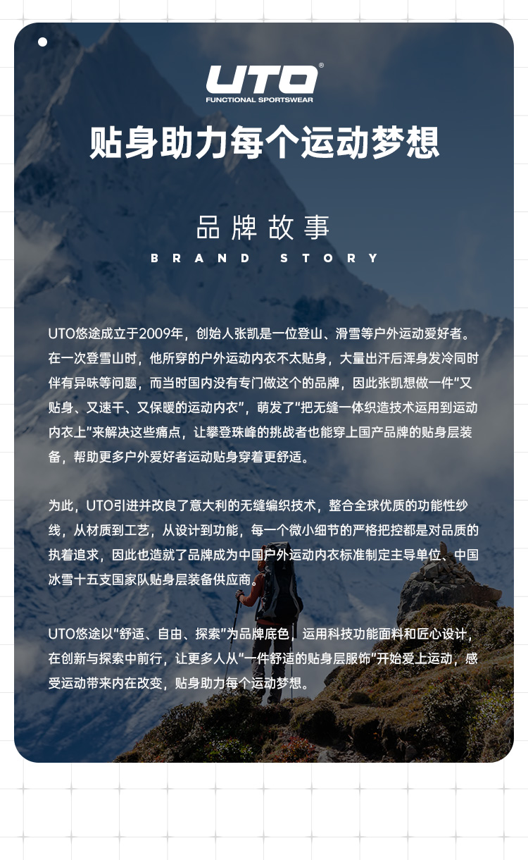 - UTO悠途潜心于贴身运动装备的研发、设计和生产。从纤维到组织,从设计到工艺,在无缝贴身运动装备领域,树立国内标杆。 UTO着力于品牌互联网化,不断采集大量运动数据,为跑步、健身、滑雪等不同类型的运动爱