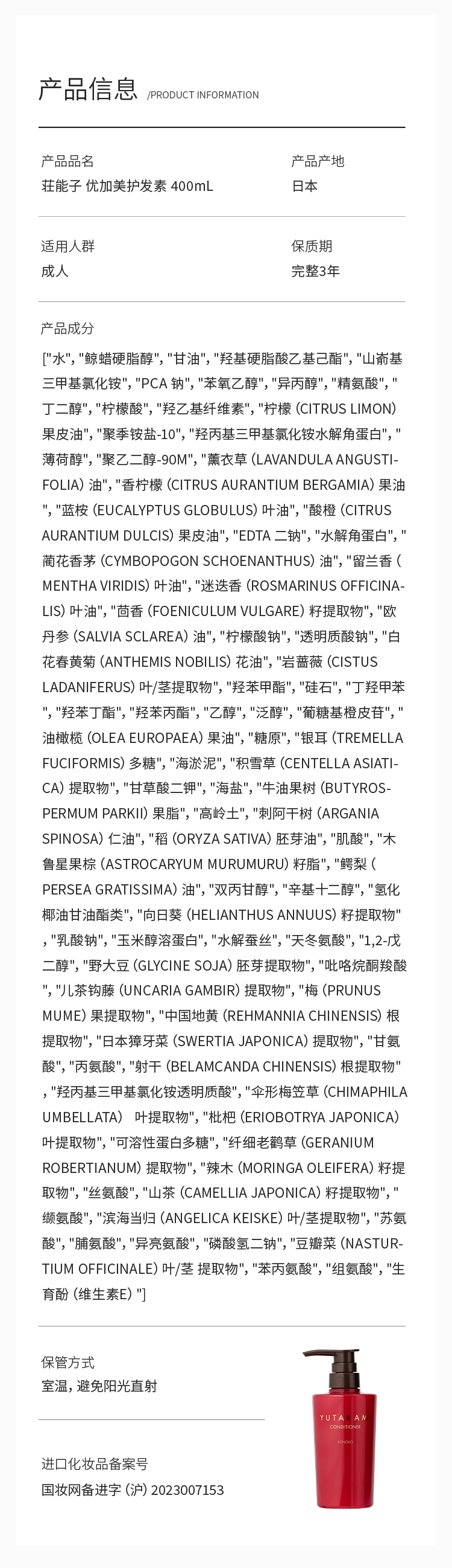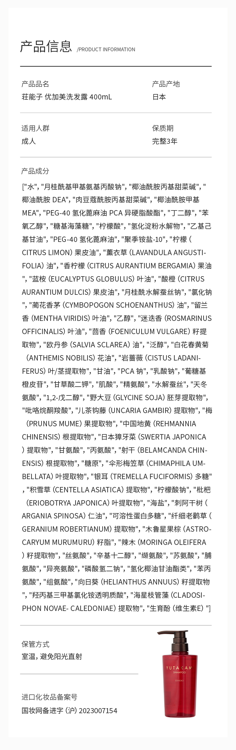 日本进口 SONOKO 荘能子 YUTAKAMI洗发水/护发素 400mL 【下单有礼】
