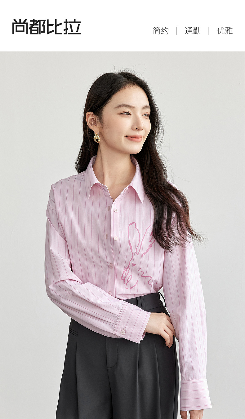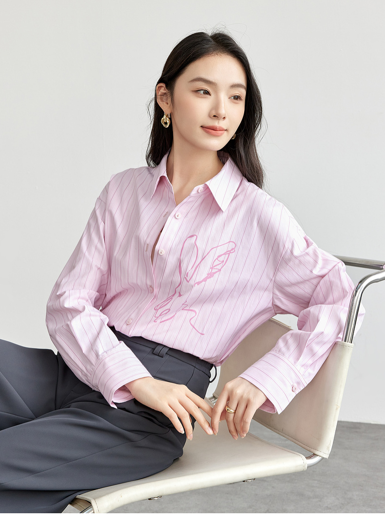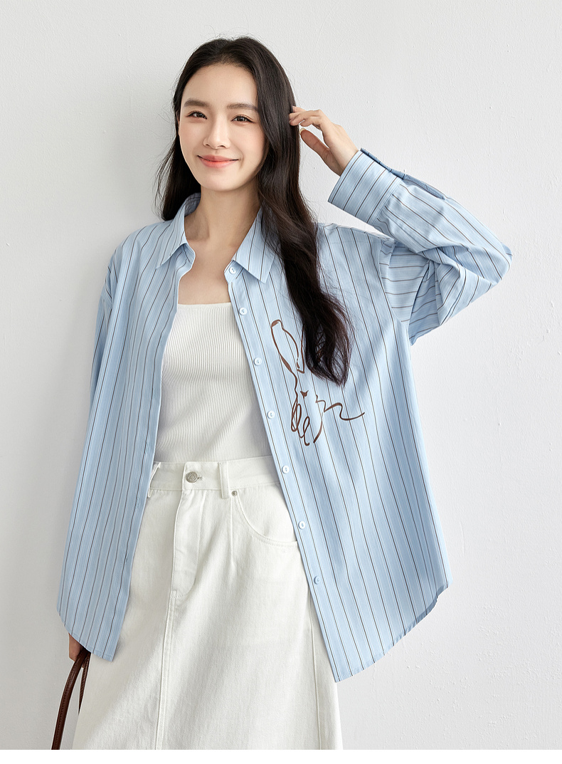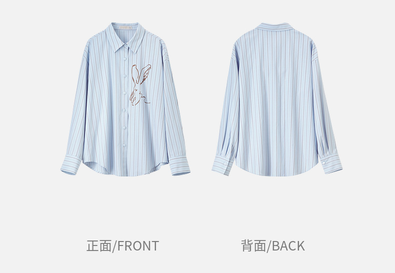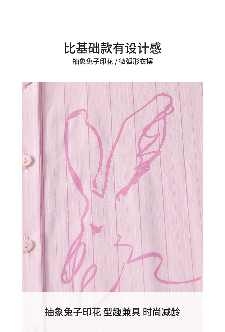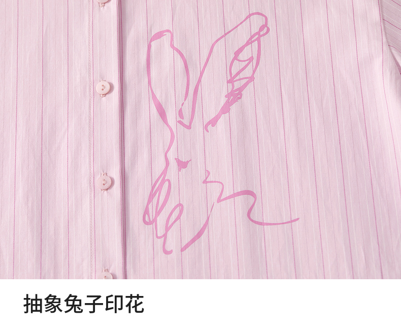 【内购】舒适通勤棉质条纹衬衫女落肩袖抽象兔子印花宽松显瘦上衣-57965