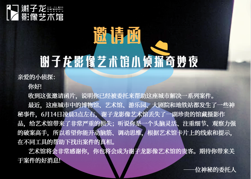 孩子们将收到一份神秘人的邀请函,化身为一位侦探,与其他侦探一起接受挑战,破解一个个令人费解的谜题。活动将通过丰富的角色扮演、逻辑推理和剧情互动环节,让孩子们身临其境地体验侦探工作的紧张刺激与智慧较量。为艺术馆破译“消失”的天价艺术作品,率先破案能手可获得谢子龙影像艺术馆定制的特有徽章。