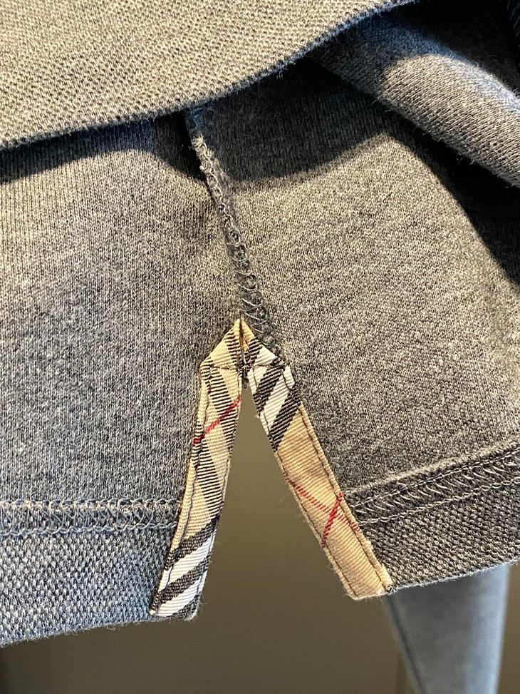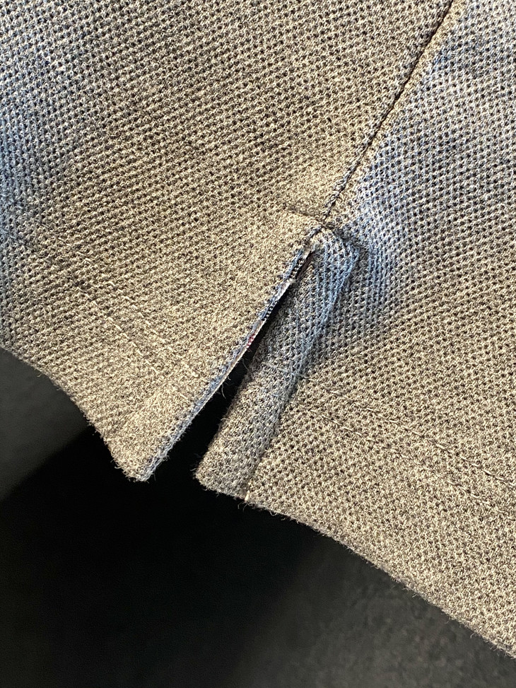 🔺下摆的小开叉设计 既有美观性又有实用性 能更加包容人体蹲下起立的活动空间 避免下摆紧绷 🔺内里格纹条包边,能包裹住下摆须边 还能起到加固的作用