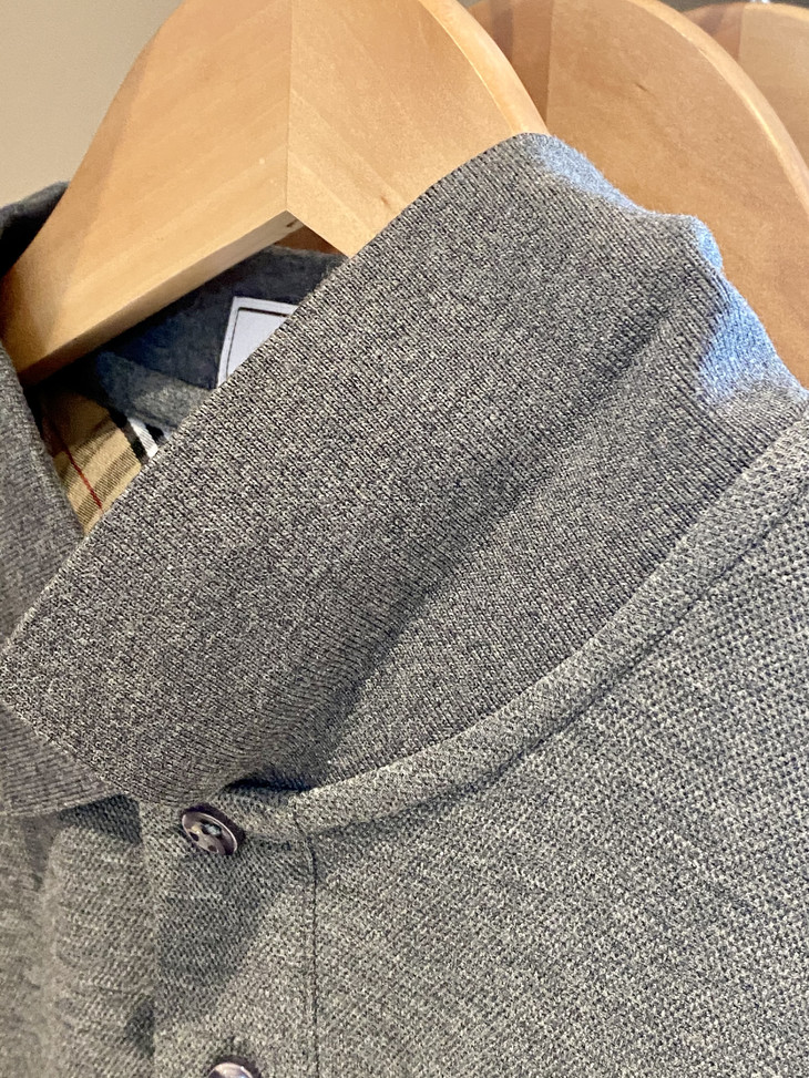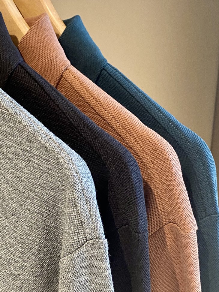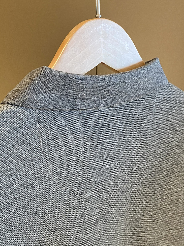 18针工艺,在高密针数的基础上 增加了保型后整工艺,很好地稳固了领型结构 四平工艺纺织出的领子密度更加平整、厚实 再加上少有的领角加固工艺 为领型给予双重保障