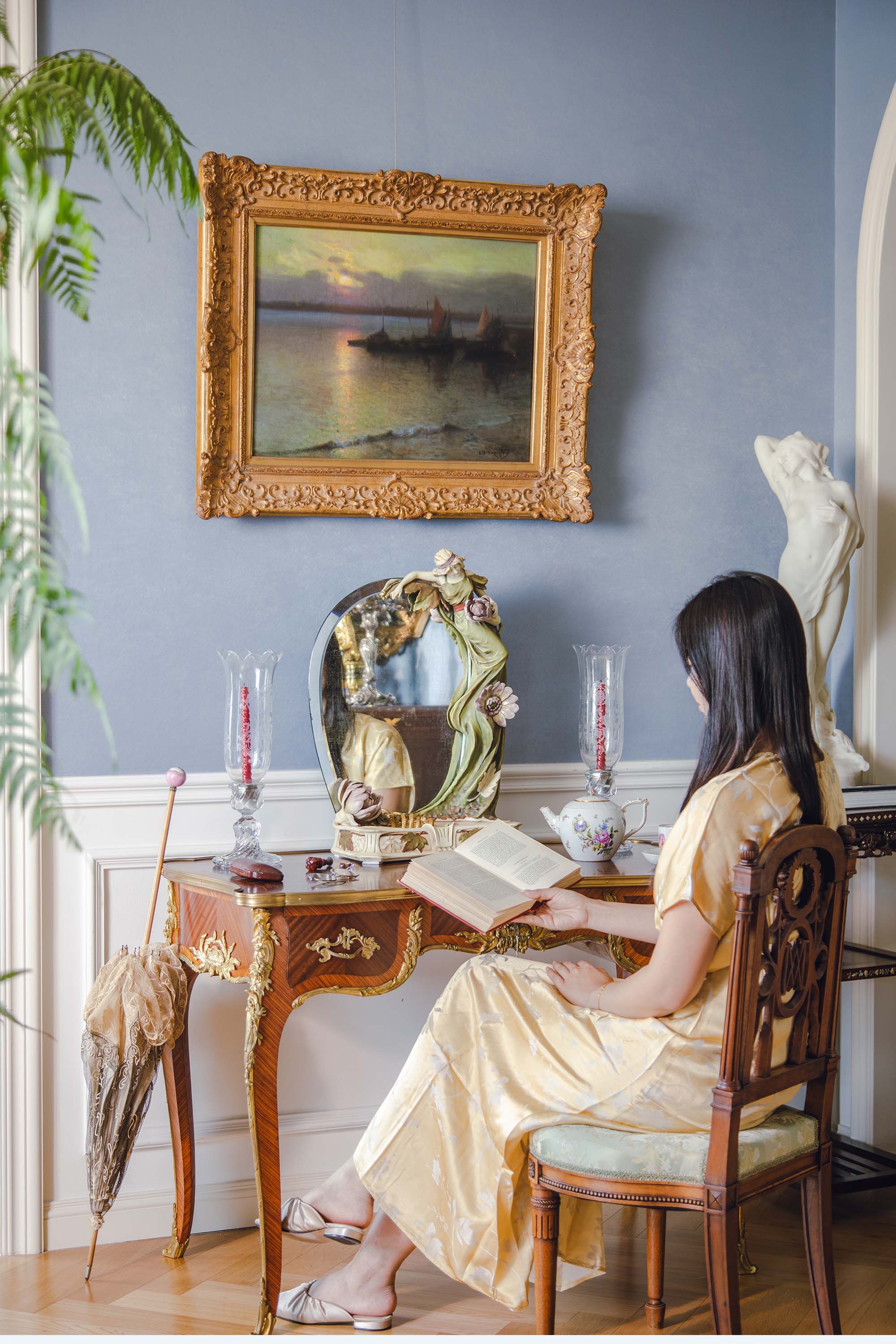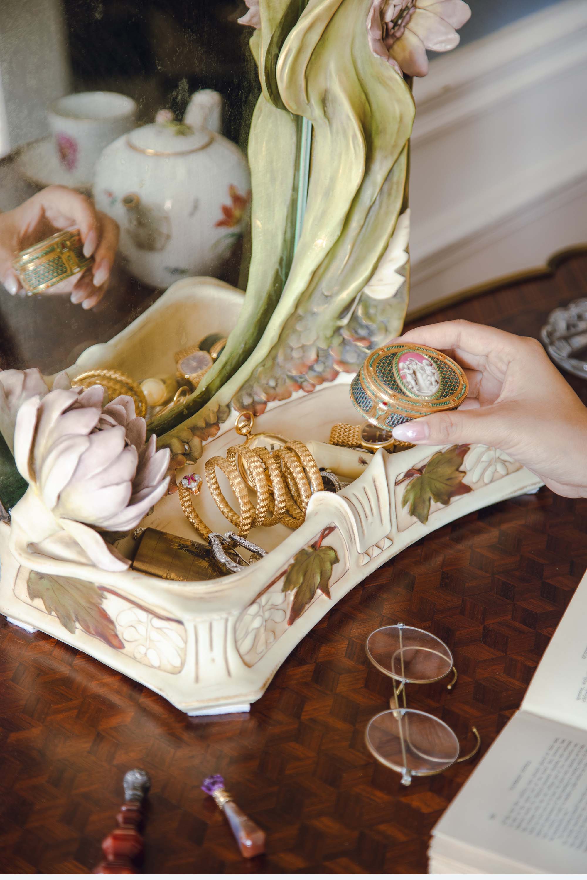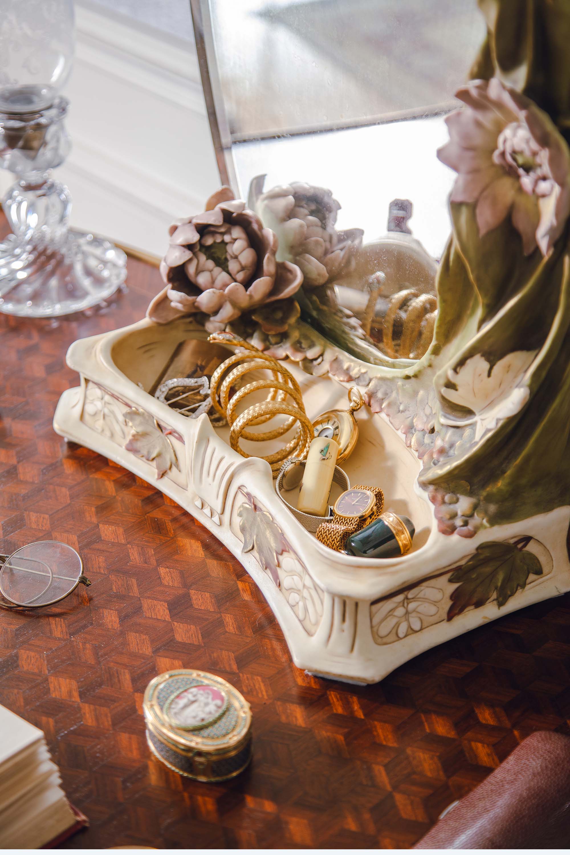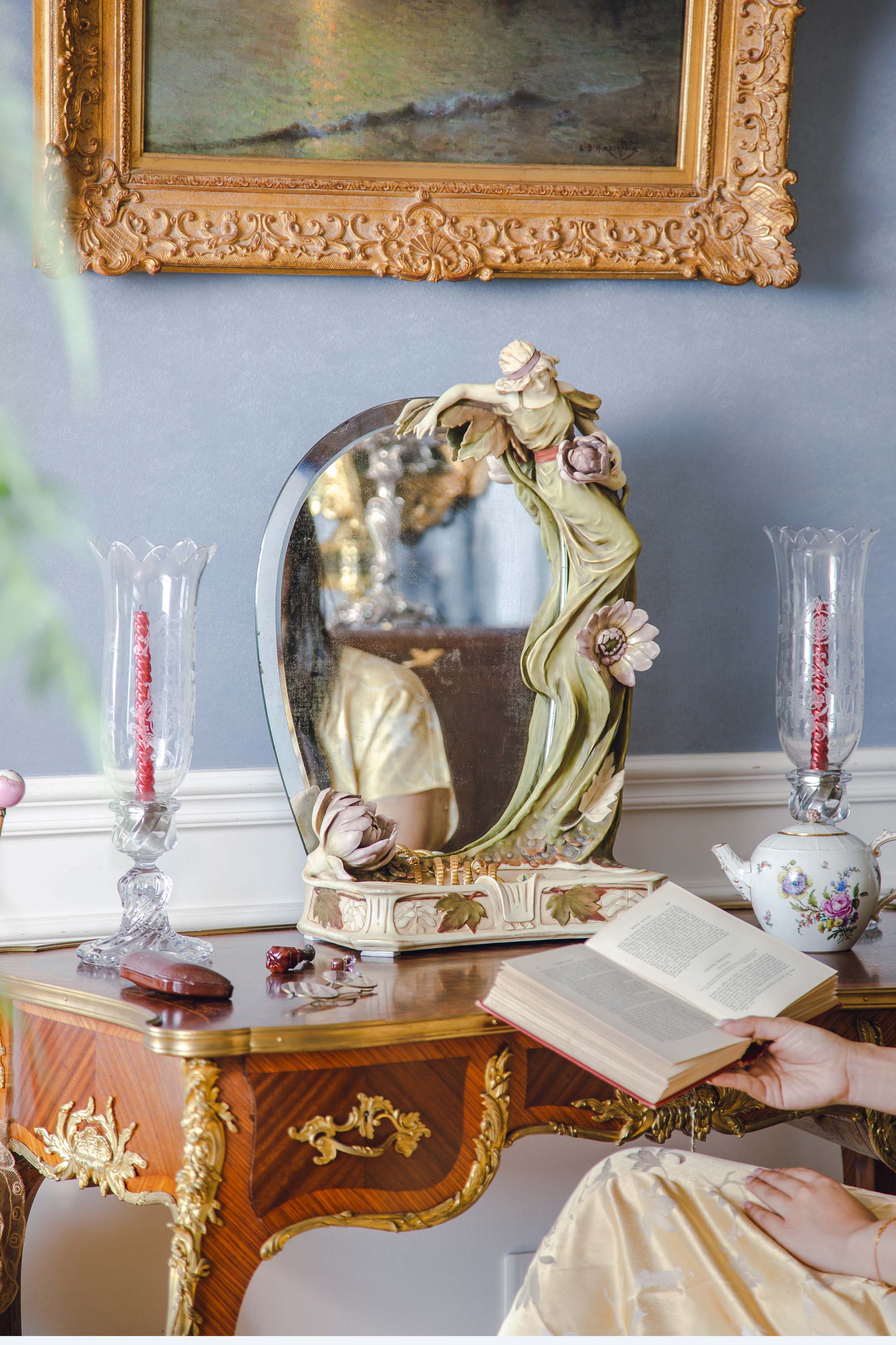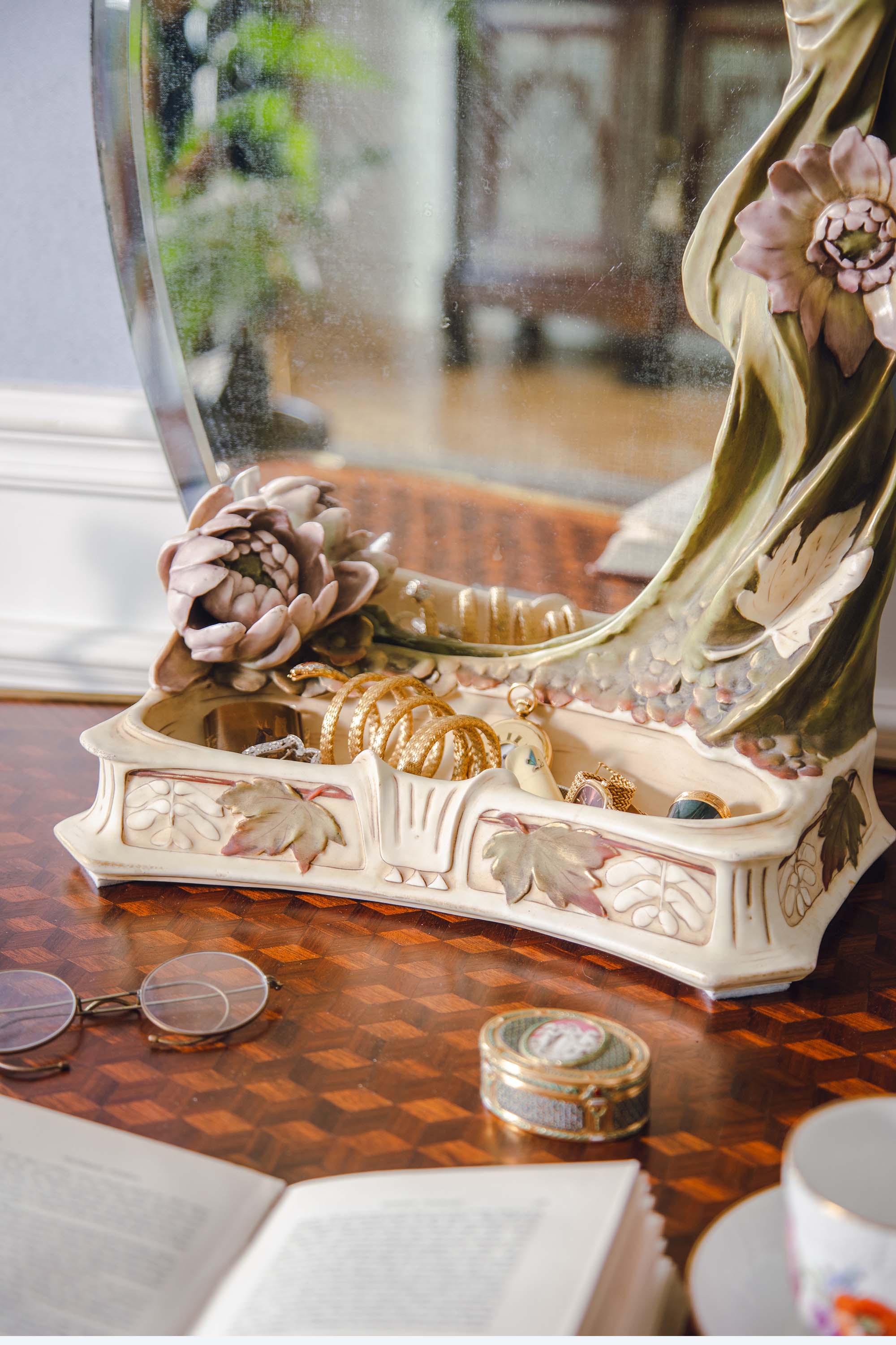 1900年代捷克Royal Dux瓷窑出品新艺术风格「抱花少女」主题陶瓷雕塑梳妆座镜