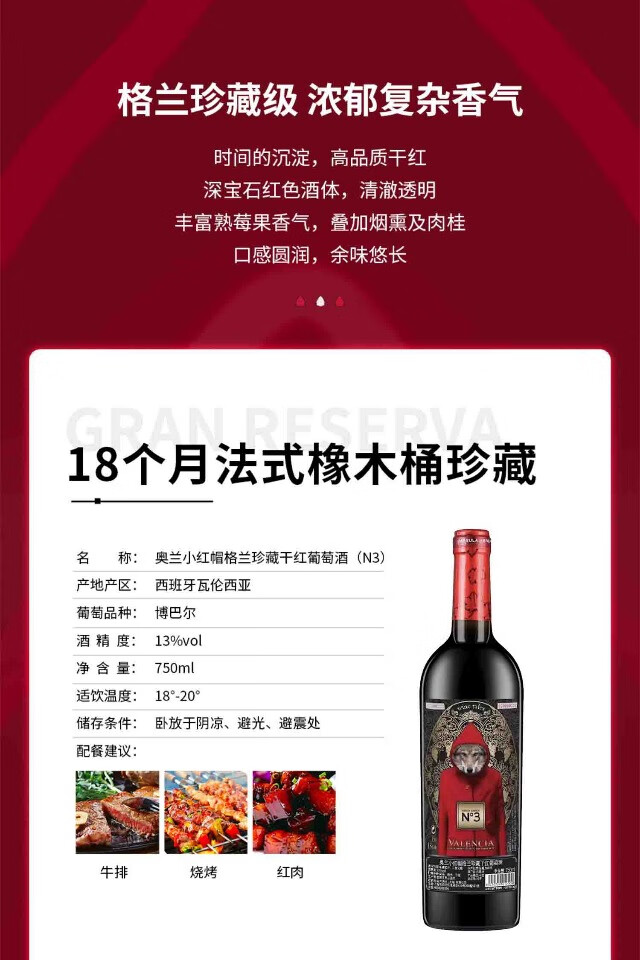 奥兰小红帽N3格兰珍藏干红葡萄酒 750ml