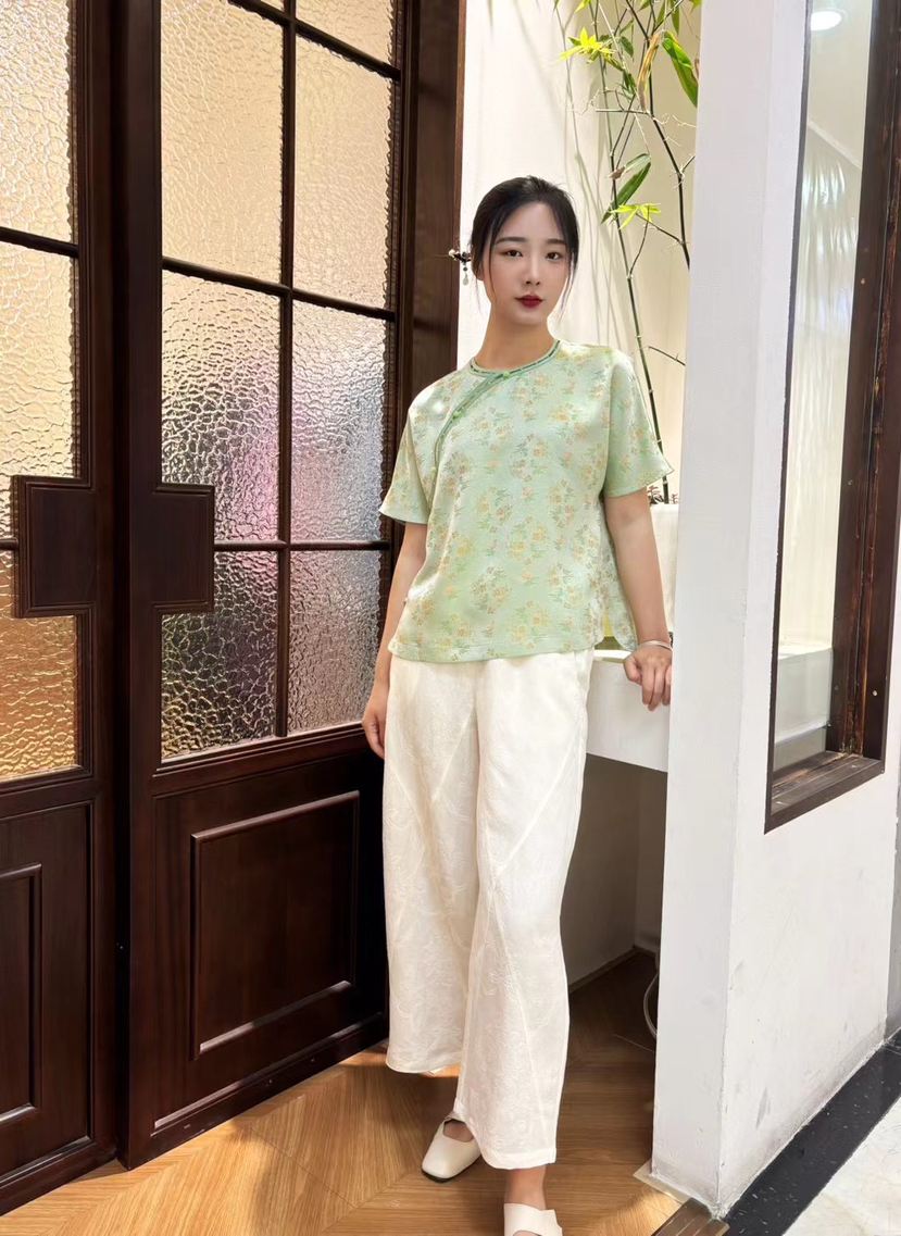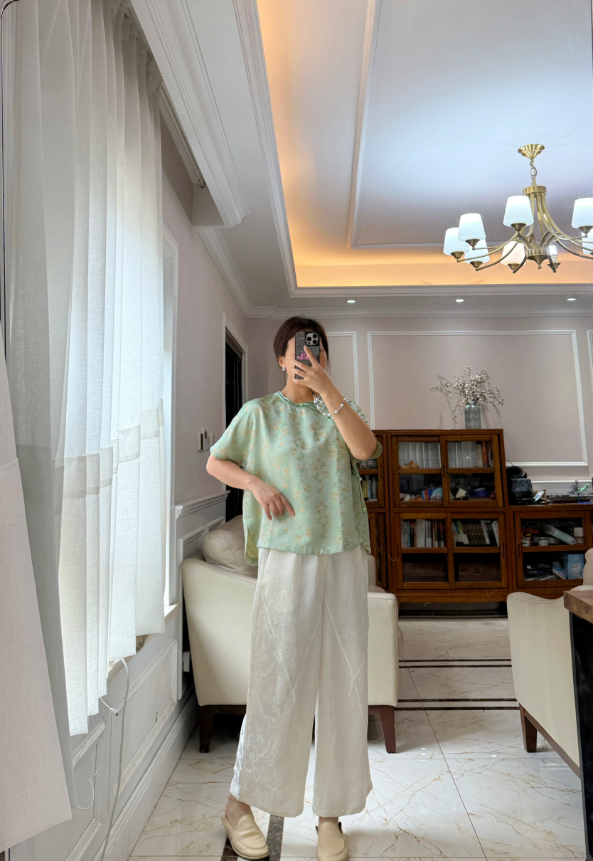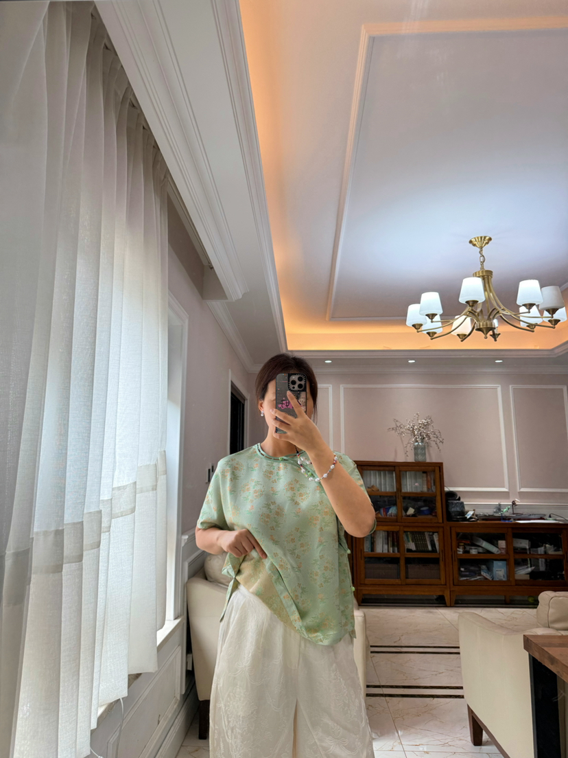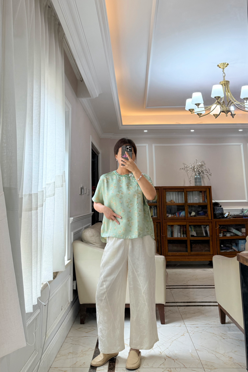 624-6新中式 真丝宋锦 绿色和风短袖圆领上衣 舒爽凉快 光泽华丽 H5518 我穿L宽松合适
