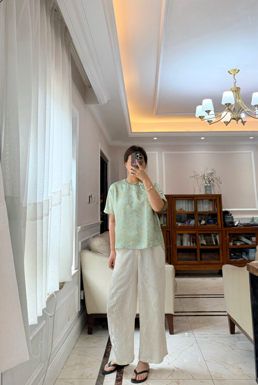 这一身就是我的理想哈哈,藏胳膊藏大腿肉肉。清新消暑的绿色,宋锦上面的纹样以及图案,都是织进去的,颜色也都是手工染色,比起批量工业化出品,这才是买一件是一件的奢侈品。