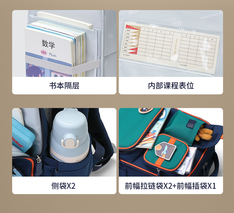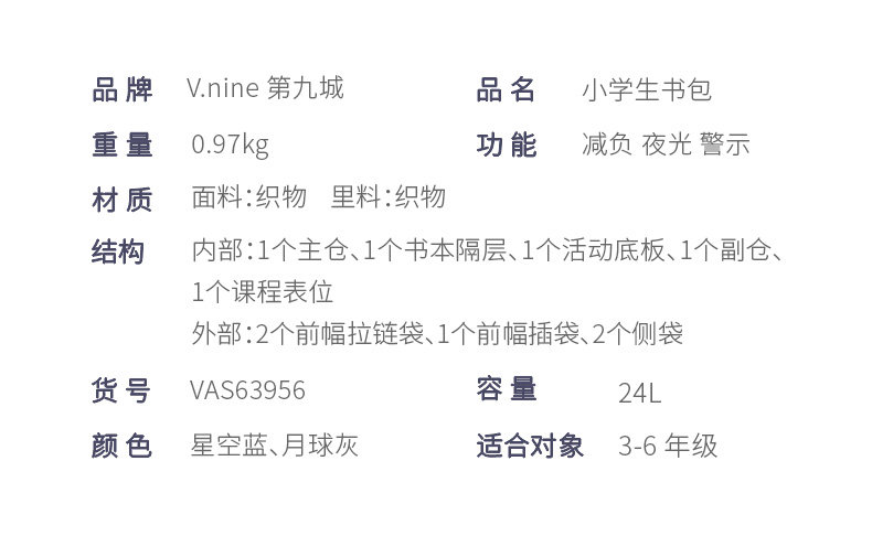 第九城 VAS63956 书包小学生大容量卡通撞色高颜值男孩儿童背包轻便减负女生双肩包 星空蓝
