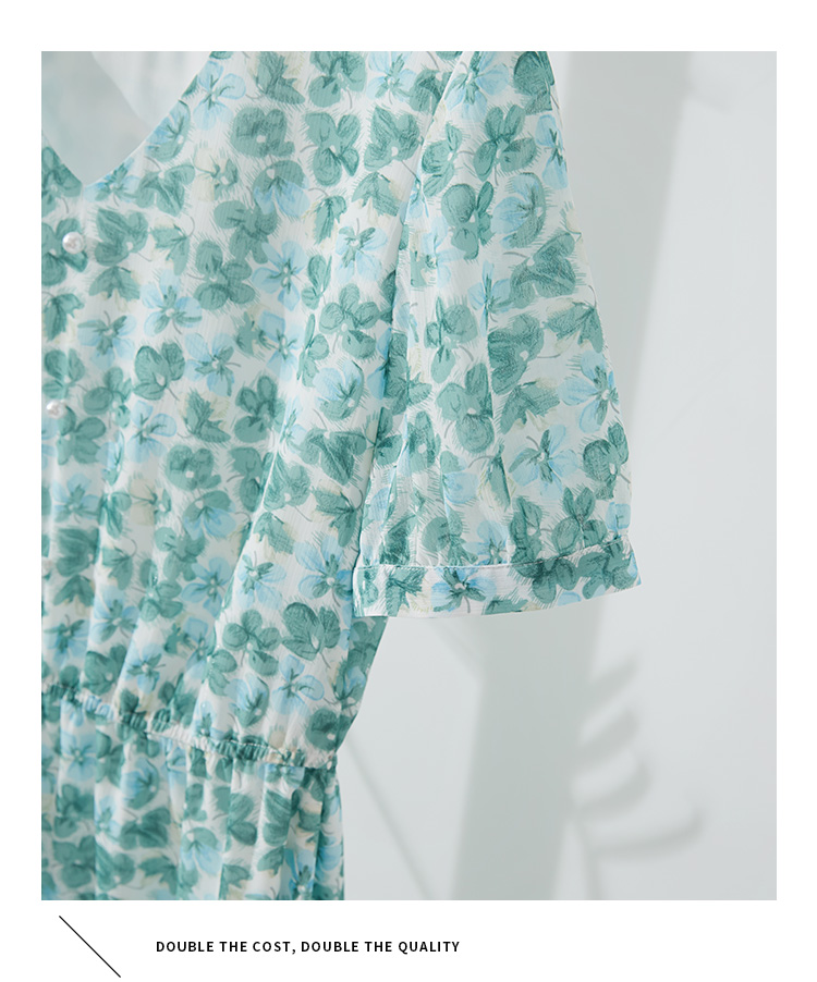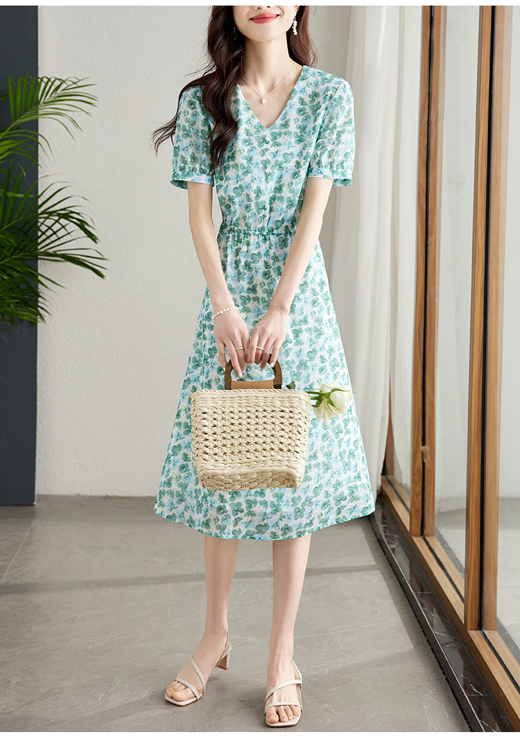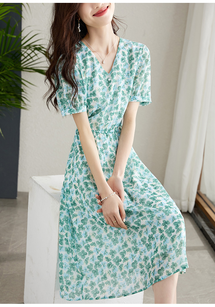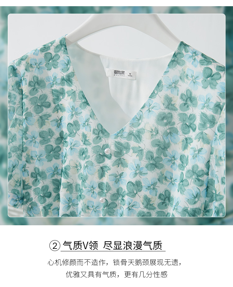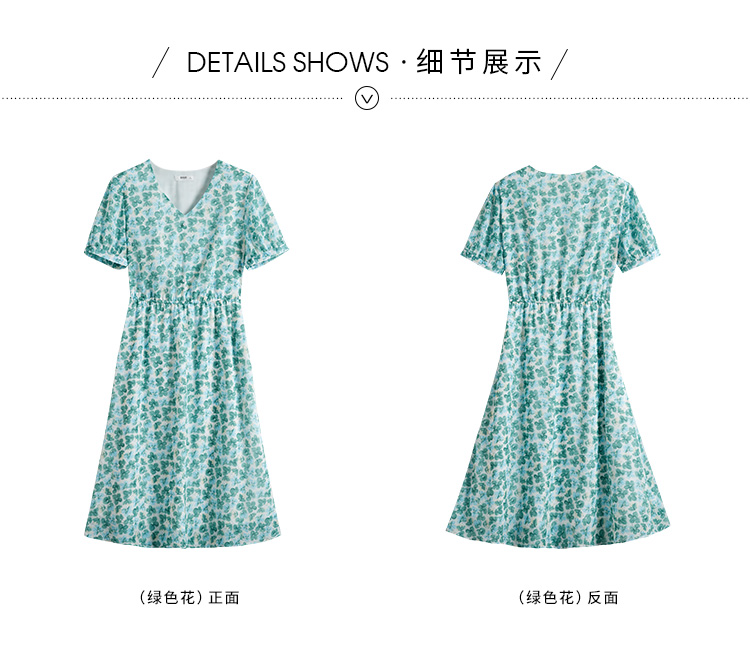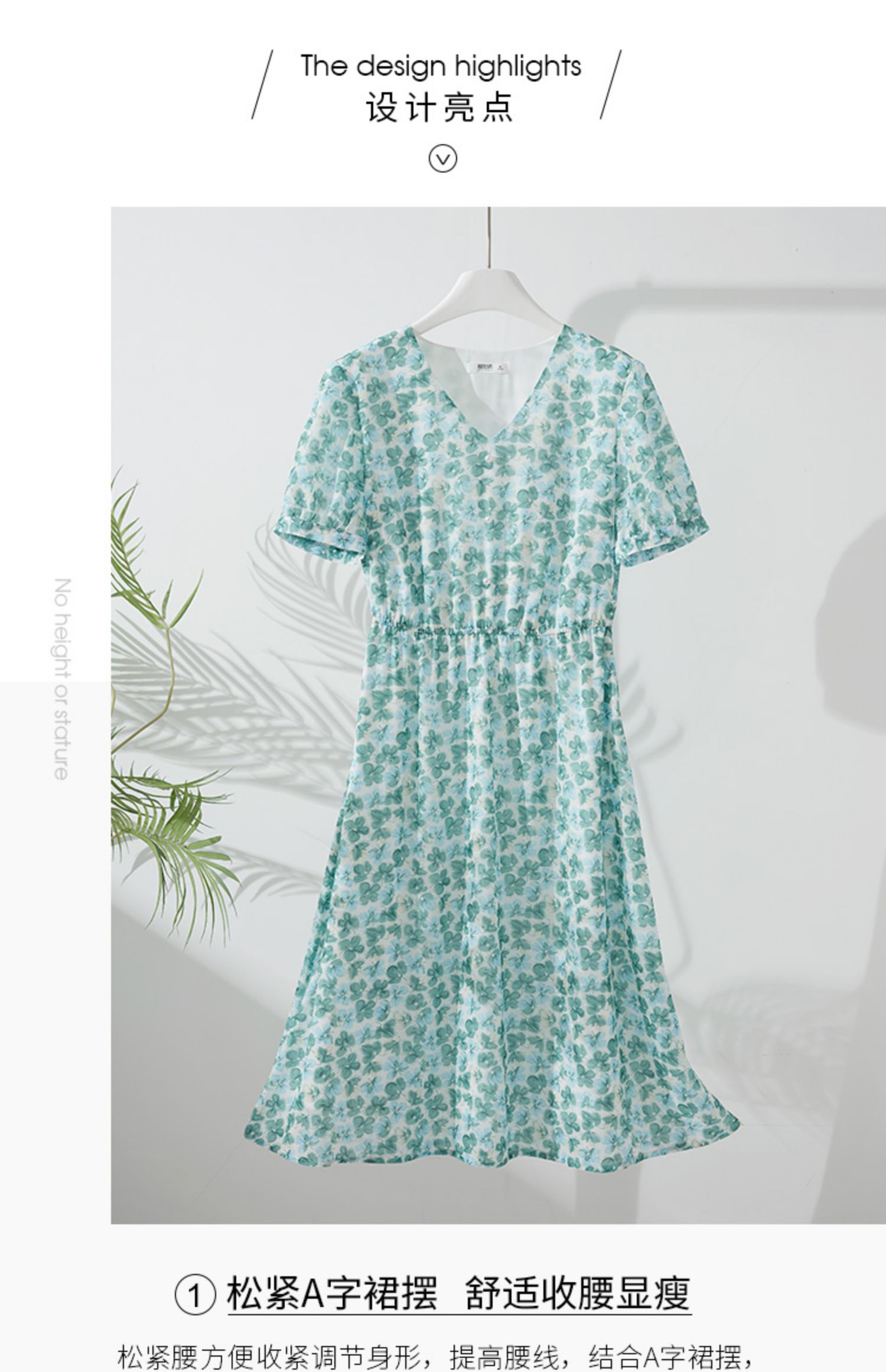 【专属特价】熙世界气质V领浪漫绿色碎花连衣裙夏新款收腰显瘦雪纺A字仙女裙