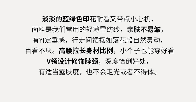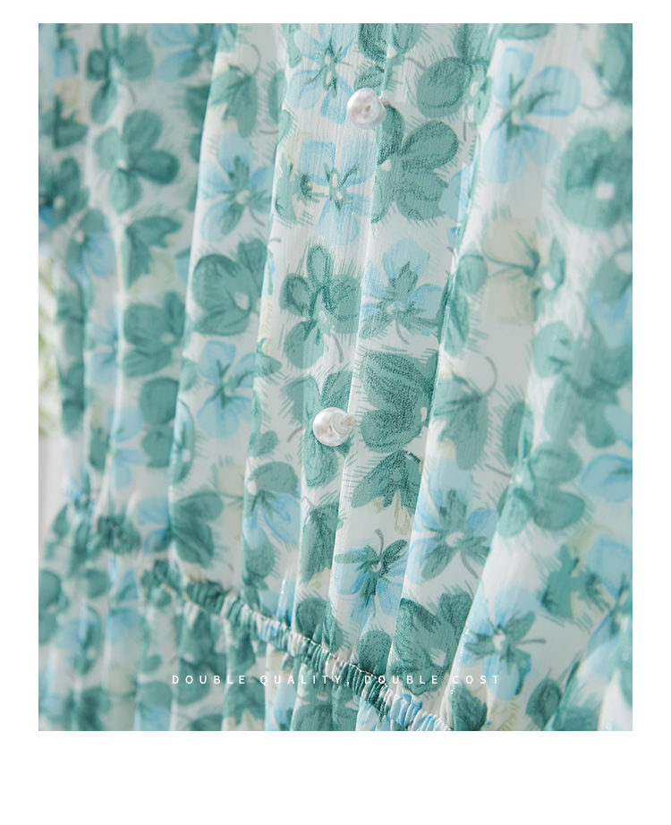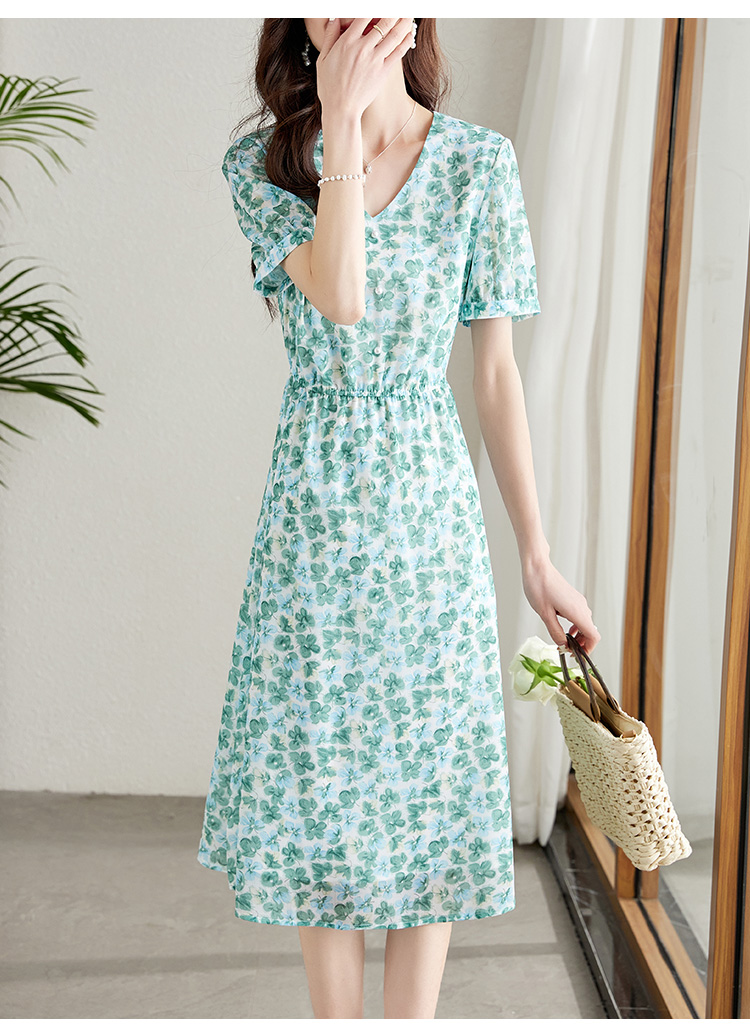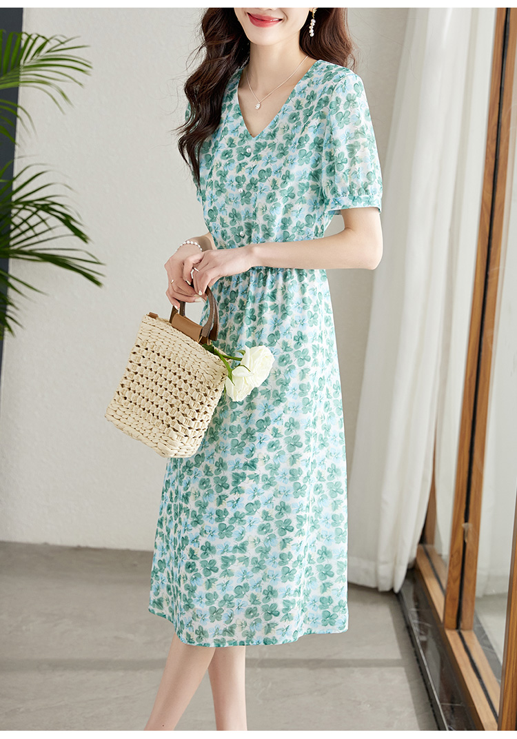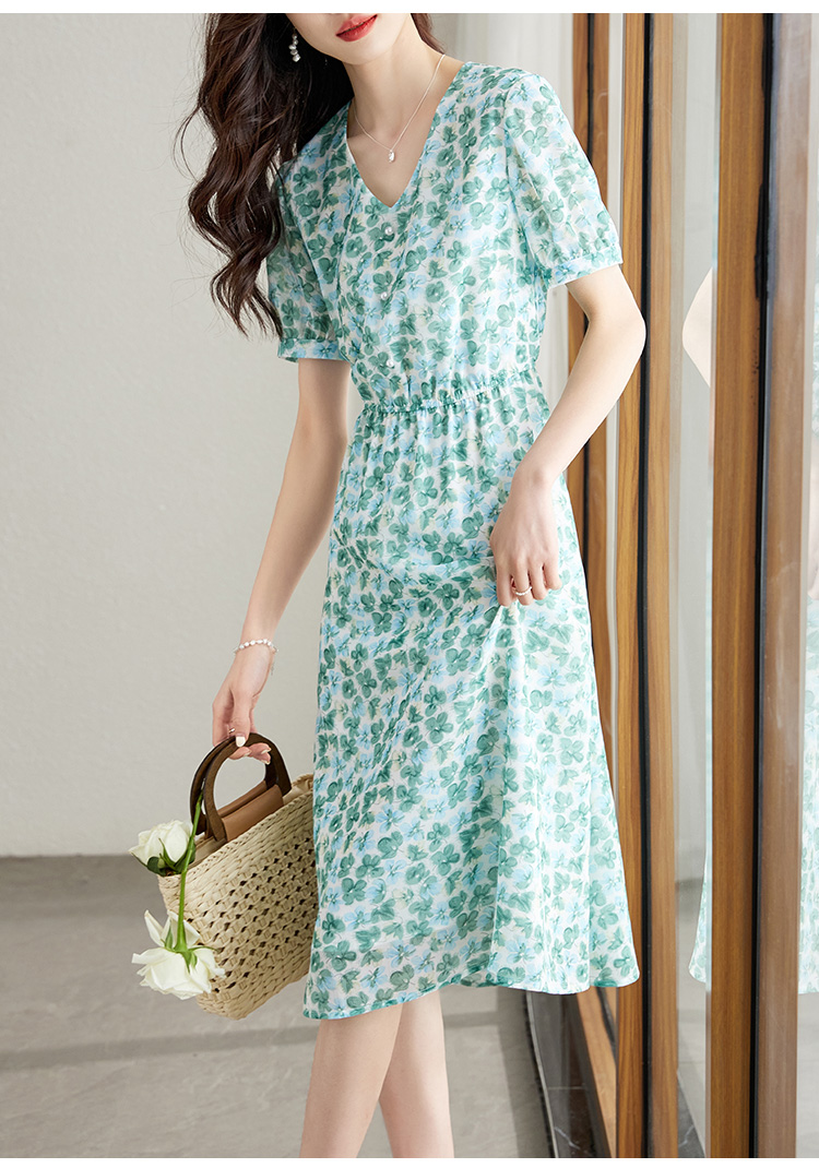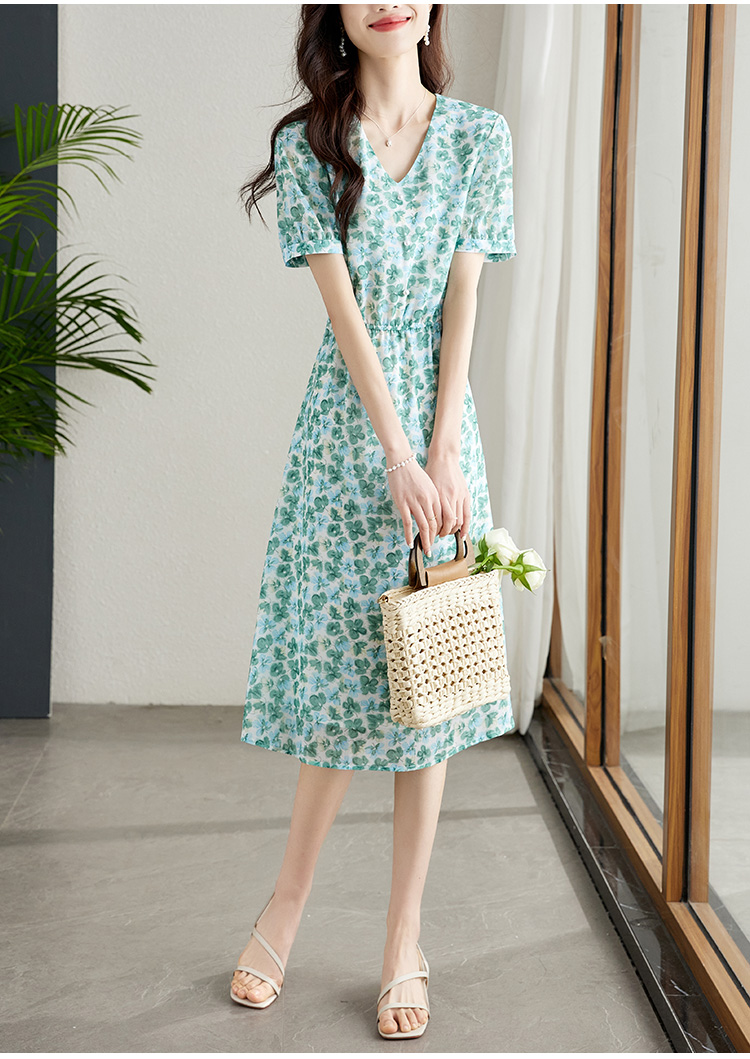 【专属特价】熙世界气质V领浪漫绿色碎花连衣裙夏新款收腰显瘦雪纺A字仙女裙