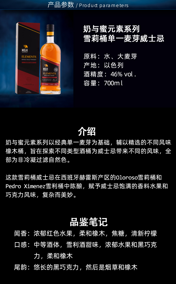 46°奶与蜜(M&H)元素系列【雪莉桶】单一麦芽威士忌700ml