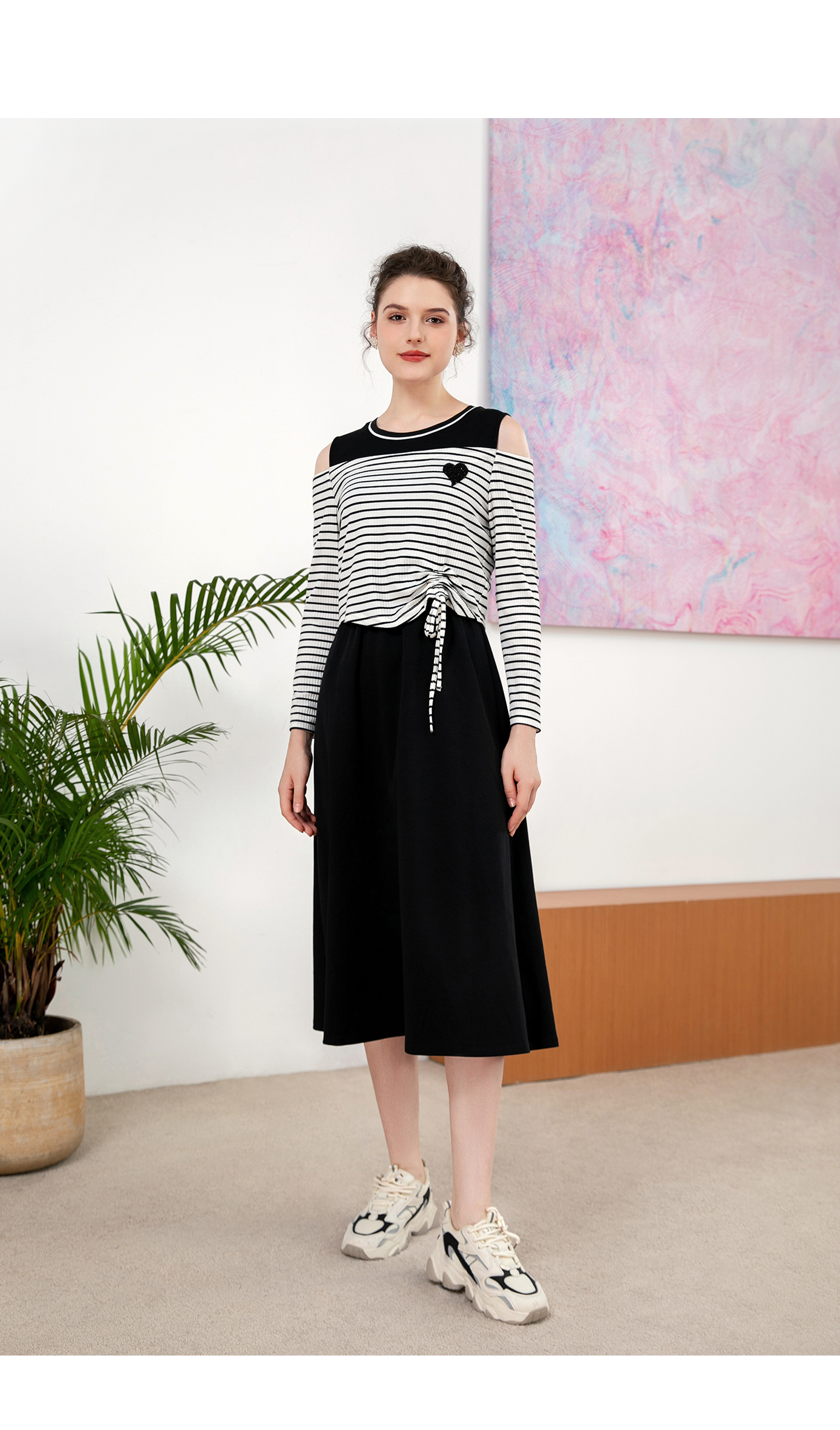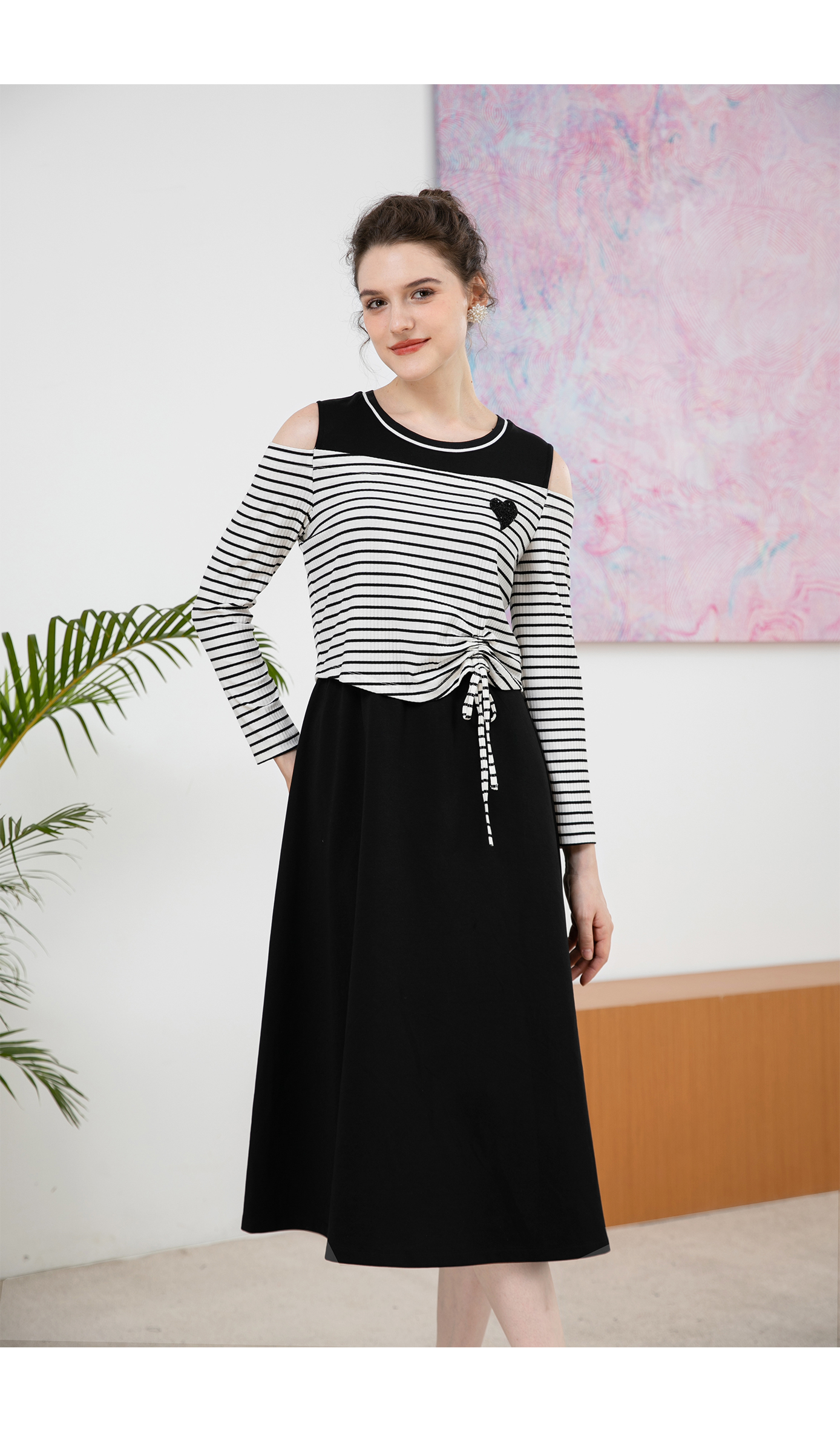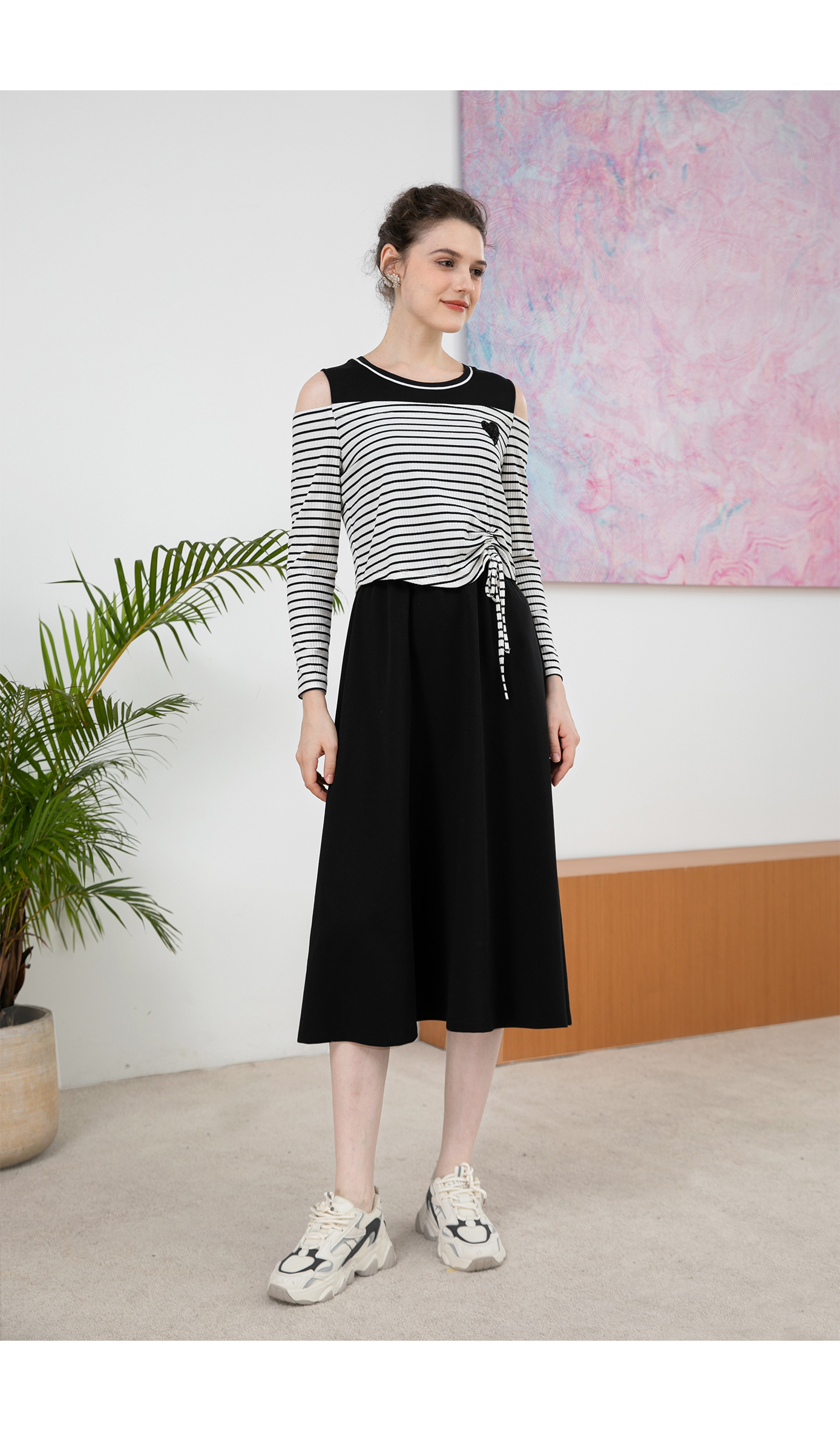 司歌时尚休闲假两件连衣裙露肩长袖弹力拼接A901004Y
