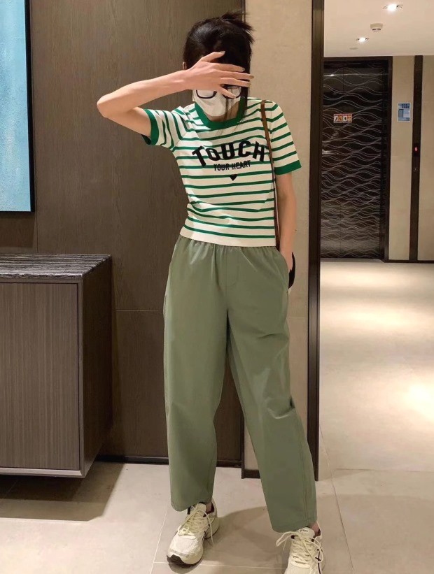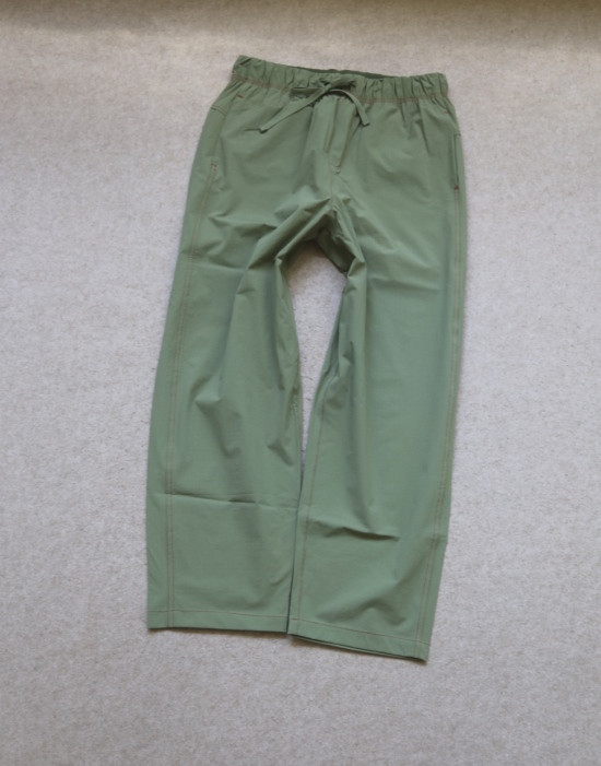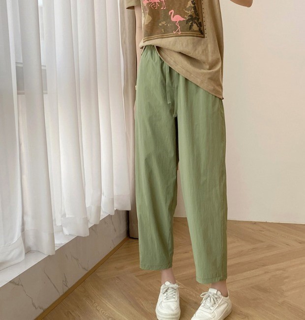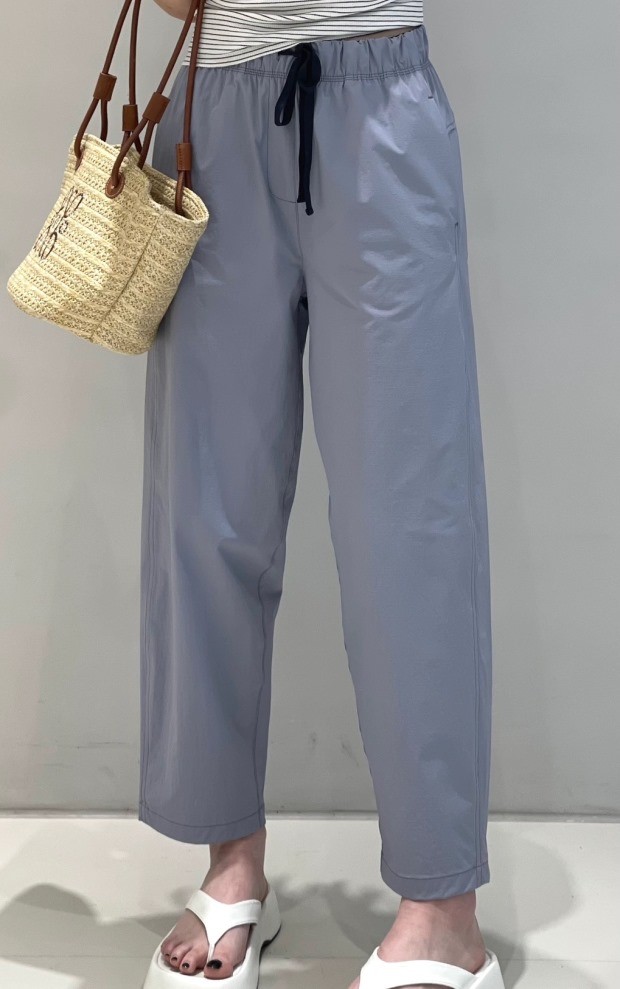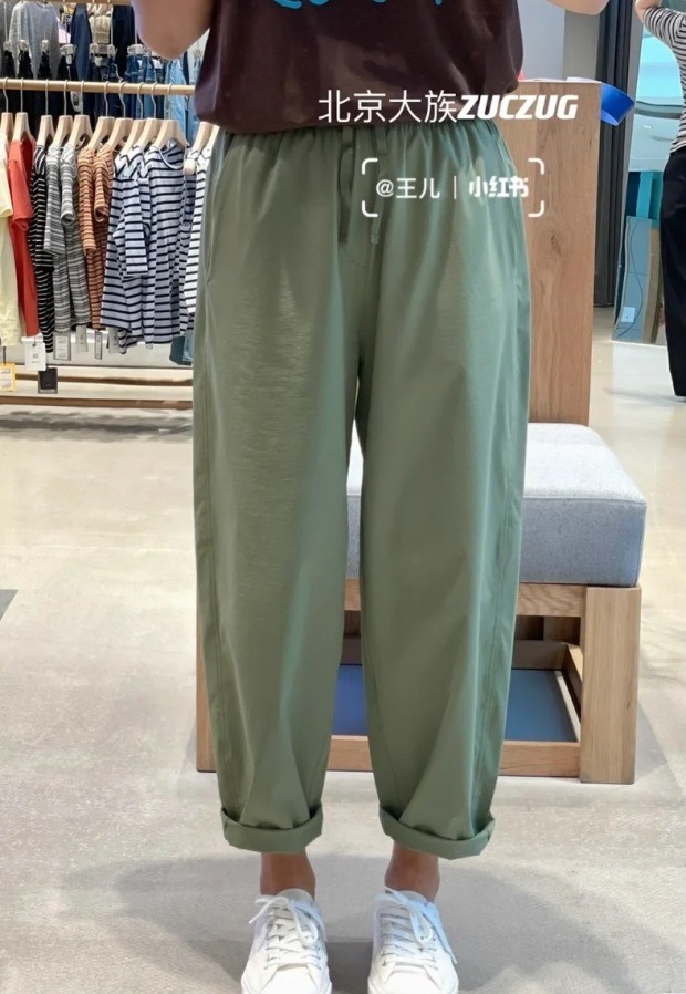 腰围相对偏大 瘦妞子 需要靠抽绳收紧 小个头的 估计会是标准长裤效果吧