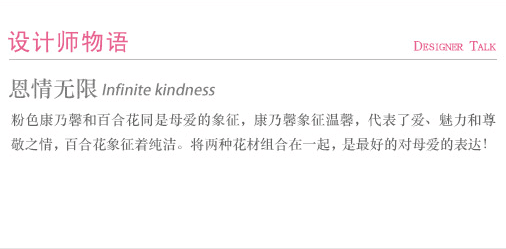恩情无限---粉色康乃馨11枝,粉色多头香水百合2枝,栀子叶适量 白色雪梨纸,米白色平面纸,粉色吊花压纹纸 银灰色缎带(1190)