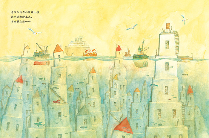 层层相叠的、像积木一样的房子里,埋藏的都是回忆宝藏。老爷爷潜入每一层房子,就像打开回忆之门一样,重温了当时的人生记录。这本书除了传达“人生回忆就像积木一样,层层堆叠而成”这一感悟,同时也扣准了因为气候变暖而引起海水上升的流行话题,让人震撼。