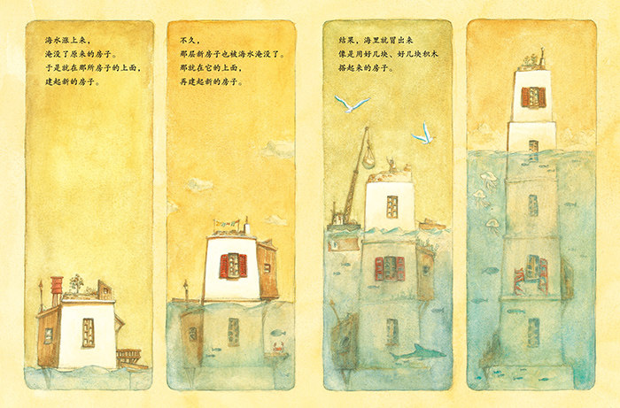"小镇旁的海水涨上来,淹过小镇,不断向上升,小镇的居民只能在原有房子上面盖新的房子,一层一层地往上叠,就像搭积木一样。