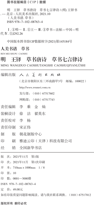人美书谱 草书 明 王铎 草书唐诗 草书七言律诗【现货包邮】RM0055