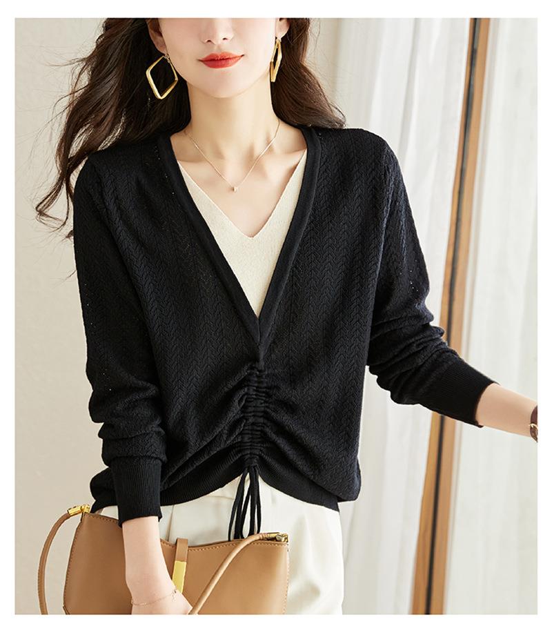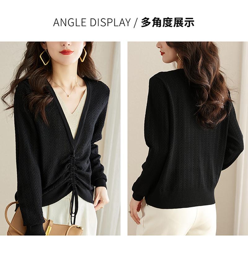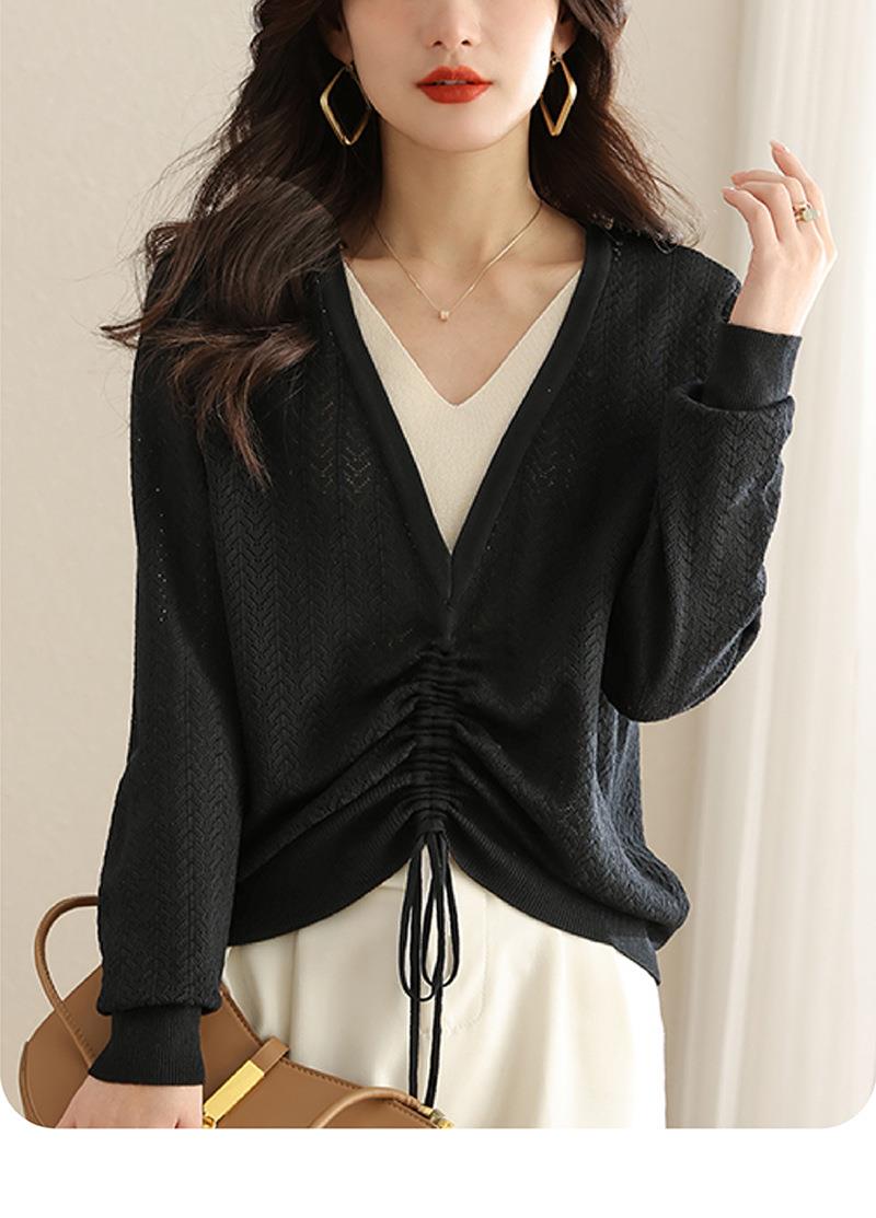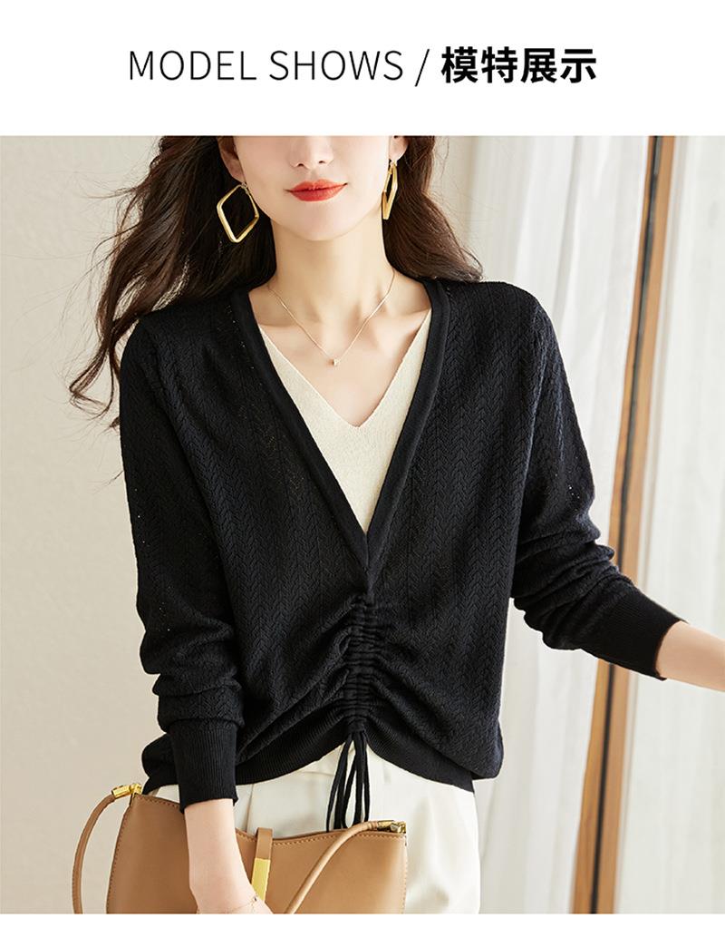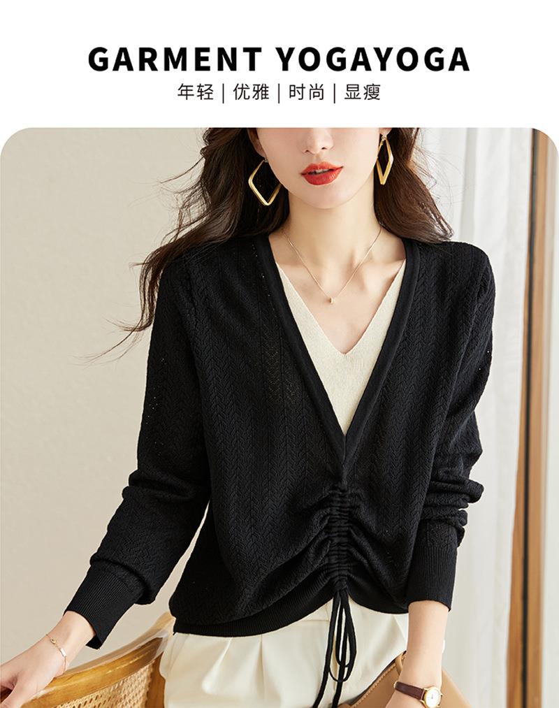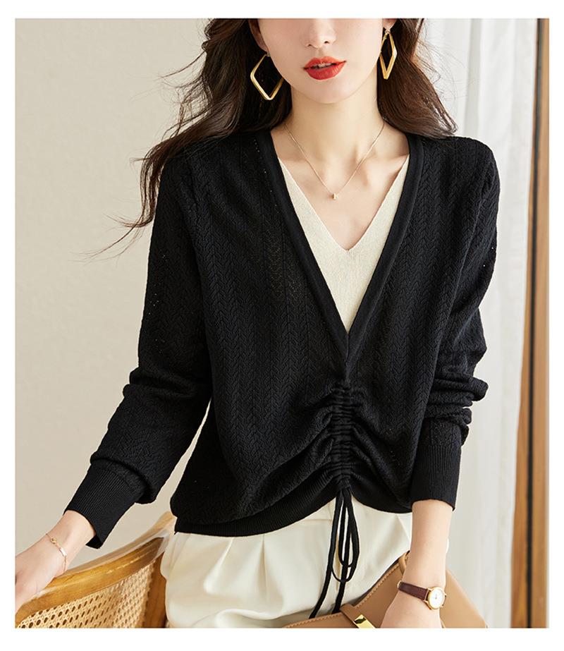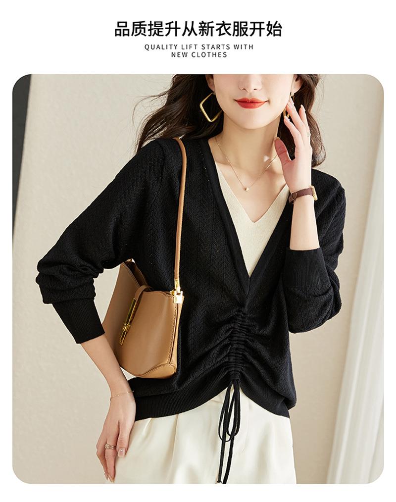针织衫女长袖春秋新款洋气小衫薄款设计感镂空假两件v领上衣