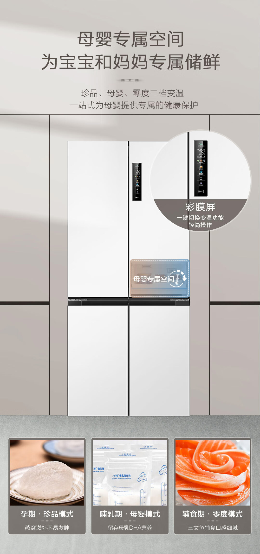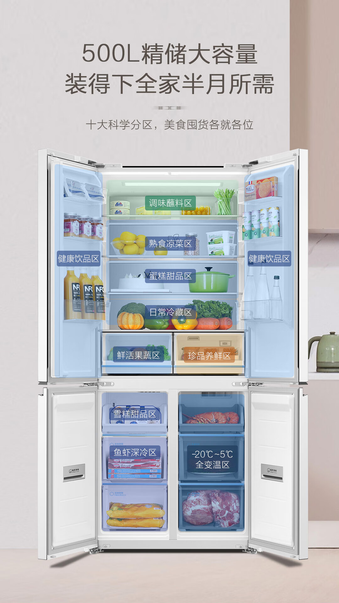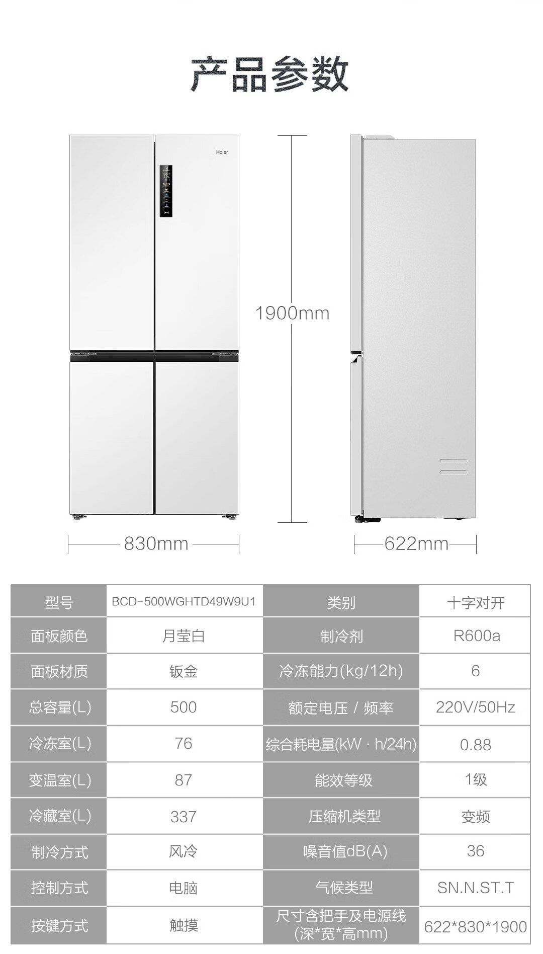 海尔(Haier)500升零距离自由嵌入式白色一级能效除菌变温超薄母婴四开十字双开门家用冰箱BCD-500WGHTD49W9U1