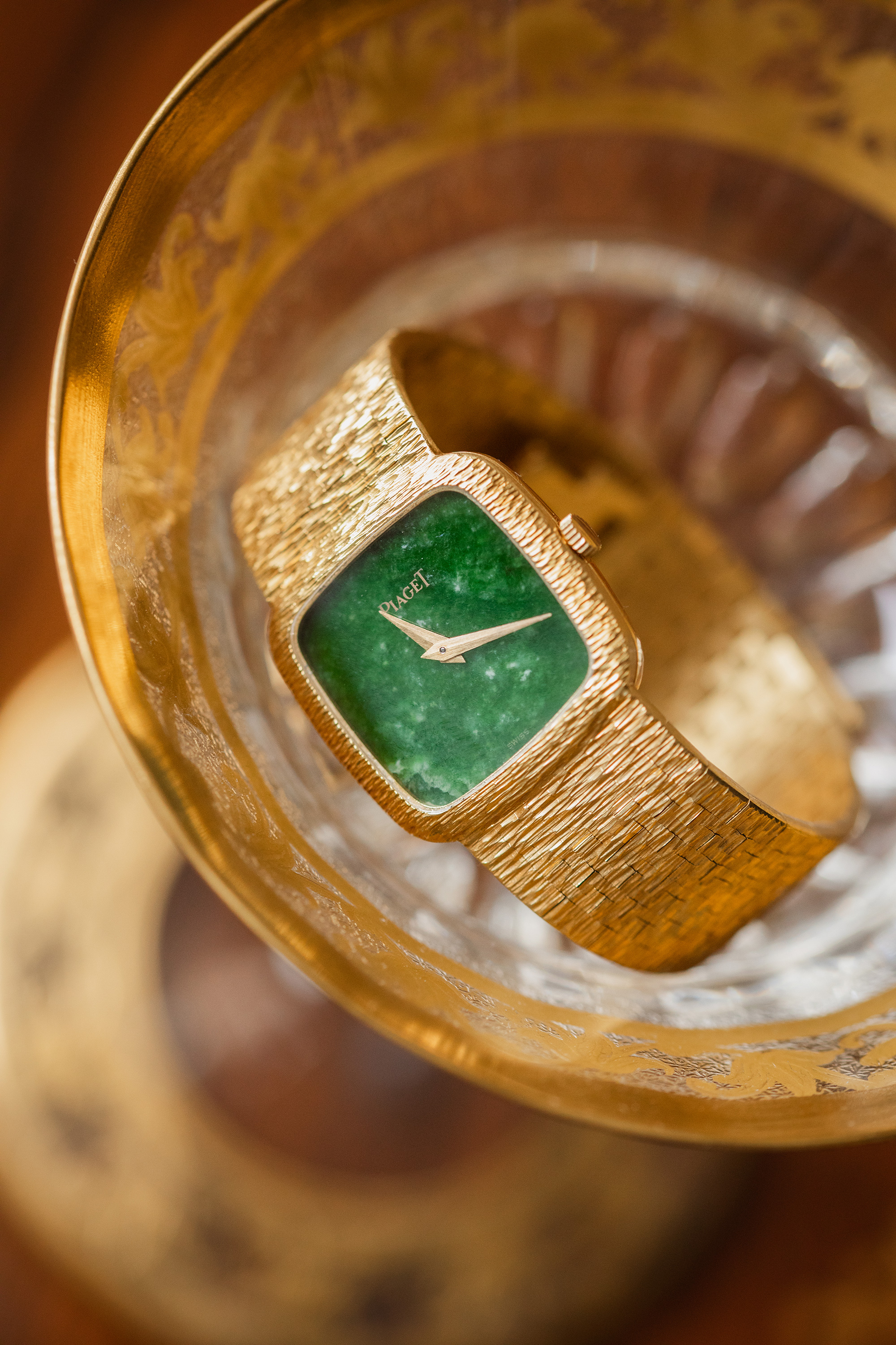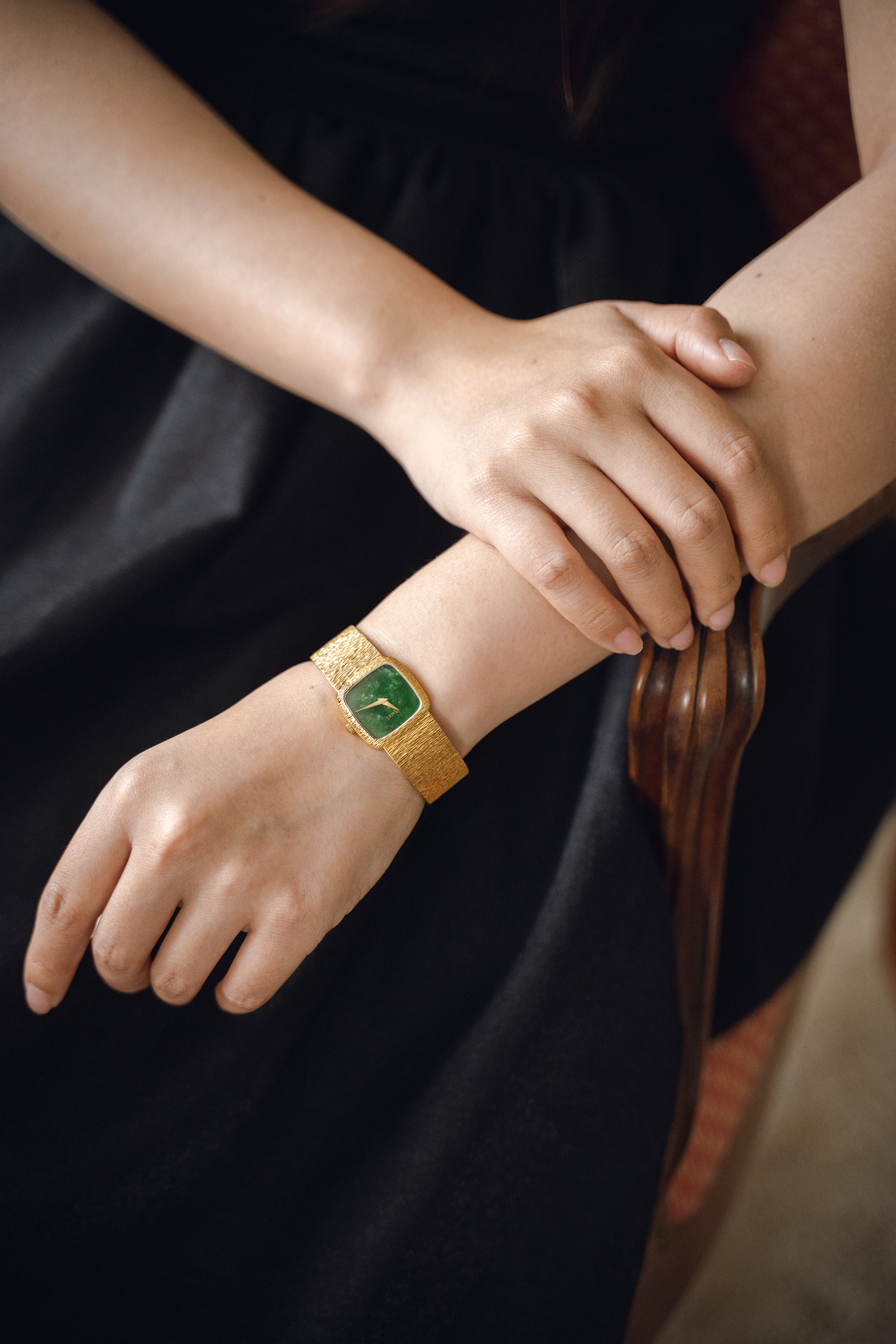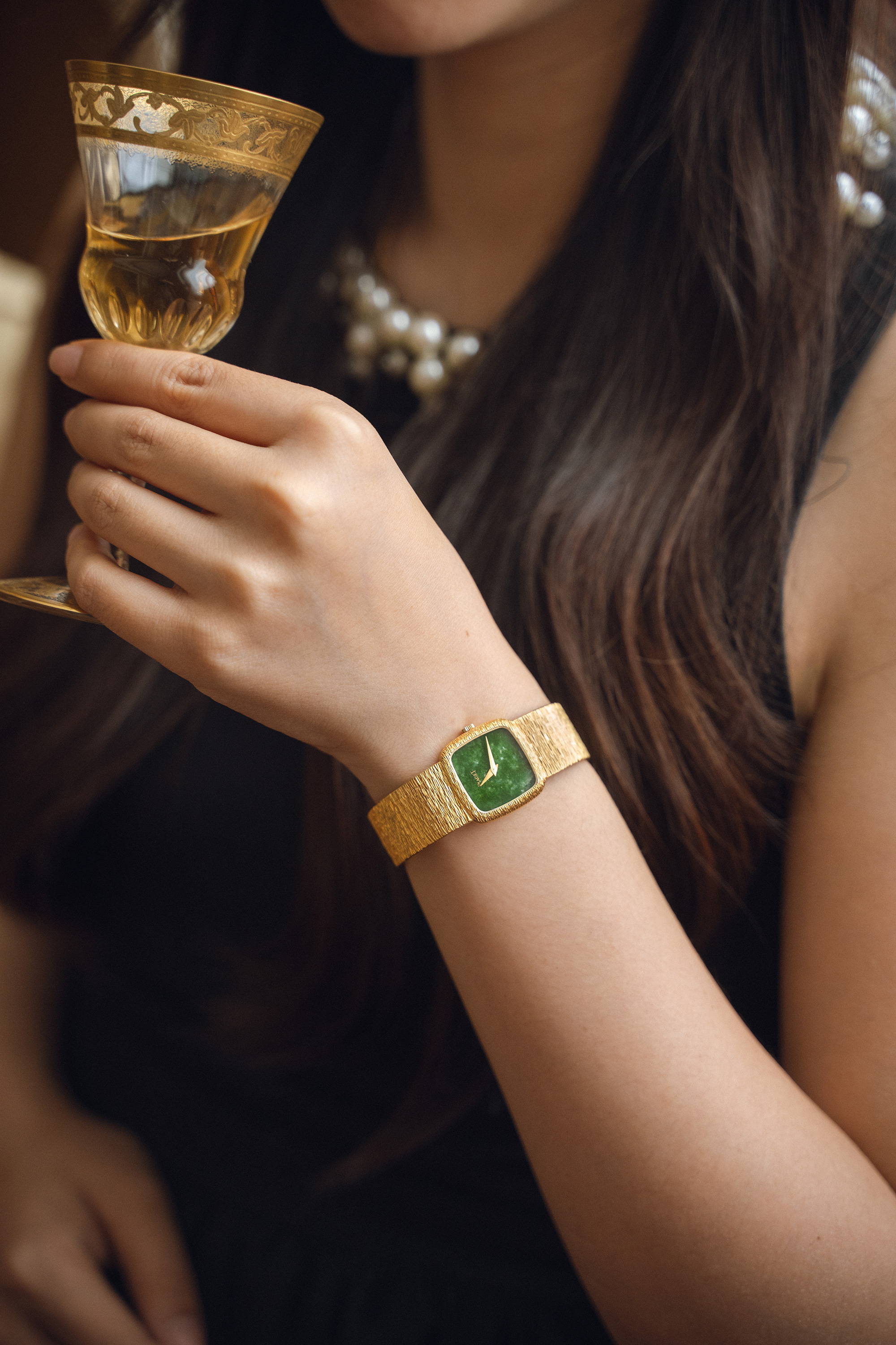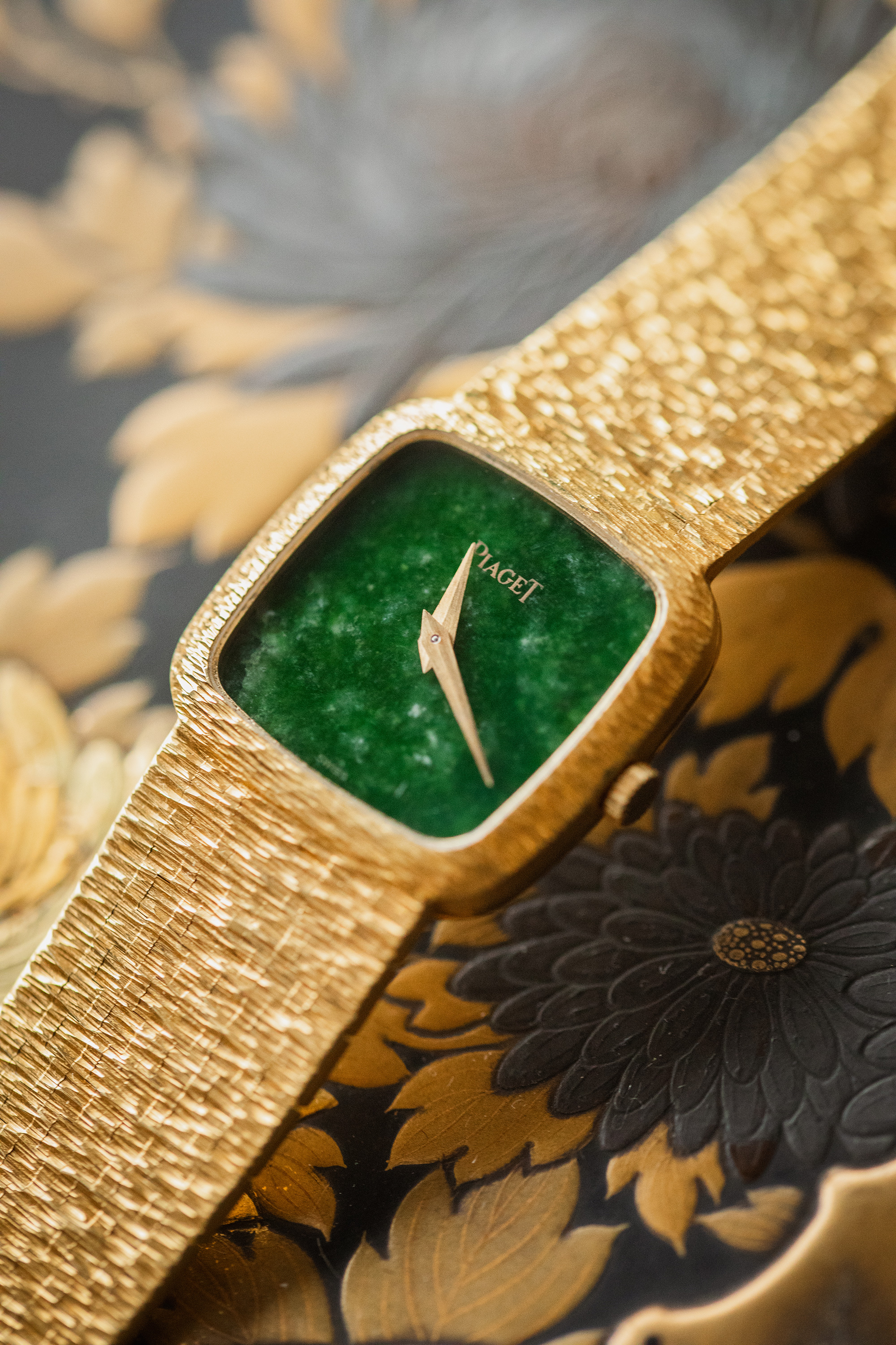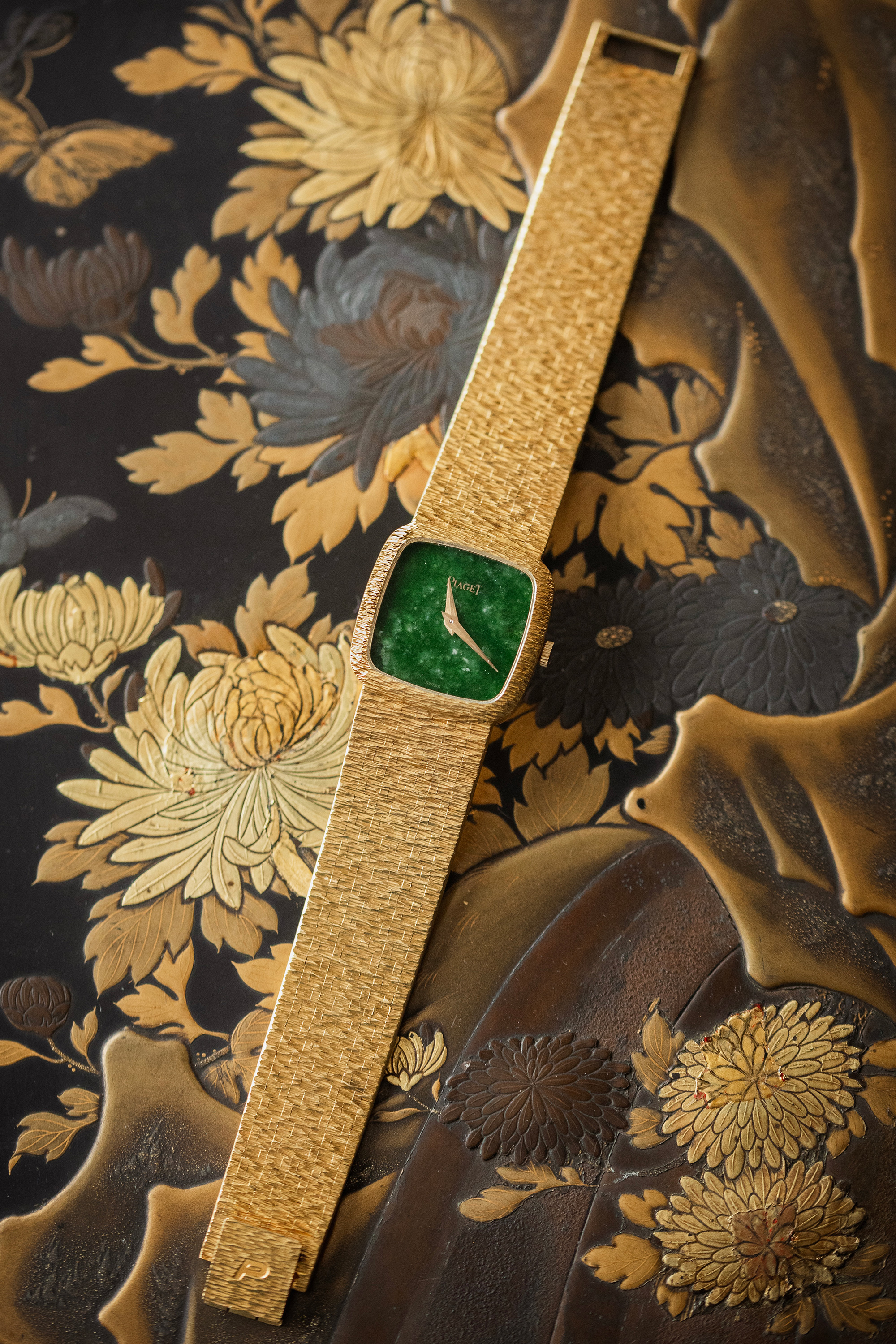 1970年代瑞士顶级钟表品牌伯爵Piaget出品18K黄金表带镶嵌翡翠表盘女士腕表