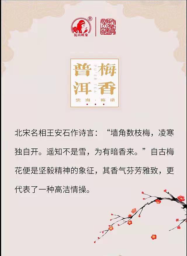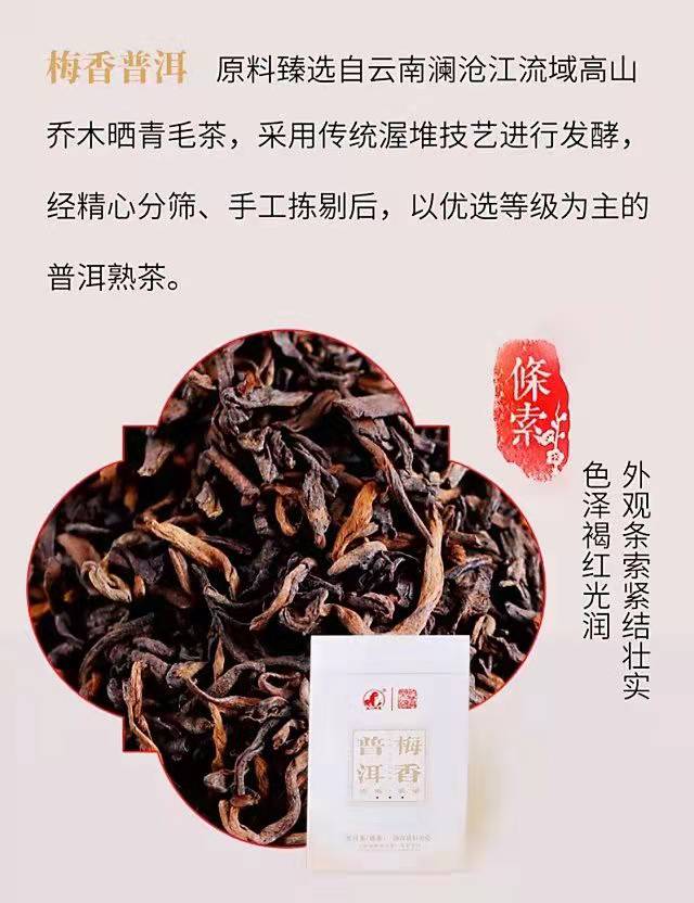 梅香普洱熟茶外观条索紧结壮实,色泽褐红光润。香气陈醇悠长,汤色红艳明亮,滋味甜醇细腻,喉韵绵长。叶底红褐柔软,匀亮一致。在适宜的仓储条件下,具备越陈越香的转化潜质。