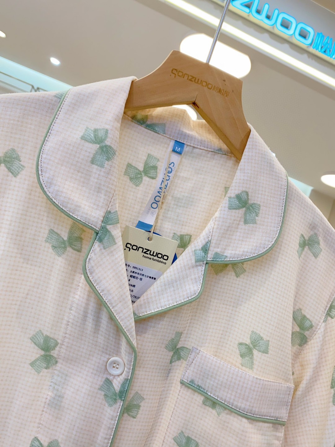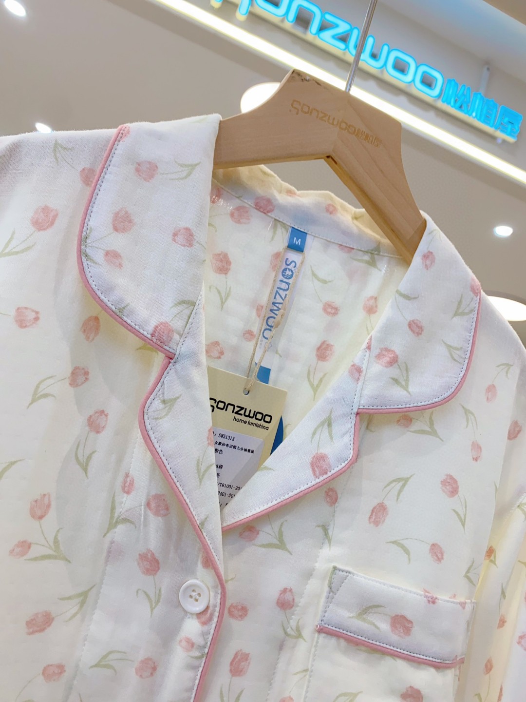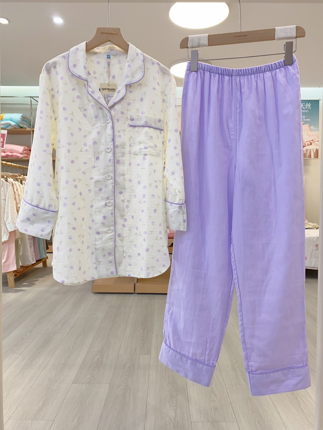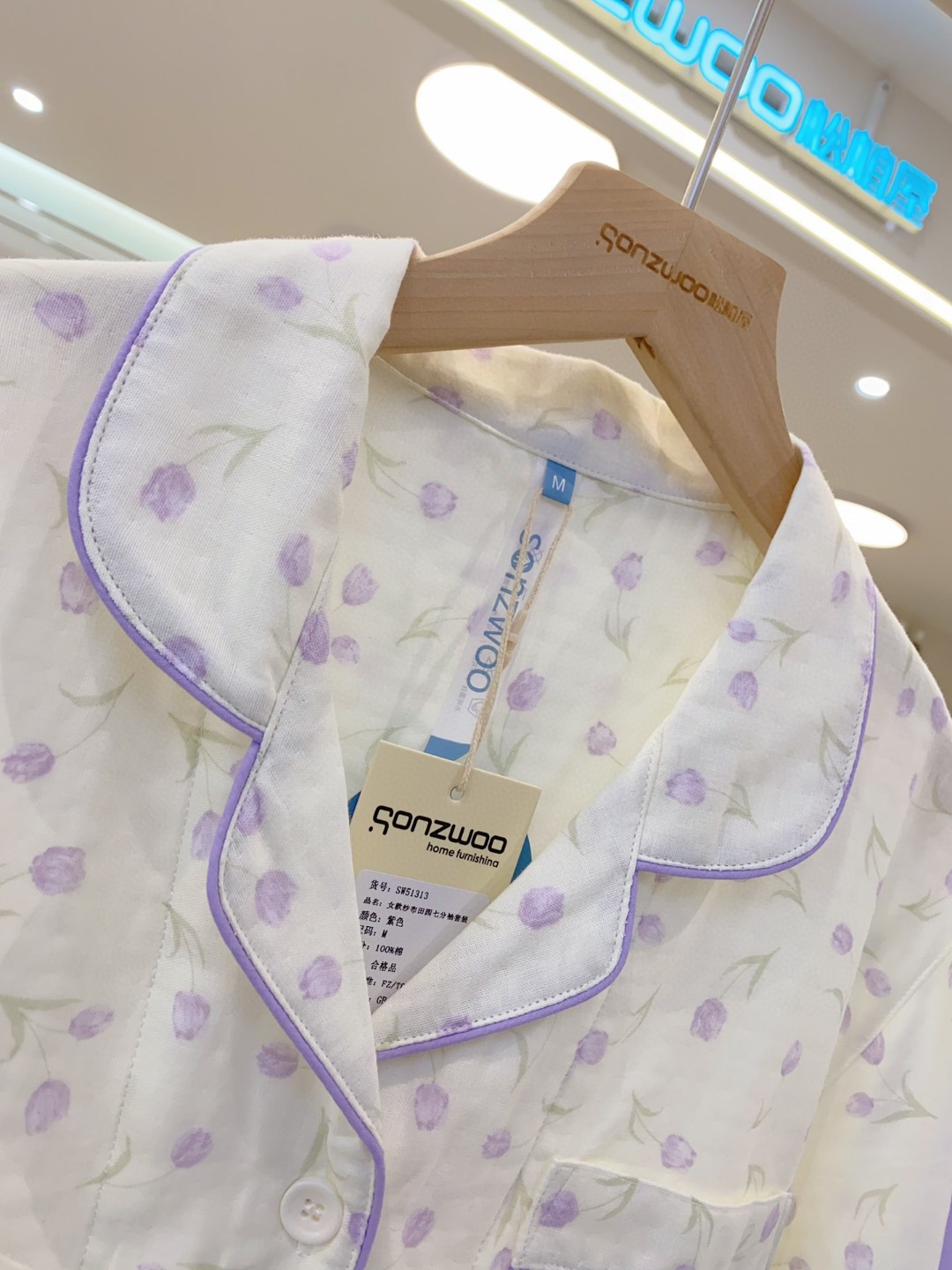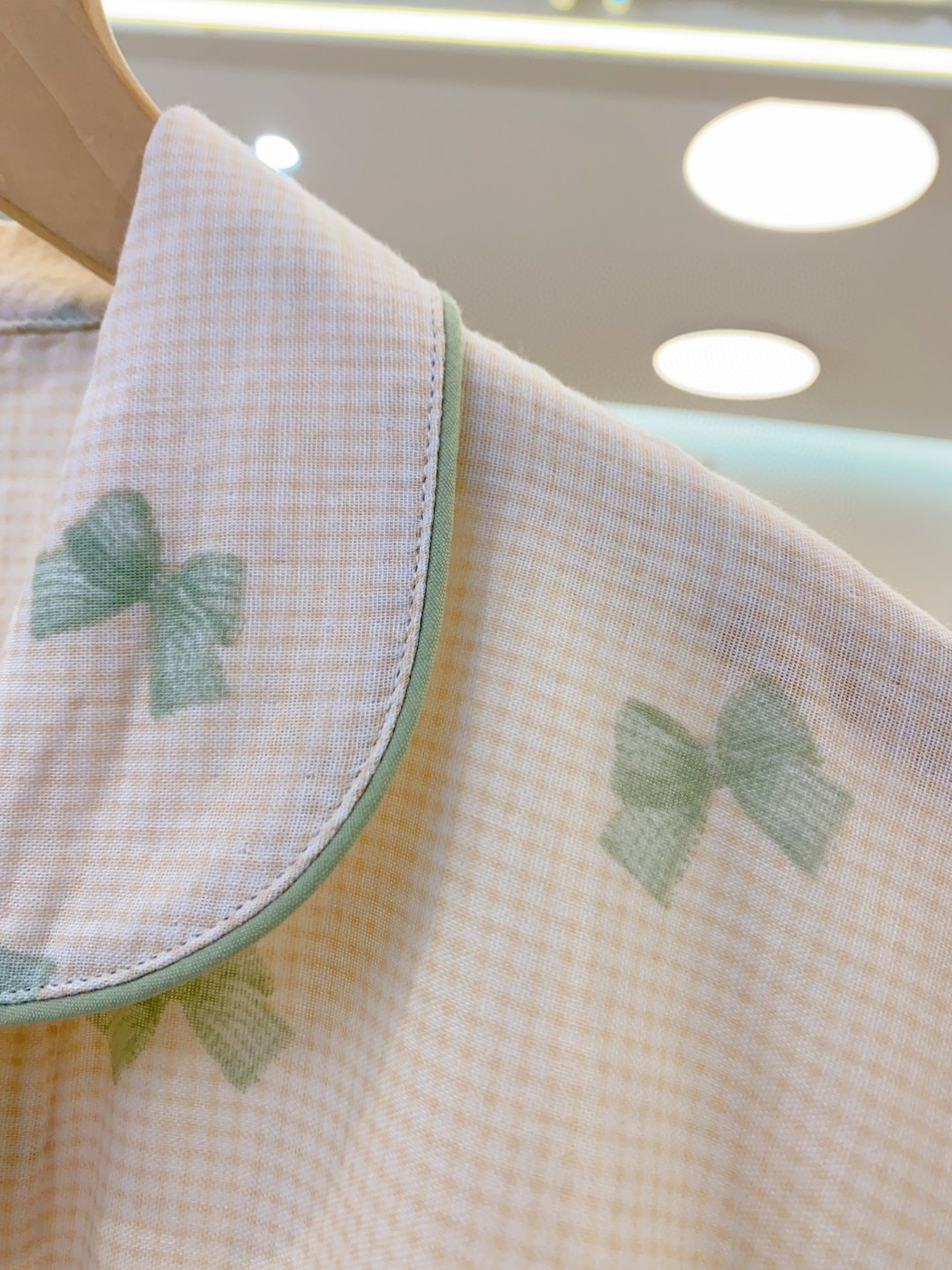 松植屋女款纱布清新田园七分袖长裤套装100% 纯棉纱布面料 柔软吸汗透气-