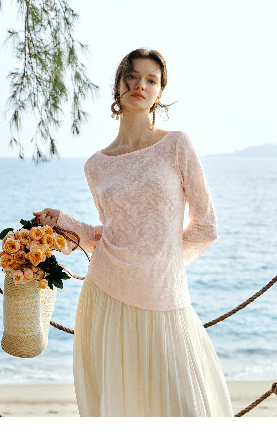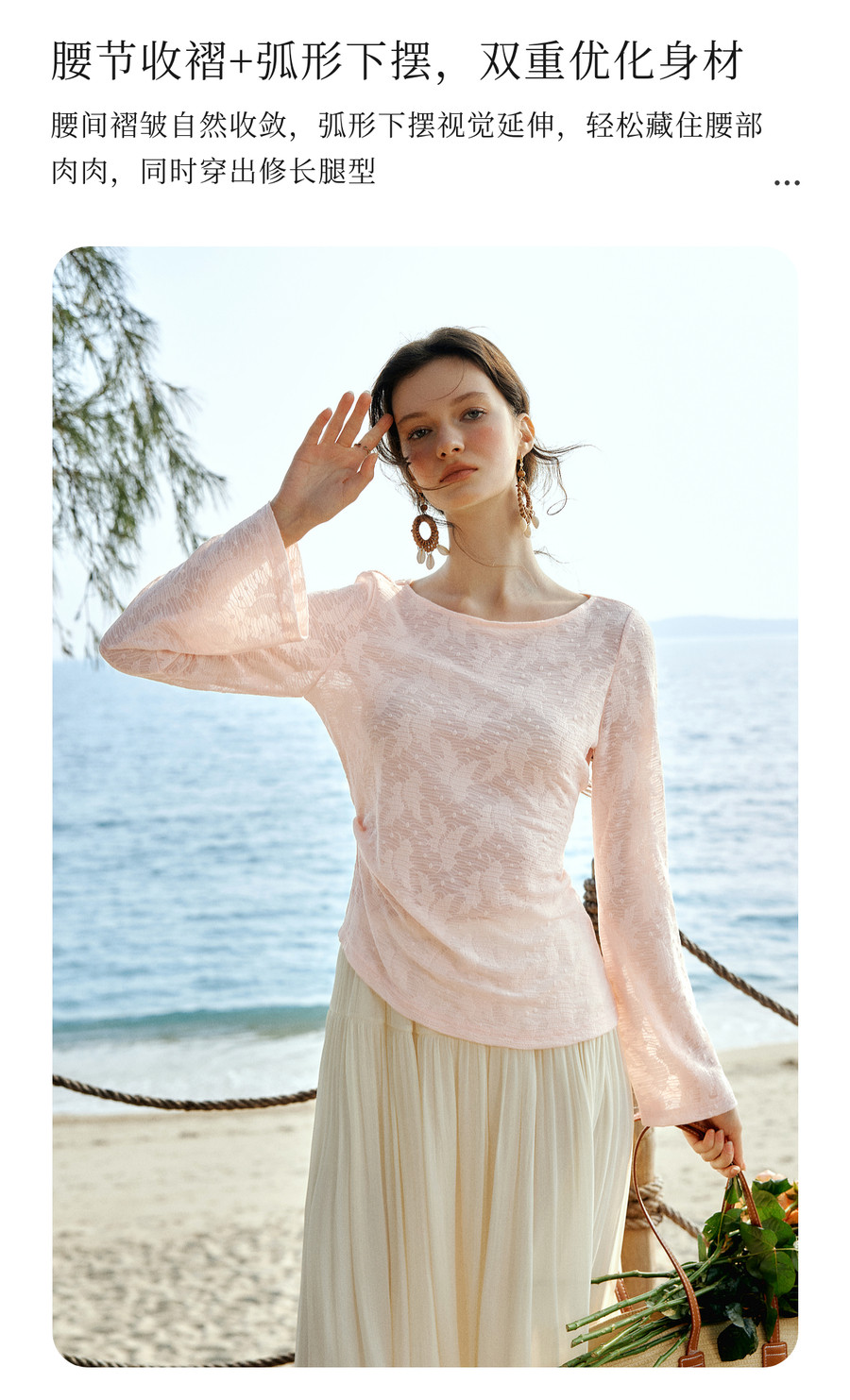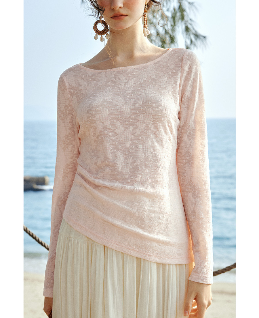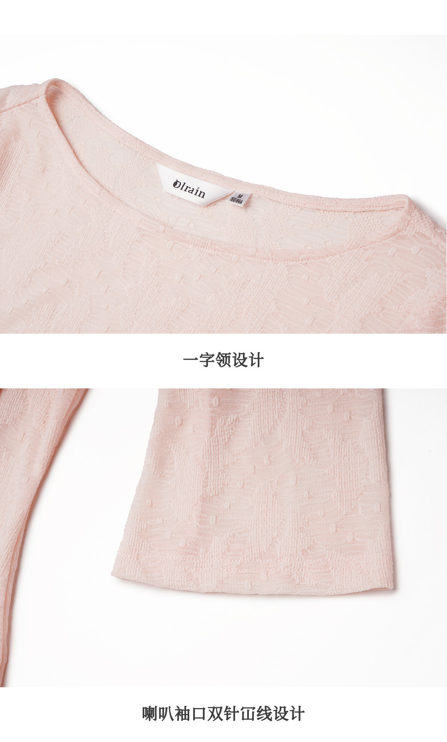 欧芮儿2026春新款法式粉色喇叭袖蕾丝衫女优雅浪漫长袖一字领上衣