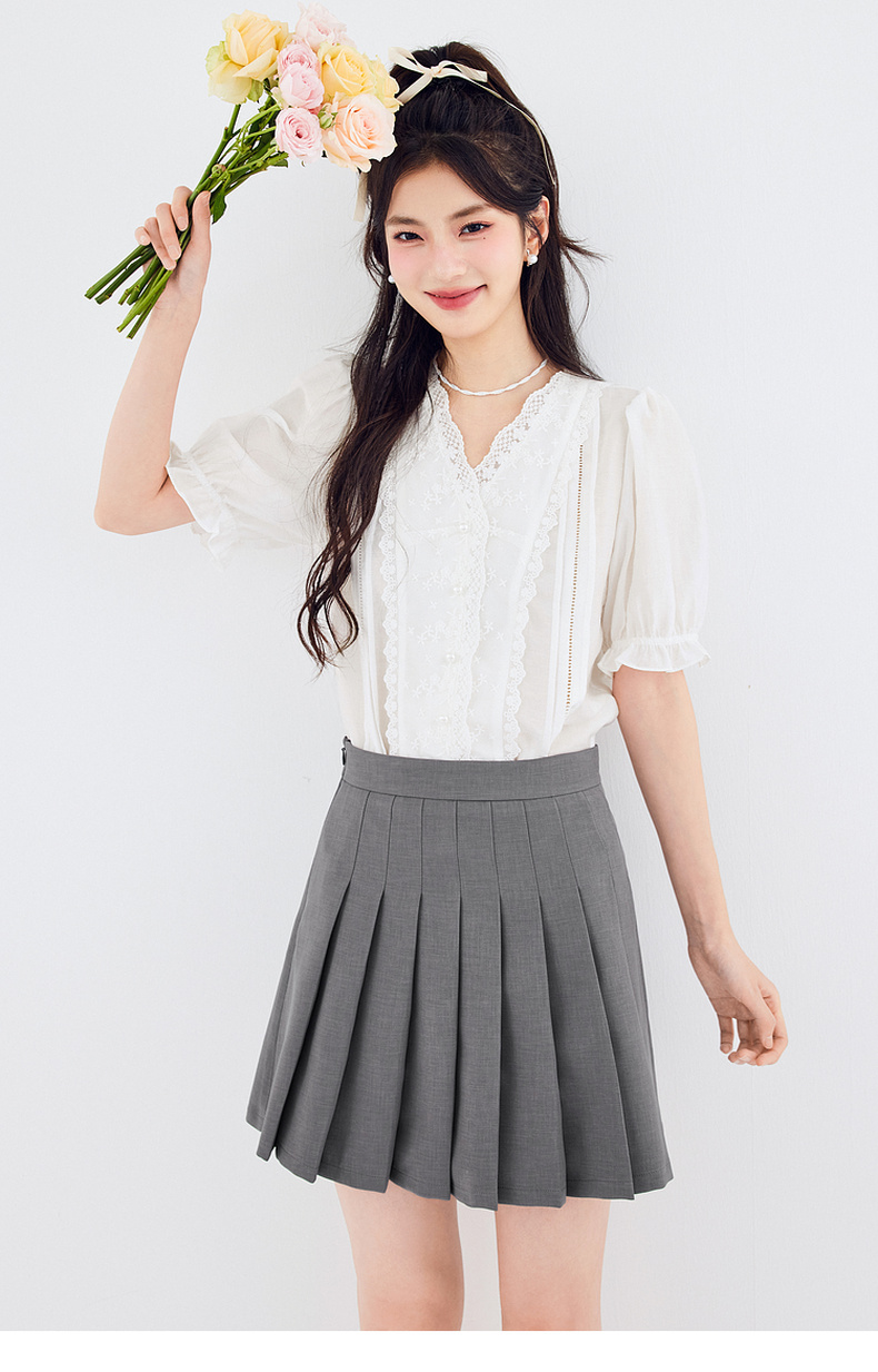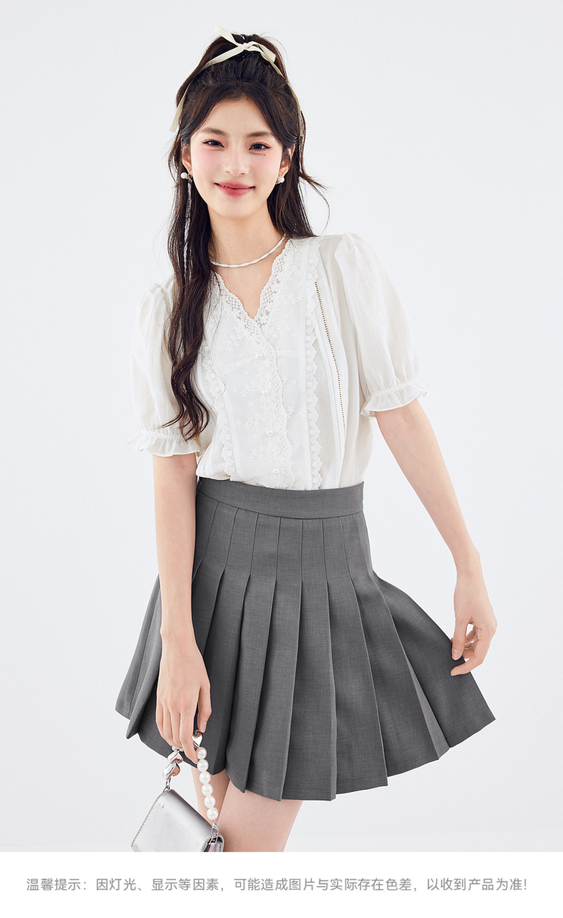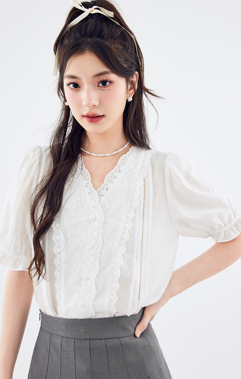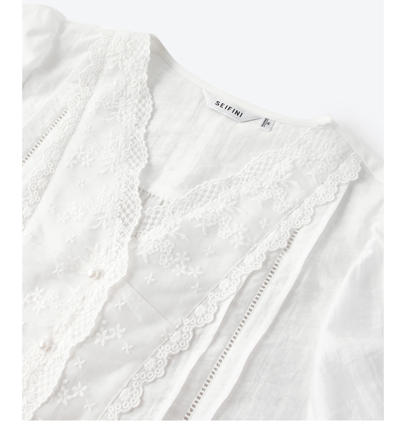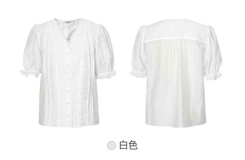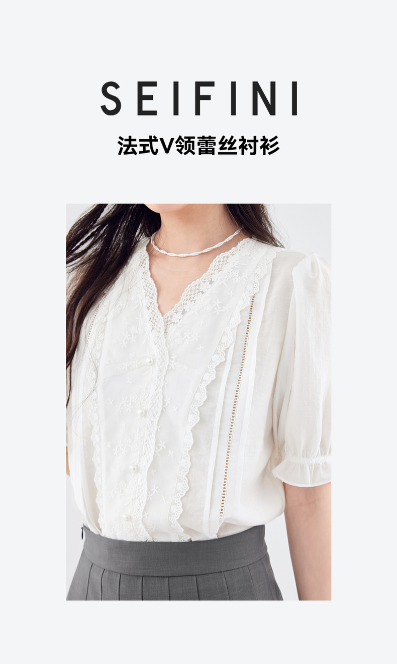 【严选】诗凡黎白色法式v领镂空蕾丝衬衫2024夏新款气质小衫流行漂亮衬衣SF5120801
