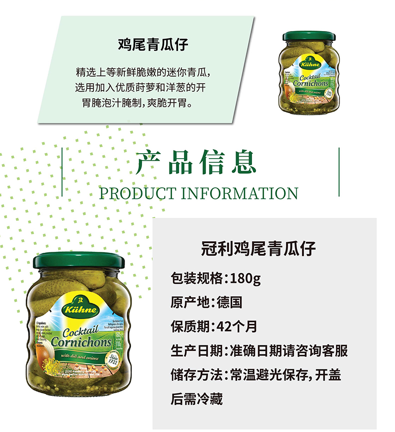 德国冠利鸡尾青瓜仔180g/030014 健康轻食汉堡配菜爽脆多汁