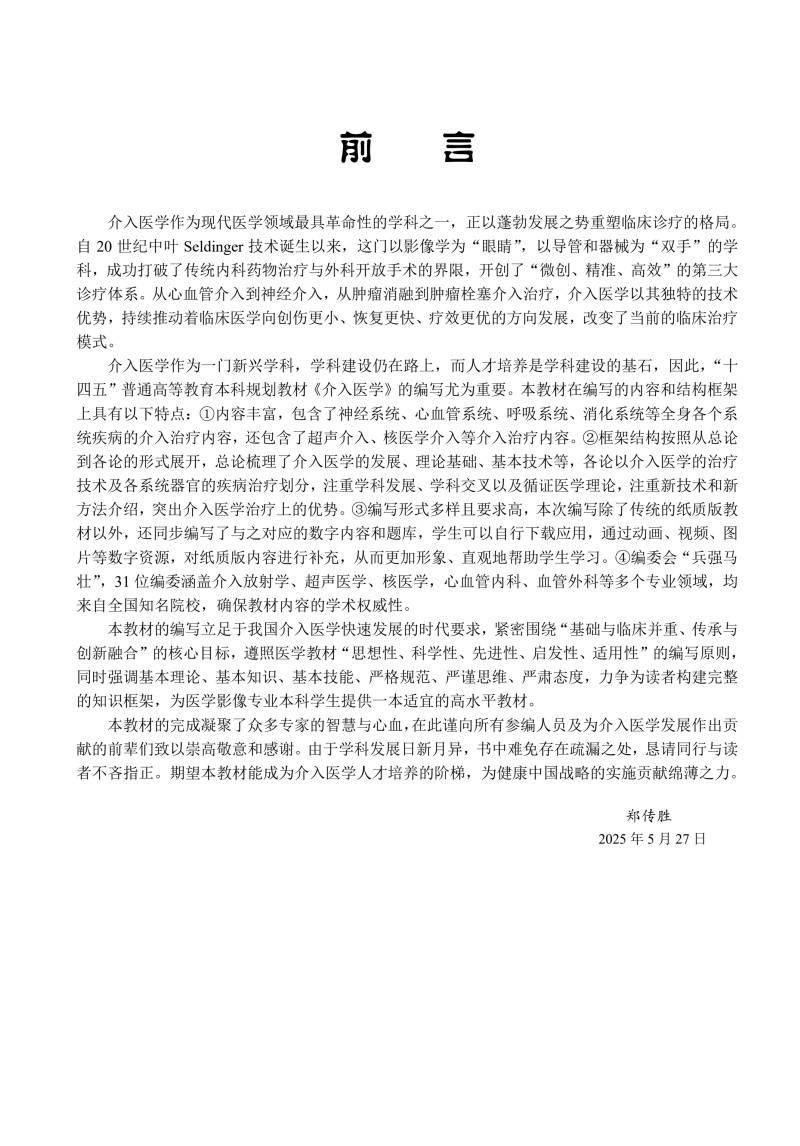 本教材是一部系统阐述介入医学专业理论知识与实践技能的综合性教材,旨在为医学本科生及临床医师提供权威、前沿的知识导航。本教材内容涵盖以下几个核心部分:①总论部分:深入剖析介入医学的基本概念、发展历程与优势,系统介绍介入医学常用设备、辐射防护、器械与药物等。②诊疗技术各论:按人体系统分章,详尽讲解各类介入技术的适应证、禁忌证、操作步骤、技术要点及并发症防治。其中血管介入诊疗涵盖了经皮血管成形术与支架植入术、经导管动脉栓塞术、主动脉瘤及夹层的腔内修复术、缺血性脑卒中的动脉取栓术、颅内动脉瘤栓塞术等。非血管介入涵盖了经皮穿刺引流术、肿瘤消融术、放射性粒子植入术、经皮椎体成形术等。本教材特色与优势:逻辑结构清晰,从基础到临床,构建了完整的知识框架。紧密结合国内外最新指南与临床共识,引入了大量真实临床病例和影像图片,图文并茂,注重培养解决实际问题的能力,同时强调并发症的预防与处理,贯穿以患者为中心的医疗安全和医学人文理念。