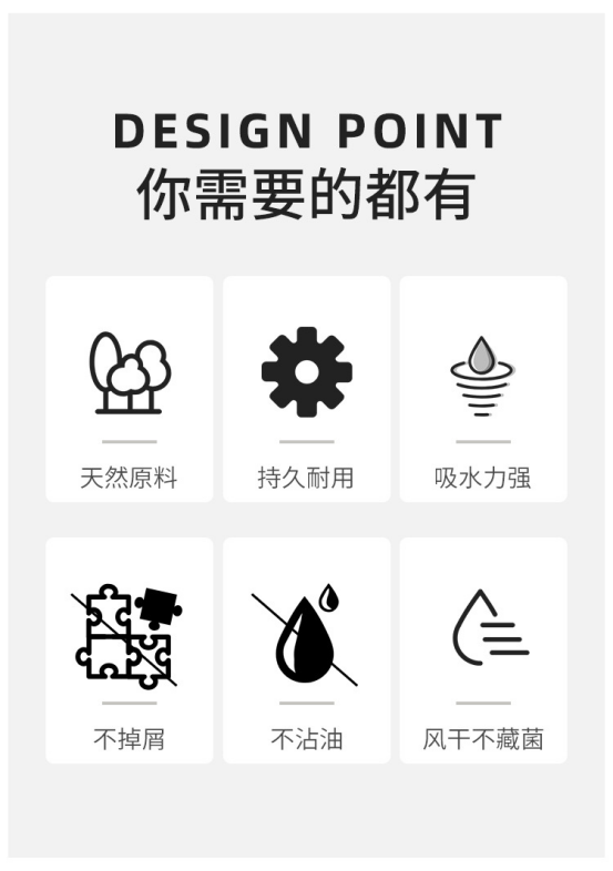 吸水后能够迅速膨胀并增加弹性 质地柔软,对皮肤无刺激,更呵护餐具 不会伤害餐具的涂层,不刺激皮肤 排水性强,快速风干,减少细菌滋生