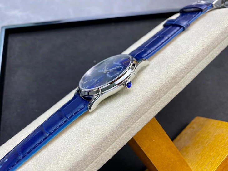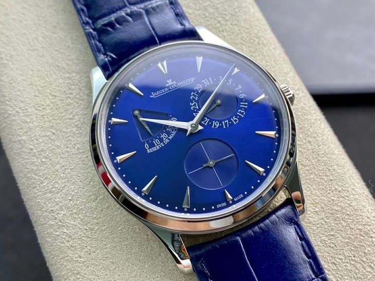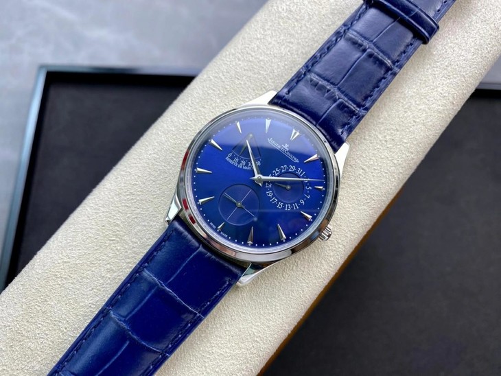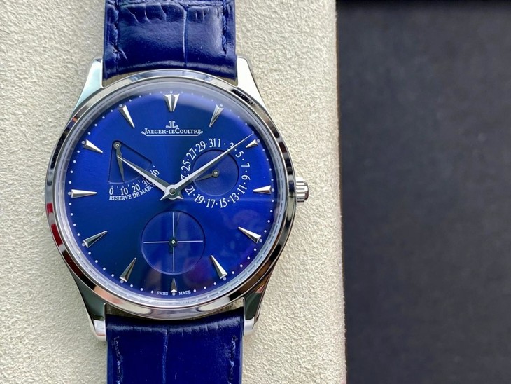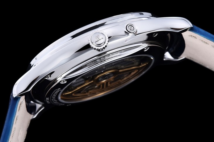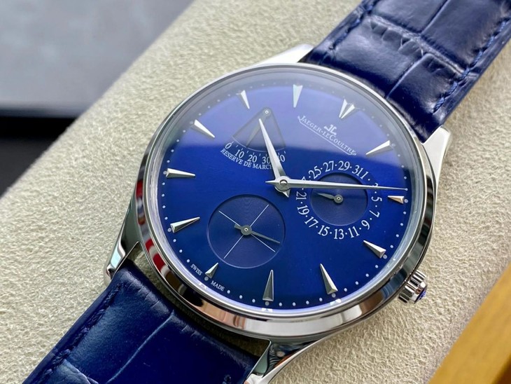 表扣:折叠扣【GF积家小丑】Master Ultra Thin Réserve de Marche超薄大师系列动力储存显示腕表将纯美线条与纤薄的精钢表壳完美融合,并搭载多项精妙的复杂功能,与优雅的表盘相得益彰,风格优雅大气,与男性手腕和谐搭配。