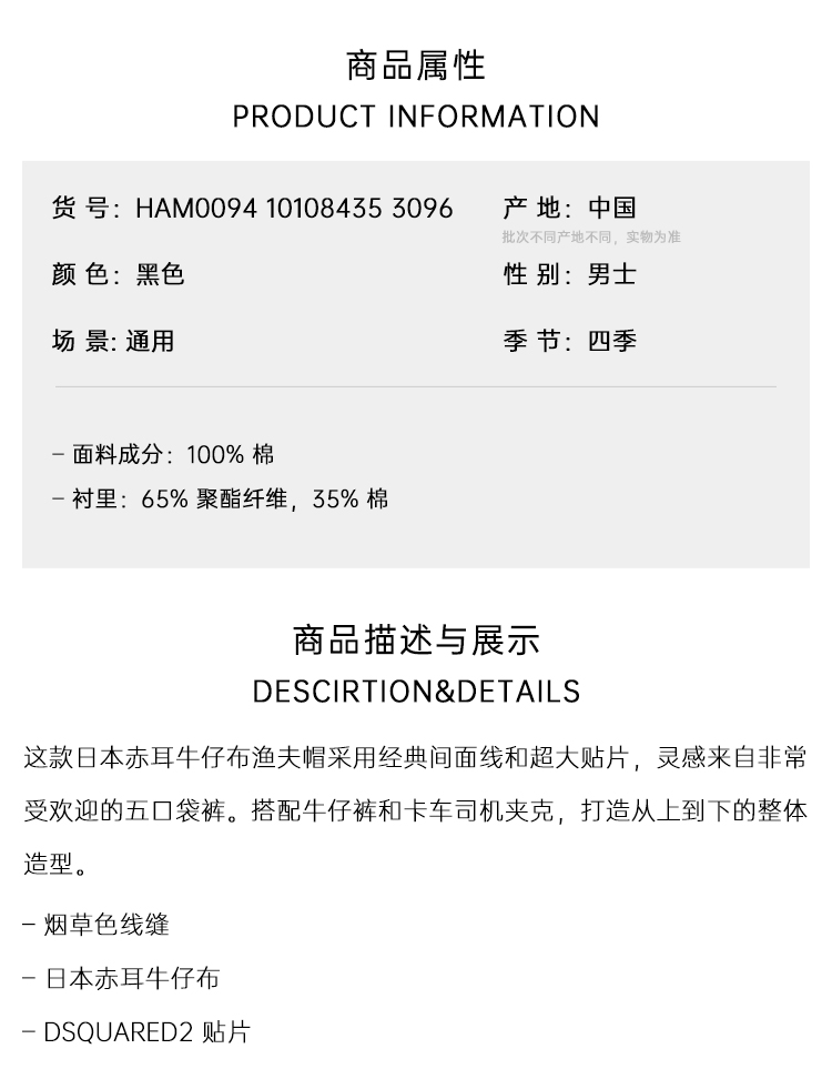 DSQUARED2 男士字母徽标贴片棉质渔夫帽 黑色 HAM0094 10108435 3096
