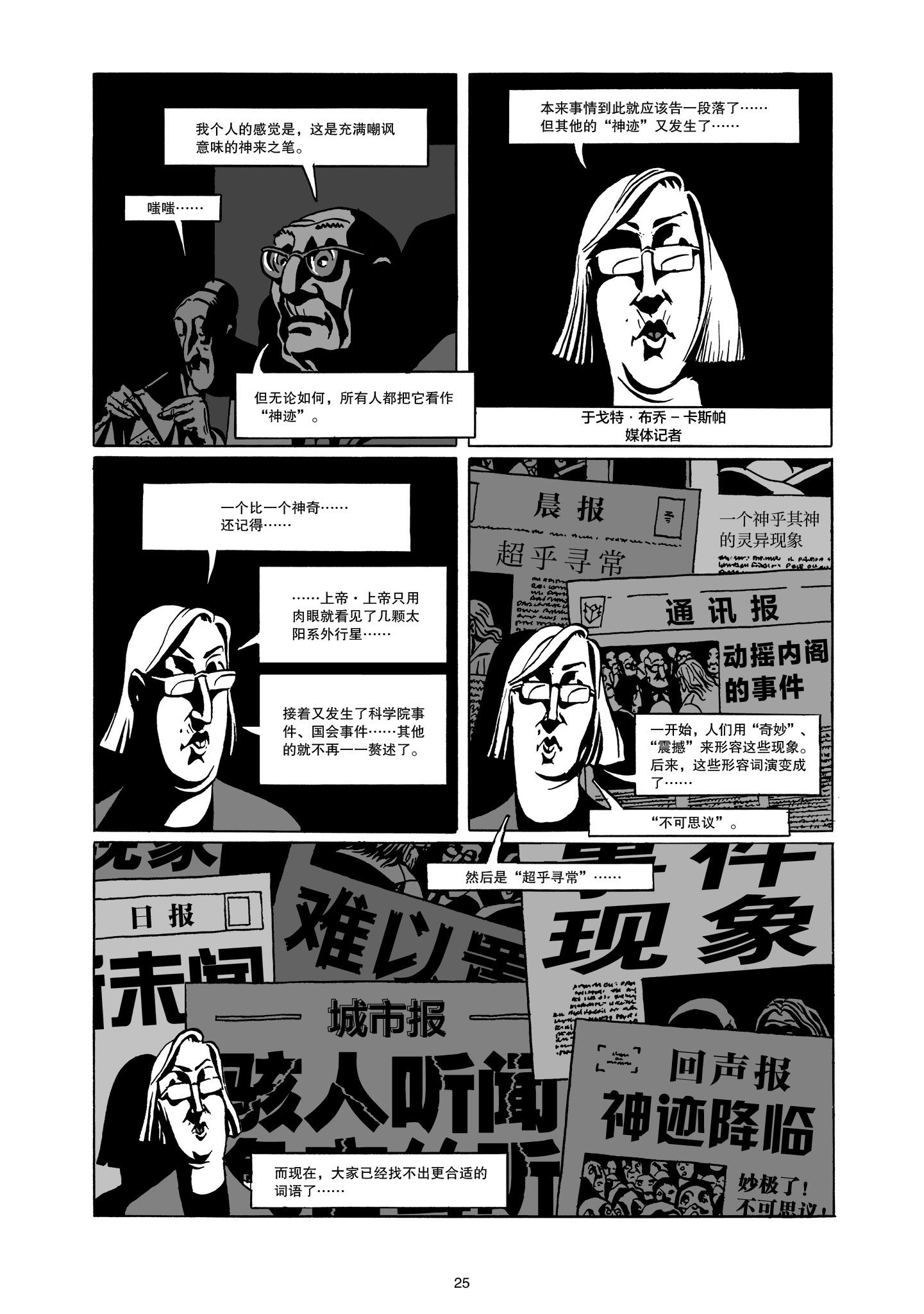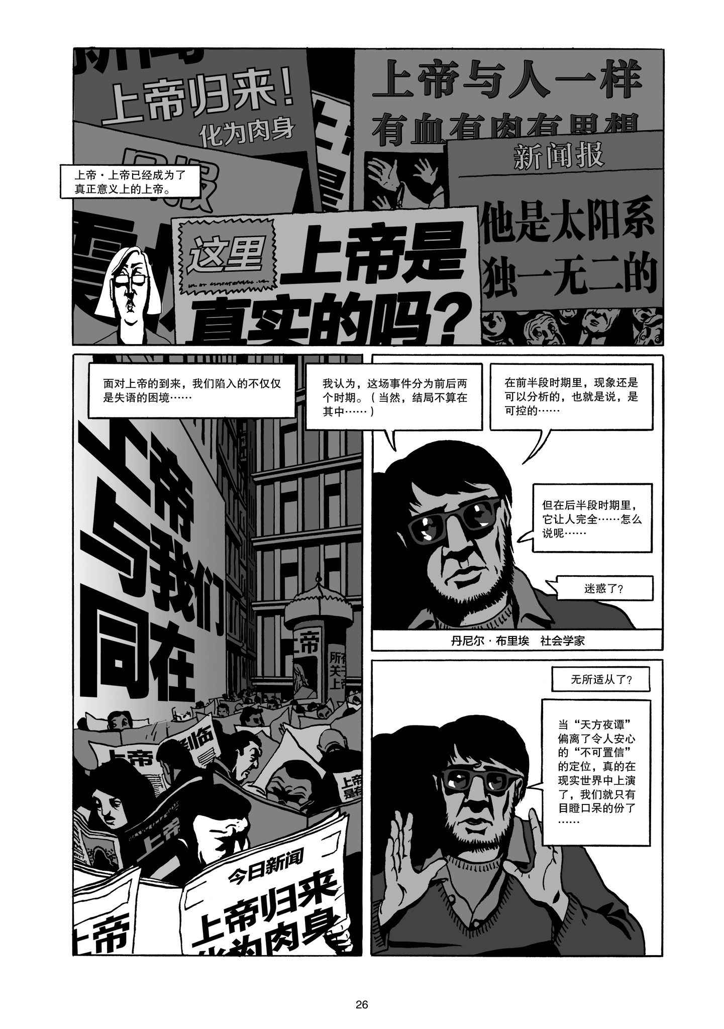 在极端的情境设置下,作者极尽讽刺之能事:出现在具体现实中的神秘存在引发了当代世界科学、经济、精神等力量一场接一场的玄虚。