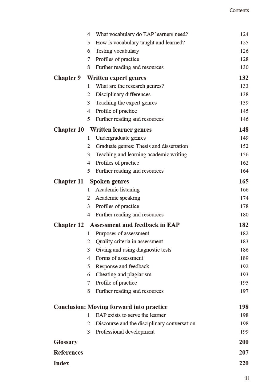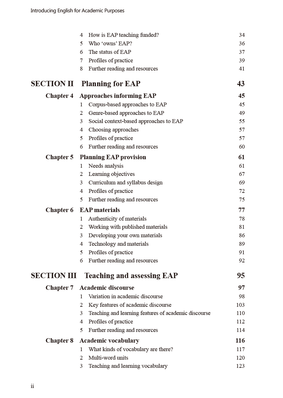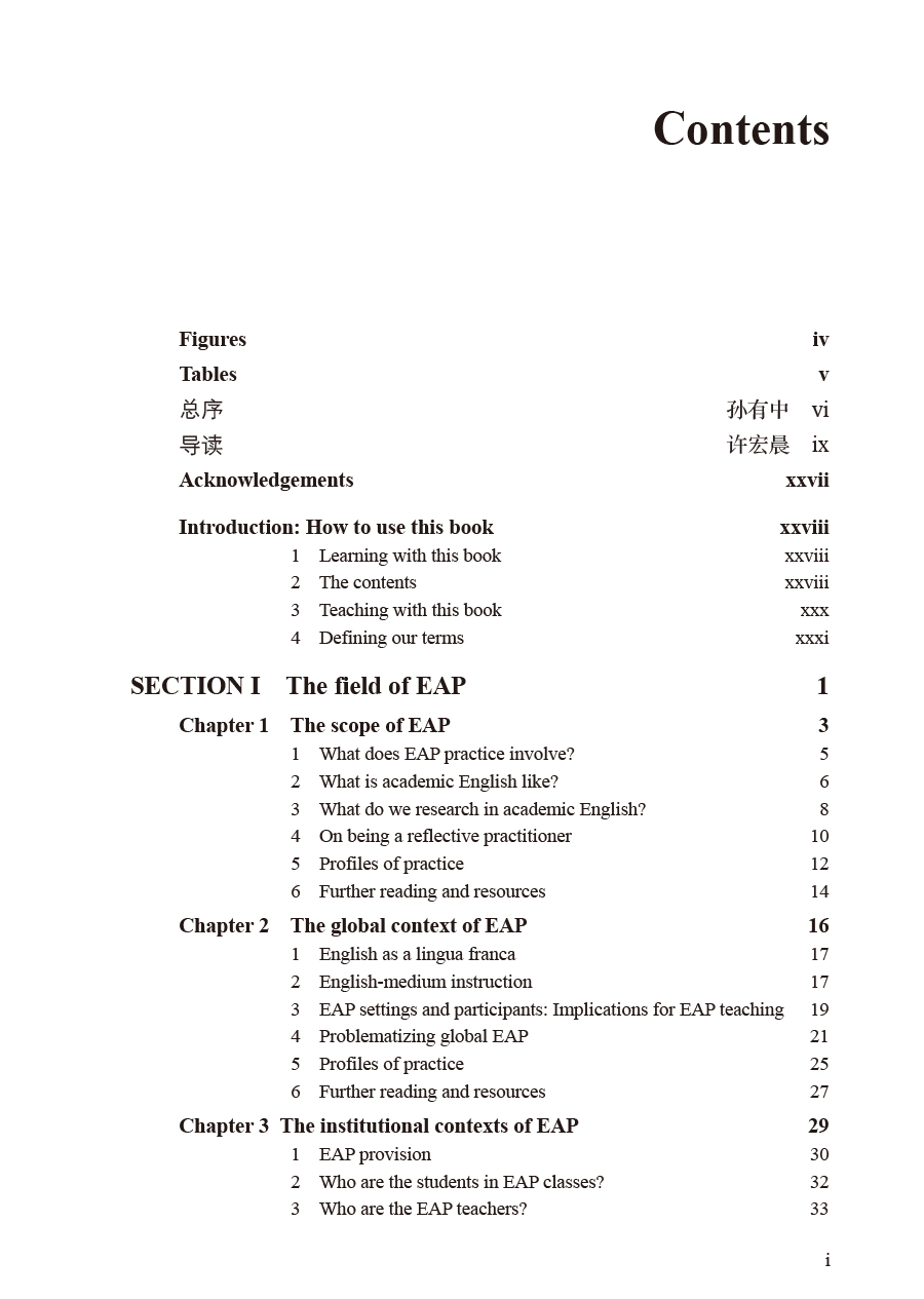 全书共12章,分为三部分。部分介绍学术英语这一领域的基本情况,包括学术英语的定义和研究范围、学术英语使用及教学的全球背景、学校教育视角下的学术英语。第二部分介绍学术英语课程规划,包括学术英语教学与研究方法、学术英语课程设计、学术英语教材选取与编写。第三部分结合教学实例,介绍学术英语的具体特点及其教学方法,以及测评手段,涉及学术英语话语特征、学术英语词汇、专家作者书面语体裁、学习者书面语体裁、学术英语口头体裁、学术英语测评与反馈。