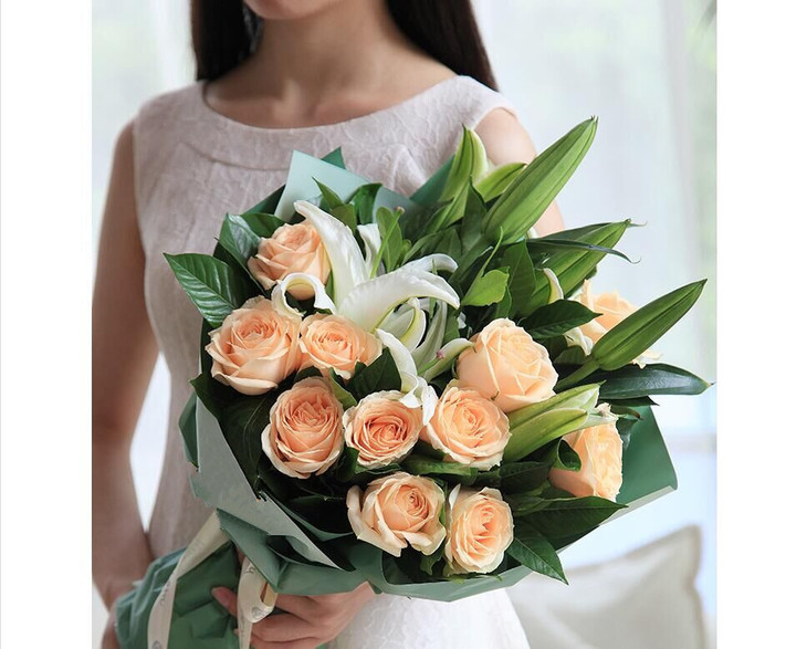 11枝香槟玫瑰,白百合2枝,栀子叶0.5扎