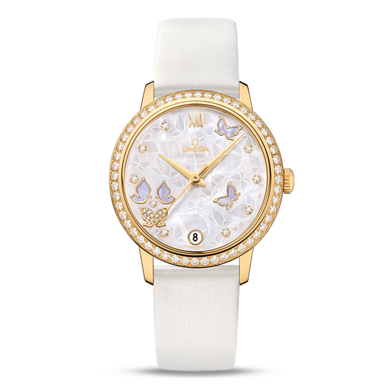 镜面材质 | 蓝宝石水晶玻璃 | 表盘 | 镶钻白色珍珠母贝表盘,蝴蝶图案 18K黄金镶钻表壳 日期显示 |
