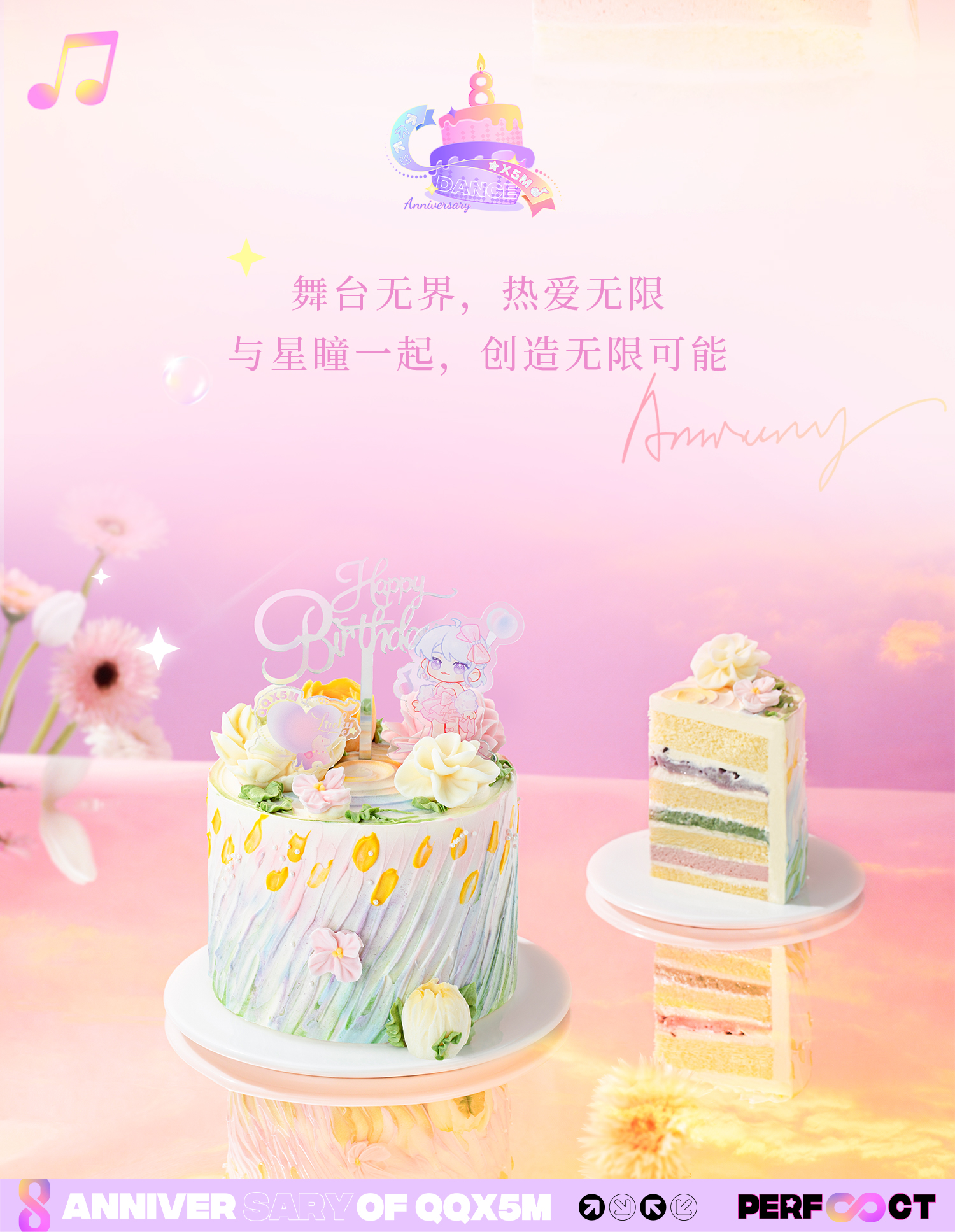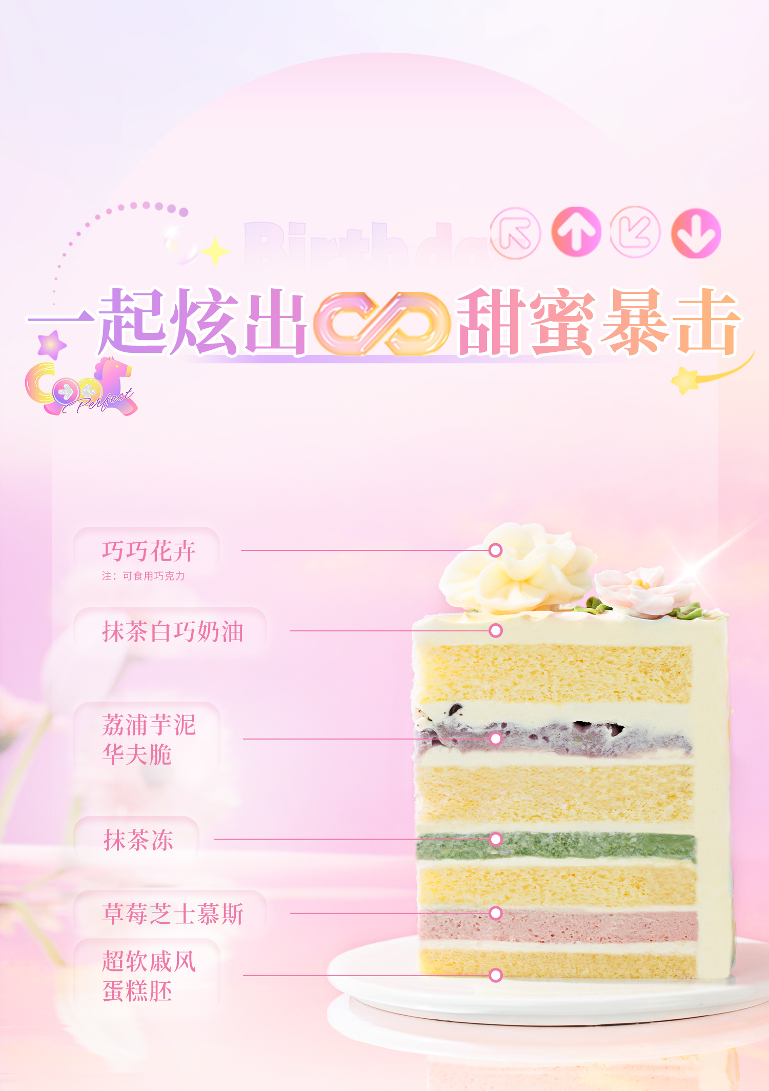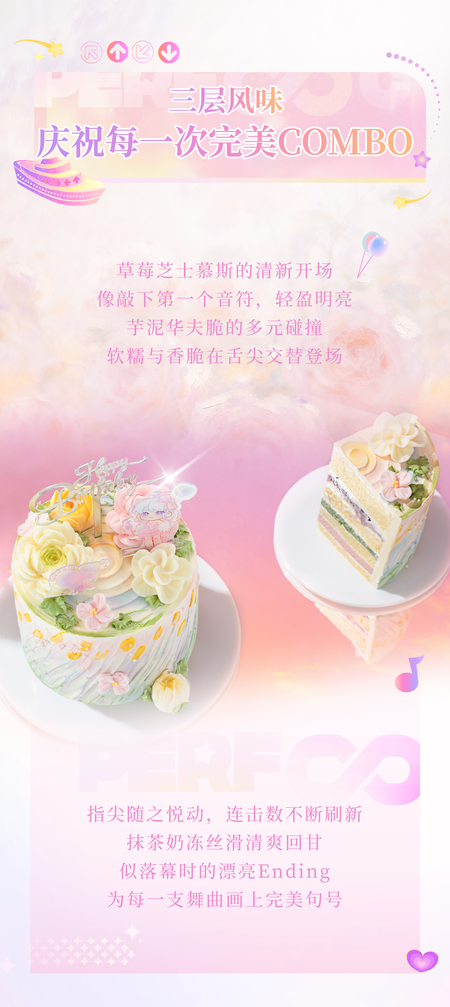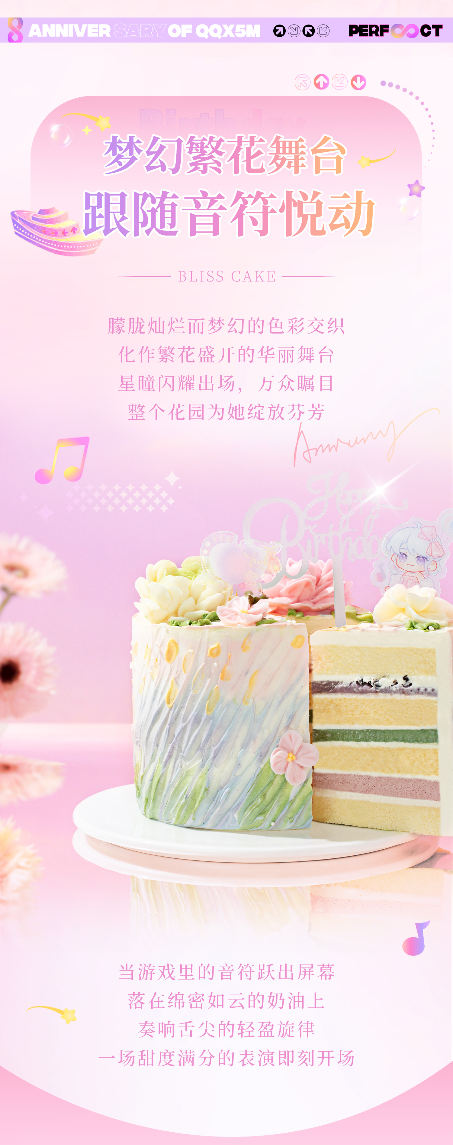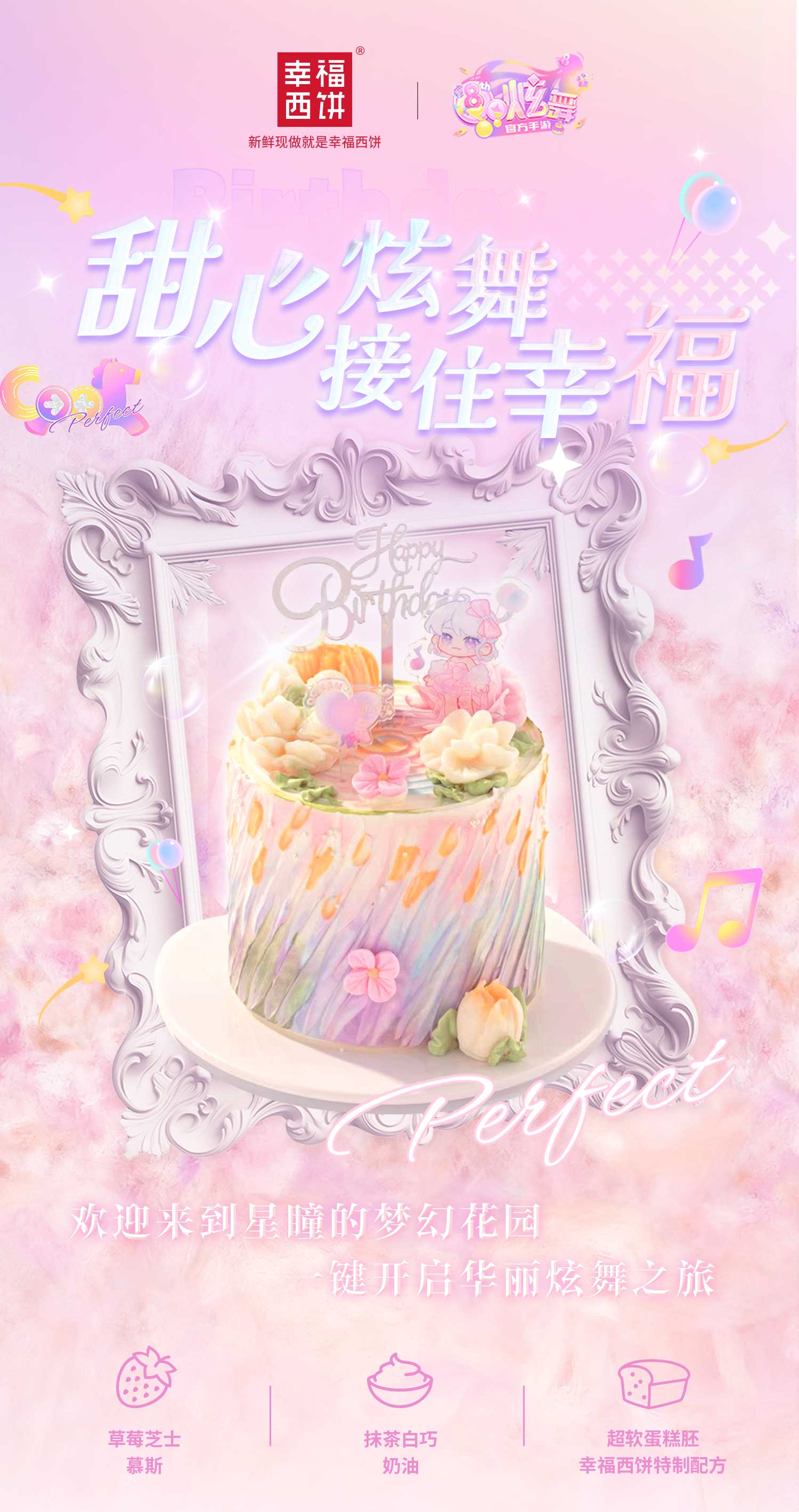 【甜心炫舞】QQ炫舞手游八周年联名款蛋糕,欢迎来到星瞳的梦幻花园,一键开启华丽炫舞之旅!草莓芝士慕斯+抹茶冻+芋泥华夫脆,三层风味庆祝每一次完美COMBO