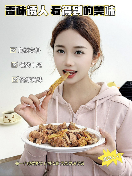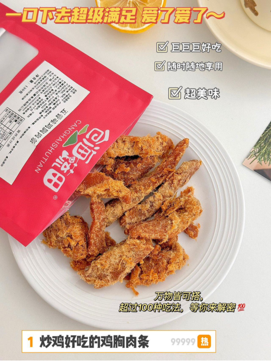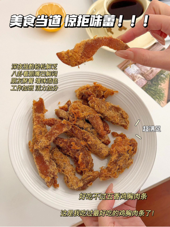 五香味 👀不仅仅健身党,根据中国膳食指南建议,成年人每天至少摄入60克蛋白质!! 👉而我们100g的鸡胸肉条的蛋白含量就高达50g,且容易被人体吸收并利用,上班追剧吃零食的同时,还能补充蛋白质,绝了‼️